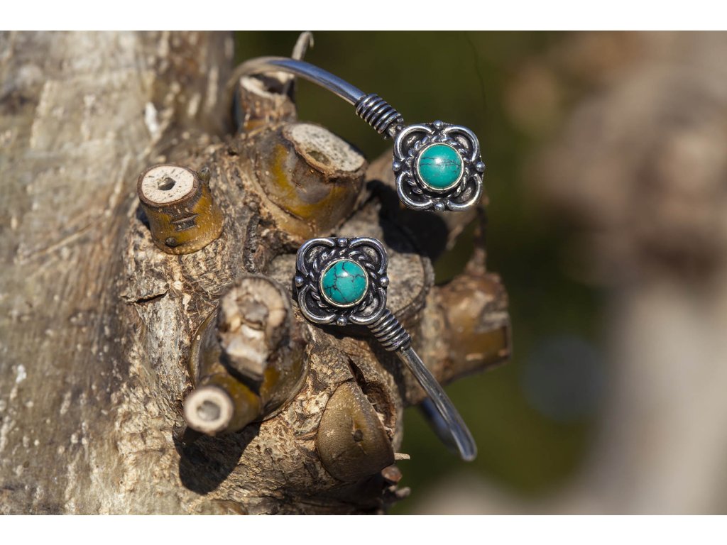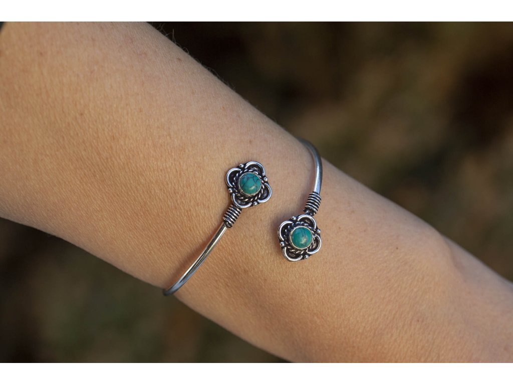 Náramek kytičky s drahokamy Krásný náramek z bílého kovu ve stříbrné barvě se dvěma kameny v kytičkovém ornamentu. Na výběr je fialový ametyst a zelený tyrkys. Ametyst je kamenem čistoty ducha a meditace. Pomáhá nám v sobě objevovat sebeobětování, lásku, pokoru a nezištnost. Těmito vlastnostmi nám otevírá cestu do jiných dimenzí bytí. Je to kámen inspirace, směřuje naše myšlení k tvořivé práci a probouzí v nás intuici. Tyrkys slouží jeho nositeli k tříbení a vyjadřování vlastních myšlenek, zesiluje intuici, vyrovnanost, podporuje úspěch. Také chrání auru a pohlcuje škodlivé vlivy a zahání zlé sny. Posiluje pozitivní energii. Ve vztahové rovině přináší štěstí a klid.Buďte první, kdo napíše příspěvek k této položce.