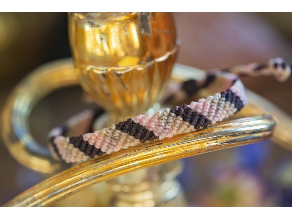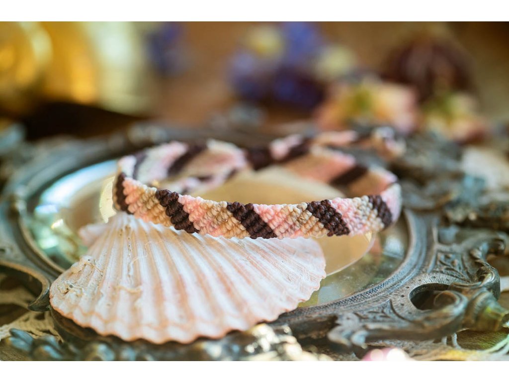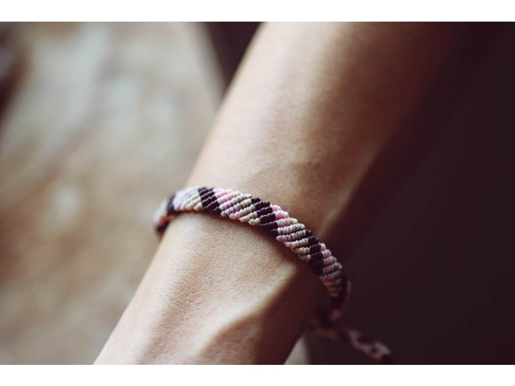 Náramek macramé pásek Tento jednoduchý náramek - pásek, vyrobený technikou drhání macramé - je krásný moderní doplněk, ručně vyrovený z tří krásně ladících tónů macramé šňůrek - hnědou, béžovou a růžovou. Určený je spíše pro jemné ženské zápěstí, avšak jeho velikost je snadno nastavitená pomocí macramé zámečku, jednoduše utáhnete a náramek drží.Doplňkové parametry