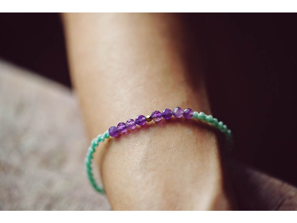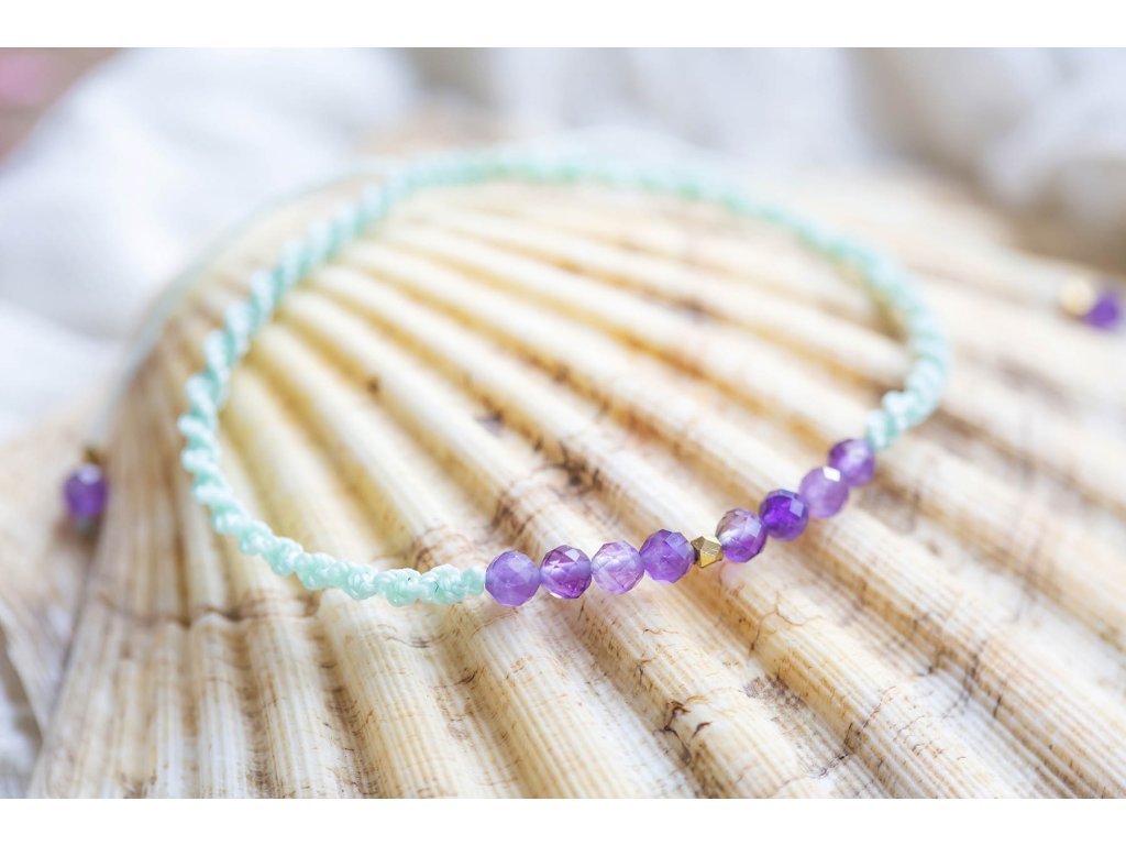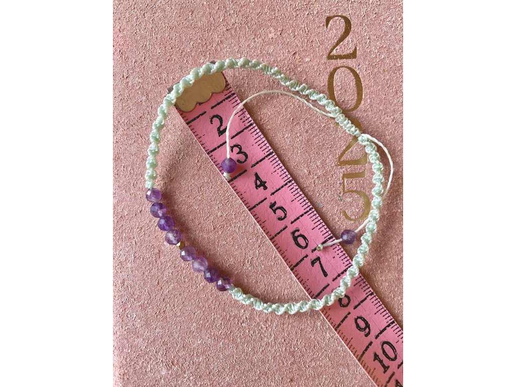 Náramek makramé s ametystem Tento jemný drobný elegantní náramek makramé s ametystem vyniká krásnou a zajímavou barevnou kombinací mentolové zelené v podobě mikro makramé šňůrky ručně drhané do tvaru šroubovice a jasně fialové v podobě drobounkých broušených ametystů. Velikost náramku je nastavitelná, tento jediný kousek je však vhodnější spíše pro silnější zápěstí.Doplňkové parametry