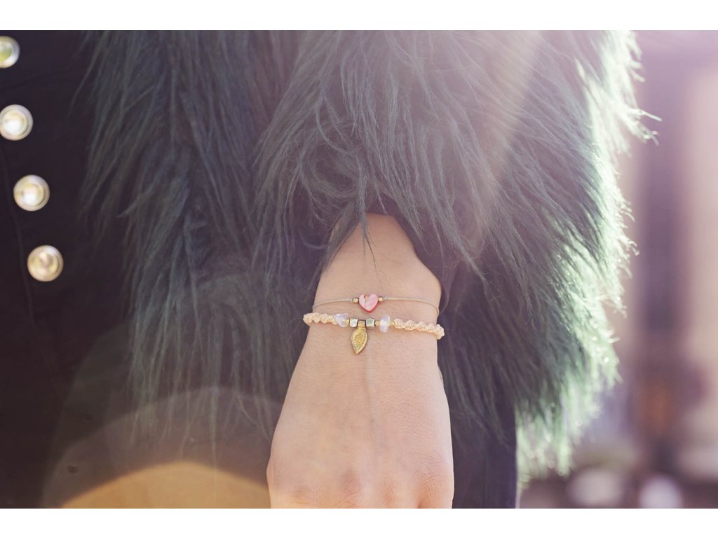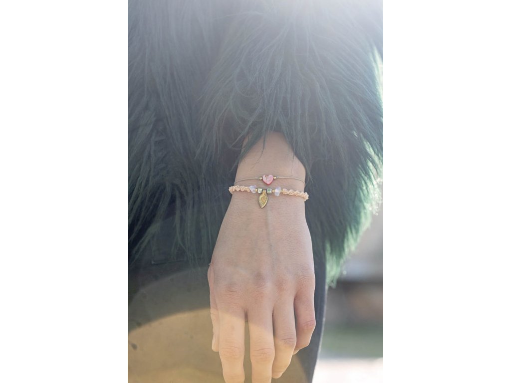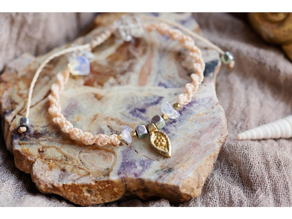Náramek Mar Náramek dostal jméno Mar, což je španělský výraz pro moře. Obsahuje povrchově upravené kostičky hematitu, které mají matně duhové odlesky, sekané nepravidelné korálky namodralého opalitu a mosazný dekorativní přívěsek z Indie. Šňůrka macramé je drhaná do tvaru šroubovice a její barva je elegantní světle béžová.Doplňkové parametry