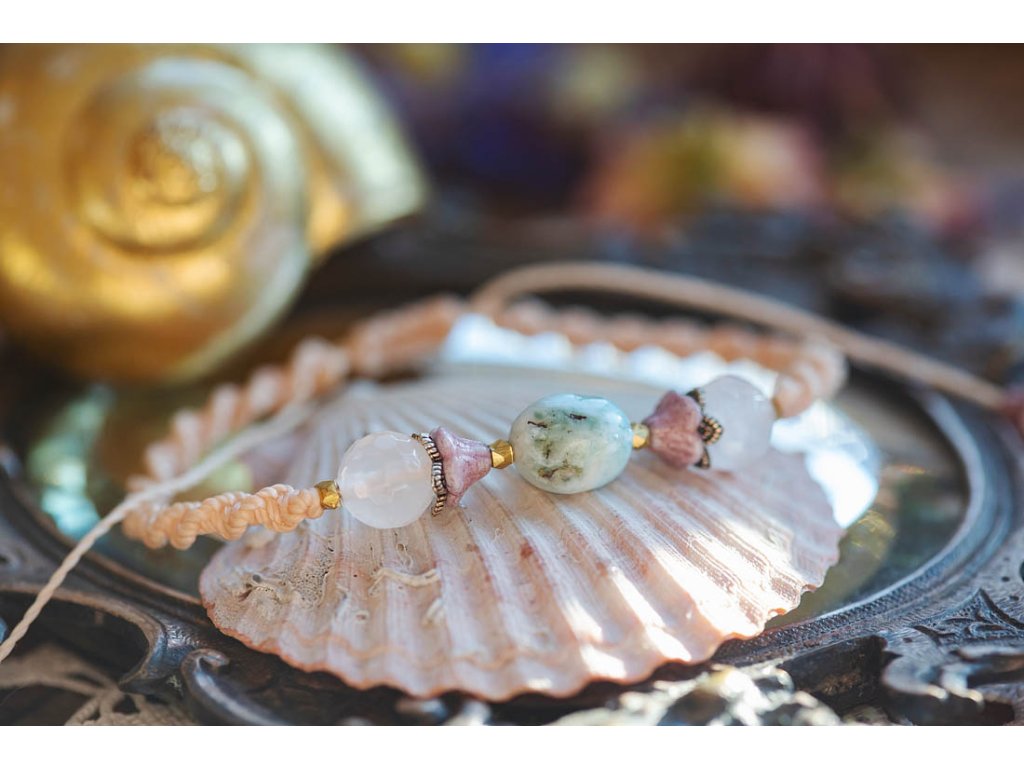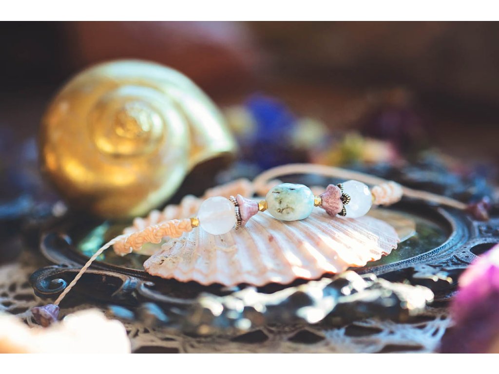 Náramek Mořská láska: Letní kousek s duchem oceánu Hledáte krásný a jedinečný náramek, který ve vás probudí letní náladu a připomene vám krásu moře? Pak je náramek Mořská láska tou pravou volbou pro vás! Tento náramek je vyroben e světlého macramé ve tvaru dvoušroubovice a ozdoben úchvatnými drahokamy: Larimar - kámen moře: Podporuje klid, mír a harmonii. Symbolizuje mořskou energii a pomáhá spojit se s duchem oceánu. Růženín: Podporuje lásku, sebevědomí a štěstí. Růženíny je kámen lásky a ženskosti a dodává náramku něžný a romantický nádech. Korálky od českých sklářů: Dodávají náramku krásu a originalitu. Korálky vyrobené českými skláři se pyšní vysokou kvalitou a jedinečným designem. Dvoušroubovice je starobylý symbol, který se používá k ochraně a harmonizaci energie. Náramek Mořská láska je: Ručně vyrobený s láskou a péčí Dodávaný v dárkovém balení Perfektní dárek pro sebe i pro milovnice šperků, drahokamů a moře Symbol krásy, harmonie, ochrany a spojení s duchem oceánu Nastavitelný pomocí macramé zámečku Tip: Náramek Mořská láska se skvěle hodí k letnímu oblečení, jako jsou šaty, sandály a klobouky. Můžete ho ale nosit i k džínům a tričku pro dodání bohémského nádechu vašemu outfitu. Proč si vybrat náramek Mořská láska? Podporujete ruční práci a lokální řemeslo. Vlastníte originální a jedinečný kousek, který nikdo jiný nemá. Nosíte šperk s hlubokou symbolikou a duchovním významem. Kupujete si dárek vyrobený s láskou a péčí. Ozdobte se náramkem Mořská láska a nechte se unášet krásou a energií moře!Doplňkové parametry