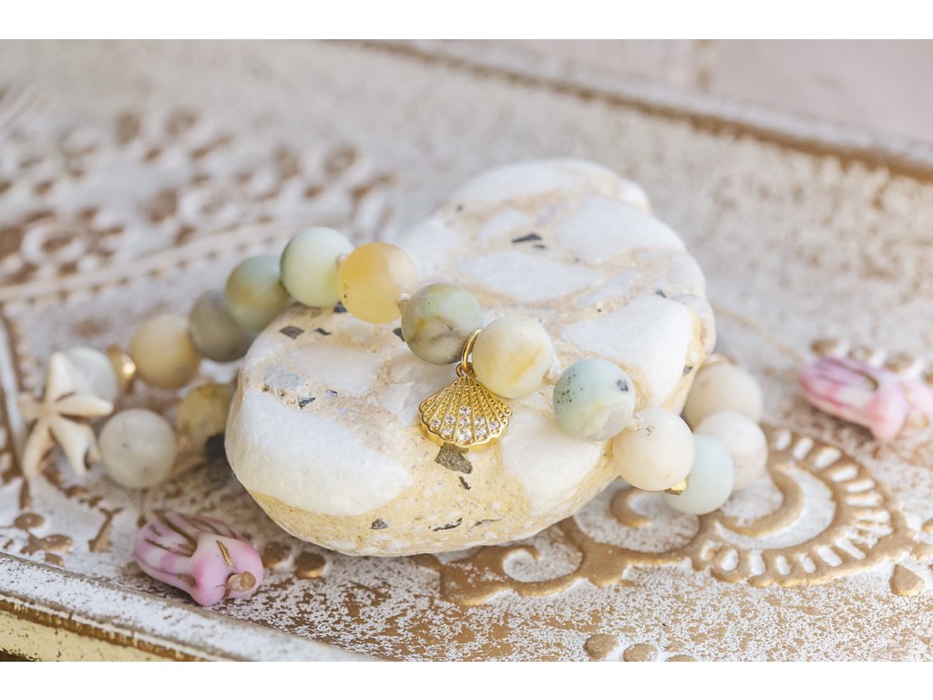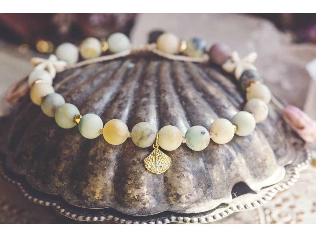 Náramek na nohu Ariel Tenhle vznikl díky inspiraci mé kamarádky Ivanky. Jednou se mne Ivanka zeptala, zda nechci zkusit vytvořit také "celokorálkové" náramky na nohu a mne její nápad hned zaujal. A protože miluju navlékání a uzlíkování, což si užívám u tvorby mál, první model - náramek na nohu Ariel - na sebe nenechal dlouho čekat. Použila jsem rovnou osmičkové (8mm) amazonity (proč troškařit, první model má být vždy velkorysý) a nakombinovala je se zlatými hematity, akrylovými hvězdicemi a nerezovou mušličkou s rozkošnými malými zirkony, které se na slunci třpytí jak kapky mořské vody. Na koncích zavázání jsou růžové tulipánky od českých sklářů, moje snad nejoblíbenější korálky od Rutkovských.Doplňkové parametry