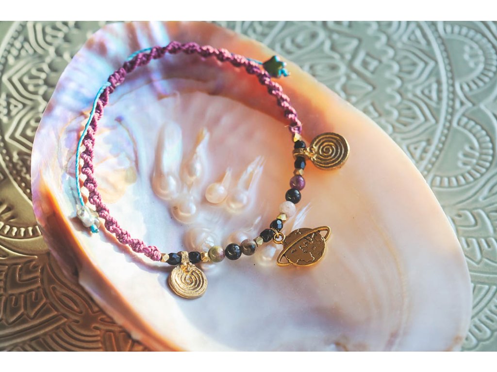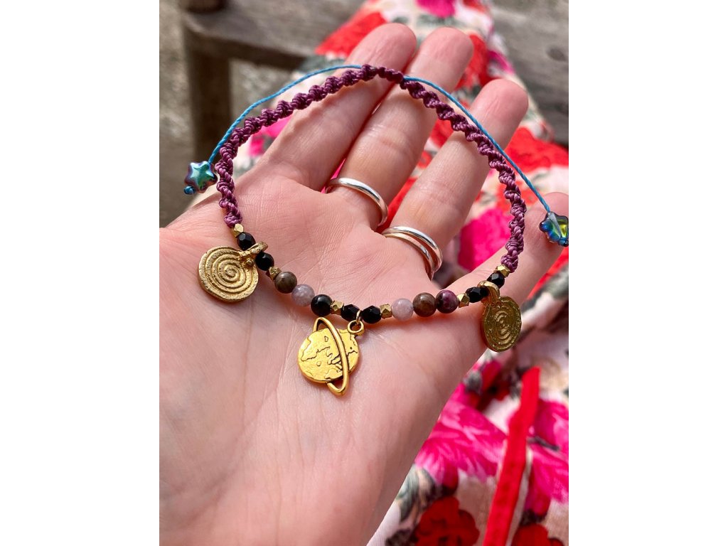 Náramek na nohu Cestovatelka Jak překrásná je naše planeta a jak vzrušující je ji prozkoumávat. Dominantou náramku je mosazný symbol planety, který je doplněný symboly spirál, acháty a skleněnými korálky od českých sklářů. Dvoušroubovice DNA z fialového macramé má tyrkysovou duši. Je to překrásný dárek pro ženu Cestovatelku. Velikost je nastavitelná pomocí macramé zámečku. Achát podporuje vnitřní stabilitu, vyrovnanost a zralost, pocit bezpečí a sebevědomí. Usnadňuje třídění myšlenek, napomáhá při řešení komplikovaných úkolů. Ve vztazích podporuje věrnost a chápavost. Upevňuje rodinná a přátelská pouta.Buďte první, kdo napíše příspěvek k této položce.