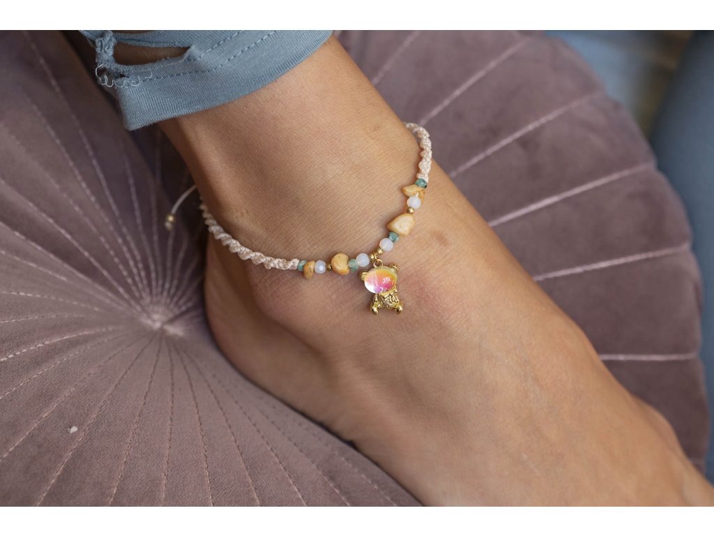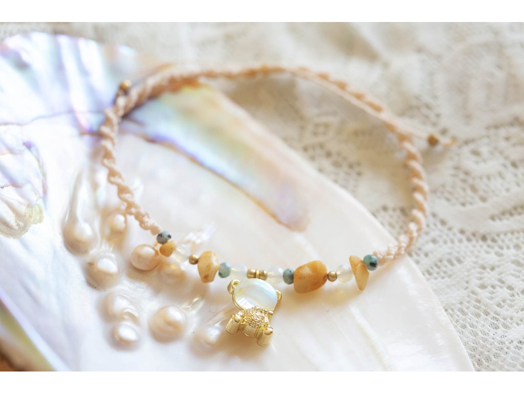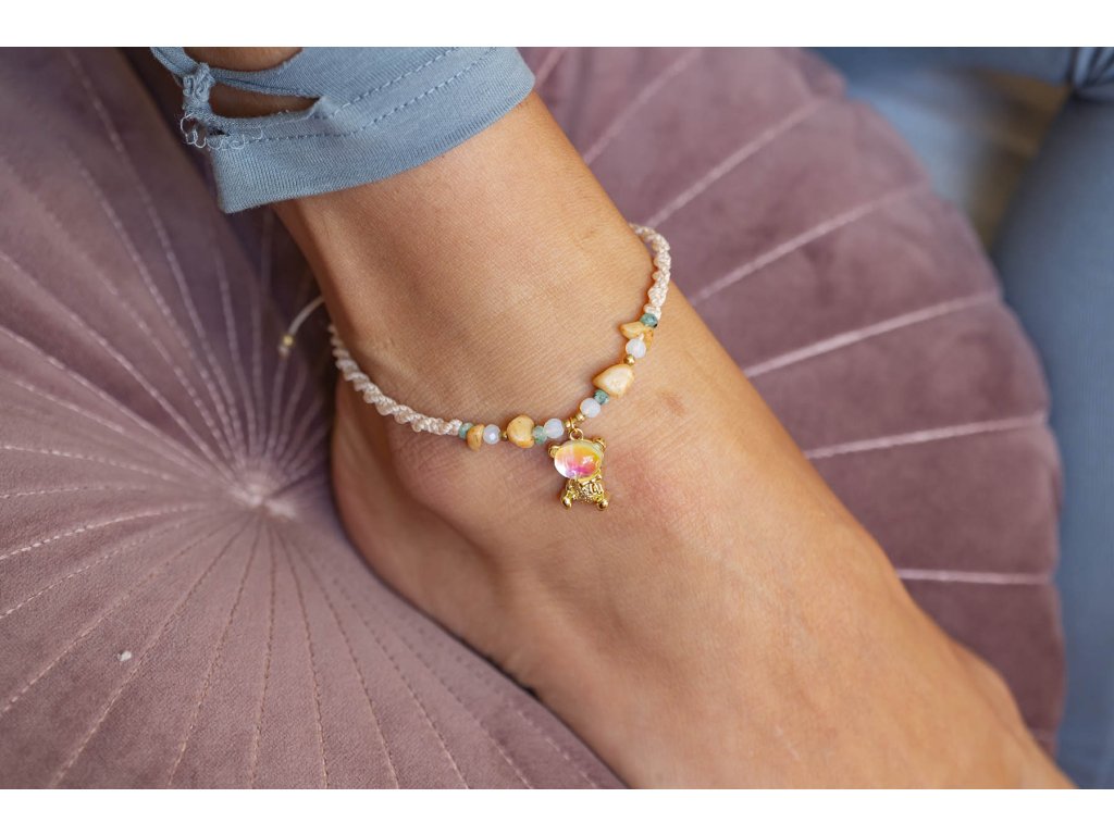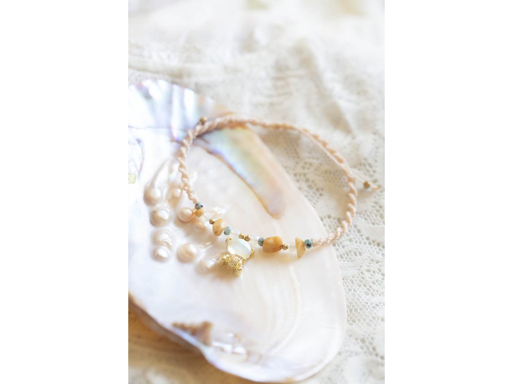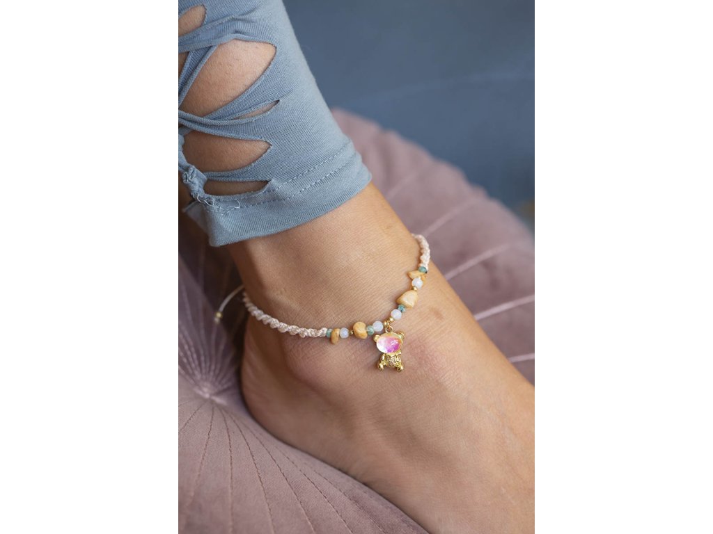 Náramek na nohu kosmický medvídek Návštěva mimozemského medvídka poctila náš obchůdek a dovolila nám podniknout výpravu za inspirací. Vznikl tento okouzlující náramek na nohu s jadeitem a křemenem tónovaným do teplé béžové v kontrastu s chladivým opalitem, který v přítomnosti duhové hlavy kosmického medvídka bude zářit. Vše je na dvoušroubovici DNA ze světlého macramé. Velikost nastavitelná pomocí macramé zámečku.Doplňkové parametry