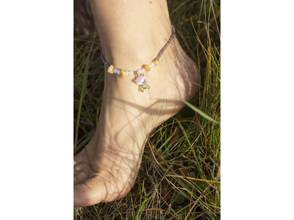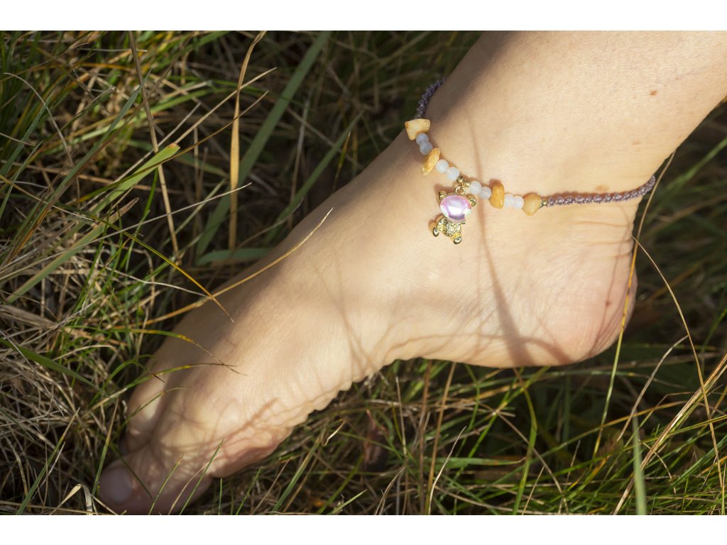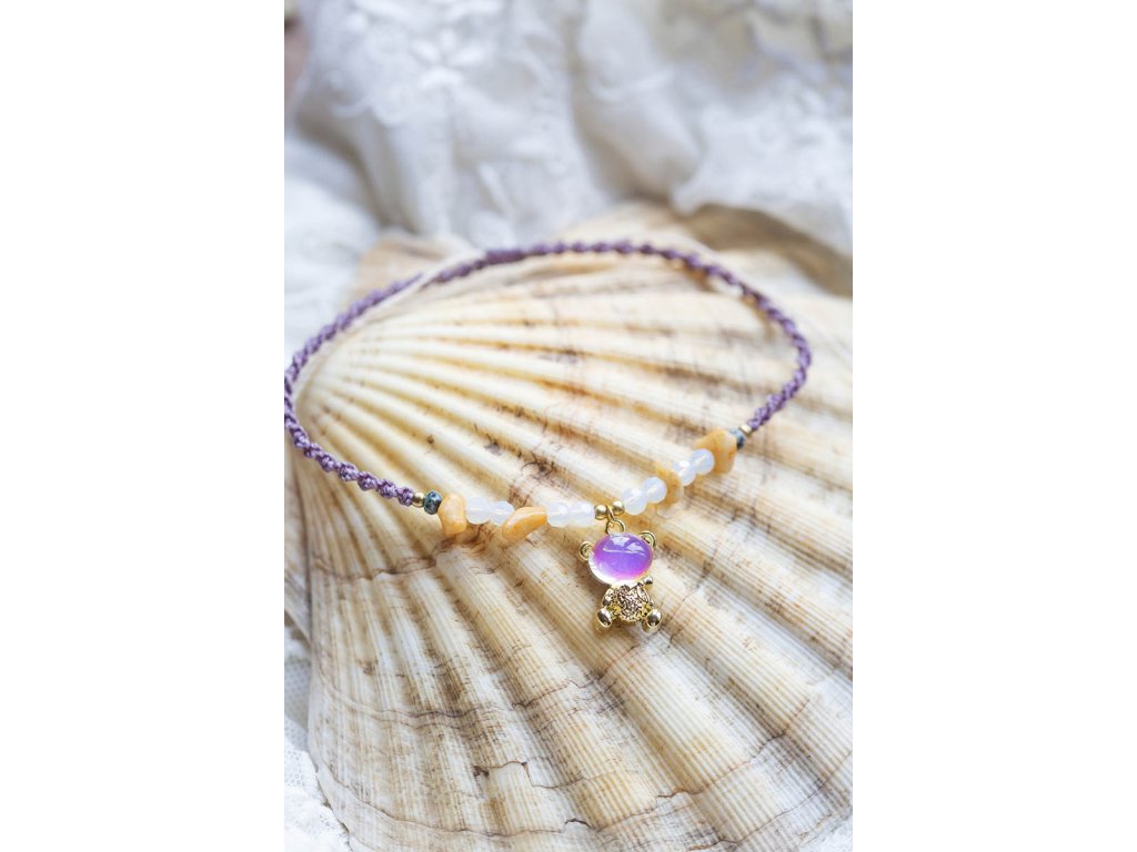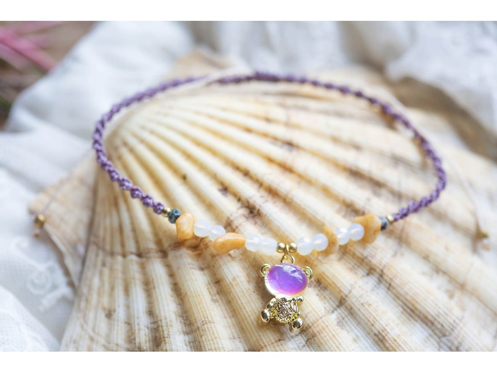 Náramek na nohu Kosmoméďa Kosmomedvídek potřetí! Náramek na nohu Kosmoméďa s krásnou mikro macramé šňůrkou v magické matně fialové barvě, sdrhanou do šroubovice DNA a s rozkošnými fasetovanými opality, přírodním křemenem a zelenkavým fasetovaným jadeitem...ruční práce za zvuku a zpěvu kosmomanter pro vaši radost a povznesení. Jadeit je ochranný kámen, jenž vnáší do života harmonii. Je symbolem klidu a míru. Přitahuje štěstí, přátelství a peníze. Chrání nás před neštěstím a nehodami. Uklidňuje mysli a pozvedá moudrost ducha. Je skvělý při obchodních jednáních. Podporuje kouzlo osobnosti, empatii, neúnavnost a usnadňuje mezilidskou komunikaci. Stimuluje k práci, podporuje realizaci nápadů, sebevědomí, sebejistotu, sebedůvěru a samostatnost. Na cestách chrání před nebezpečím a nemocemi. Prodlužuje život. Velikost nastavitelná pomocí macramé zámečkuDoplňkové parametry