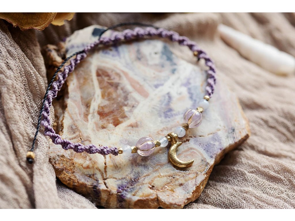 Náramek na nohu Lunita Náramek z tlumeně fialového makramé je pojmenový Lunita, což v překladu znamená měsíc nebo luna zdrobněle, takže třeba měsíček, nebo lunička. Název dostal po svém přívěsku z mosazi. Tato komponenta dovezená z Indie je doplněná drobnými korálky přírodního měsíčního kamene a melounkovými korálky od českých sklářů. Náramek na kotník se snadno nasazuje, krásně drží na noze díky makramé zámečku, který se přizpůsobí velikosti kotníku a má dlouho trvanlivost a to i když se ráda brouzdáte vlnkami v moři.Doplňkové parametry
