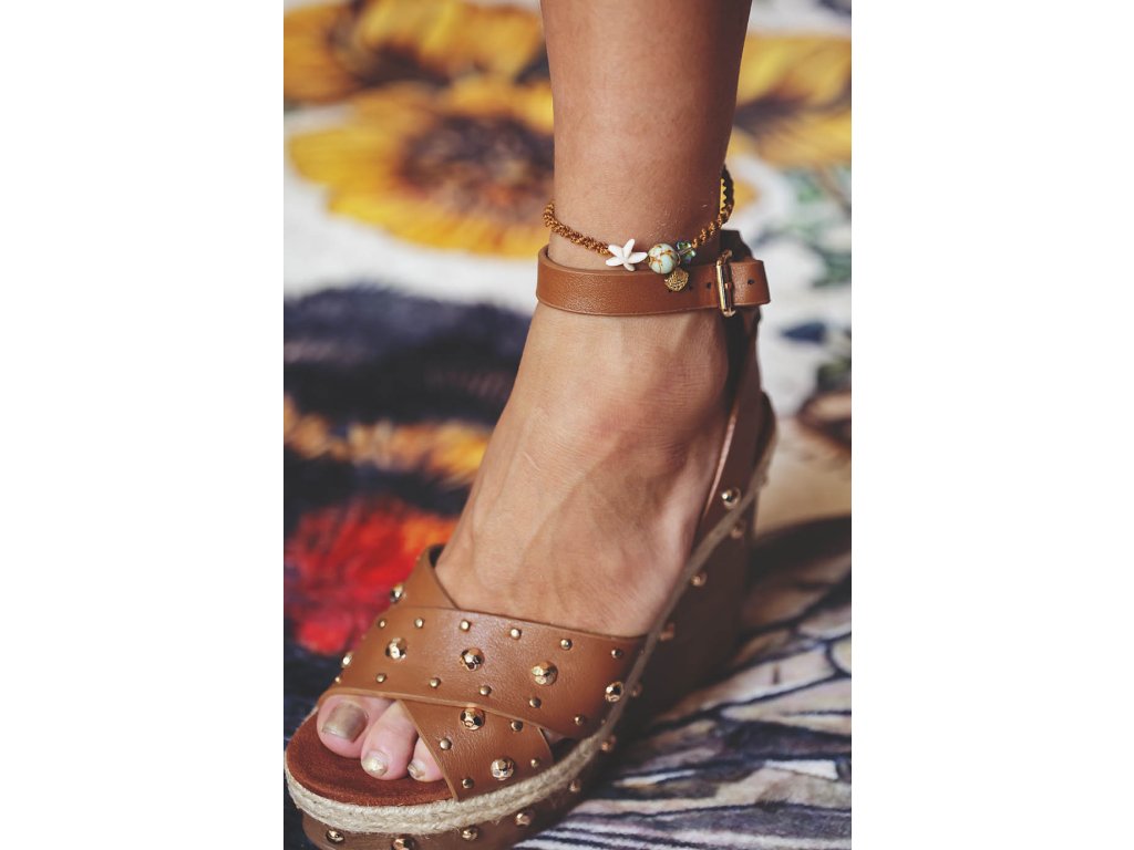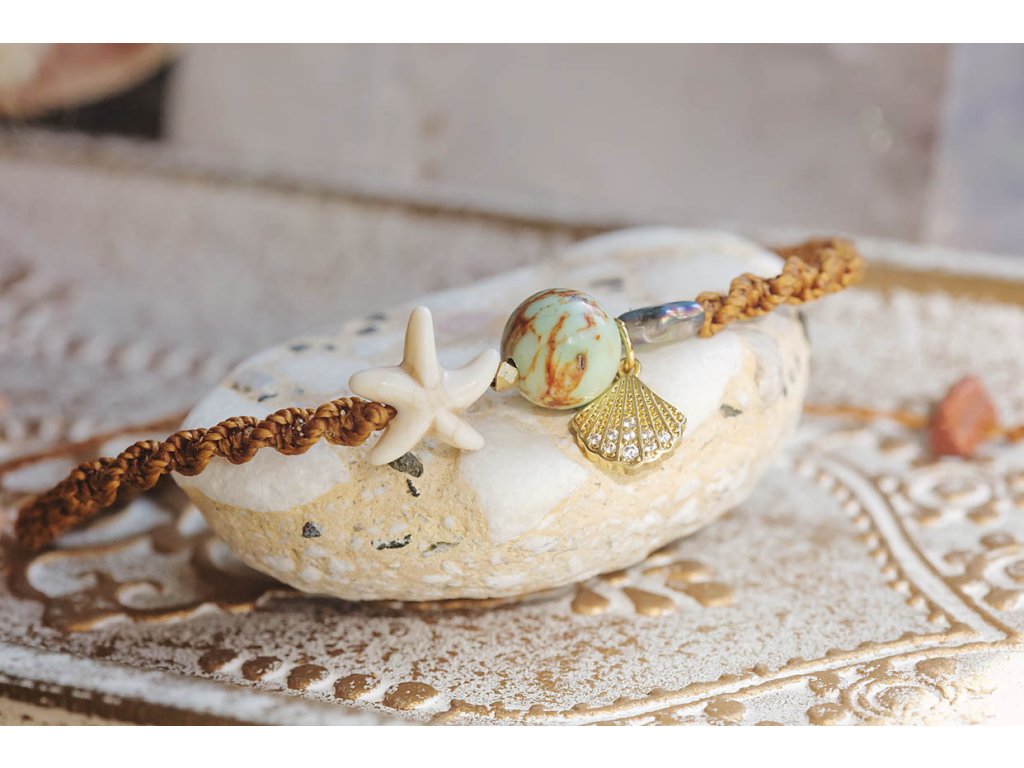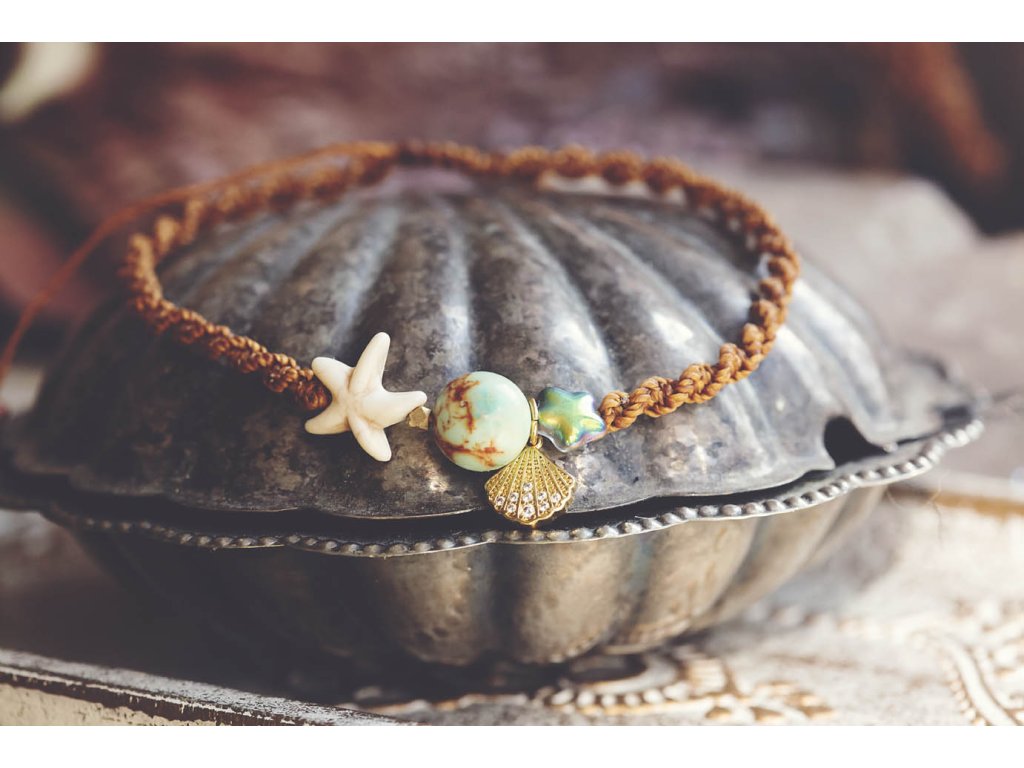Náramek na nohu s hvězdící Náramek na nohu s hvězdící je vytvořen z macramé provázku měděné barvy a ozdoben bílou hvězdicí z akrylu, jaspisem mořským sedimentem o velikosti 10mm, měděným korálkem, temně, zlatavě duhovou hvězdičkou od českých sklářů a nerezovou mušličkou s drobnými zirkony, které se na slunci třpytí, jako mořské kapičky. Makramé zámaček, díky kterému náramek přesně obemkne každý kotník, je na koncích ozdoben jaspisy červenohnědého zbarvení.Doplňkové parametry