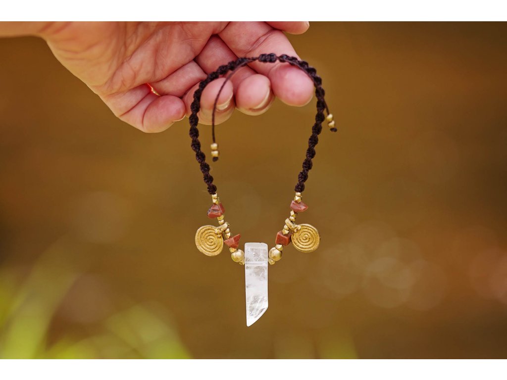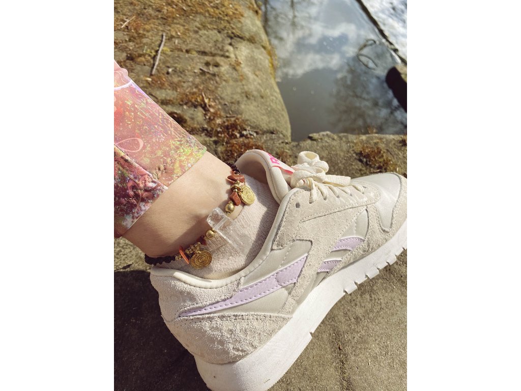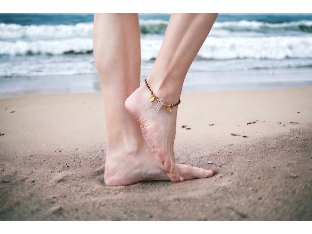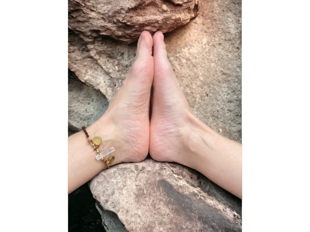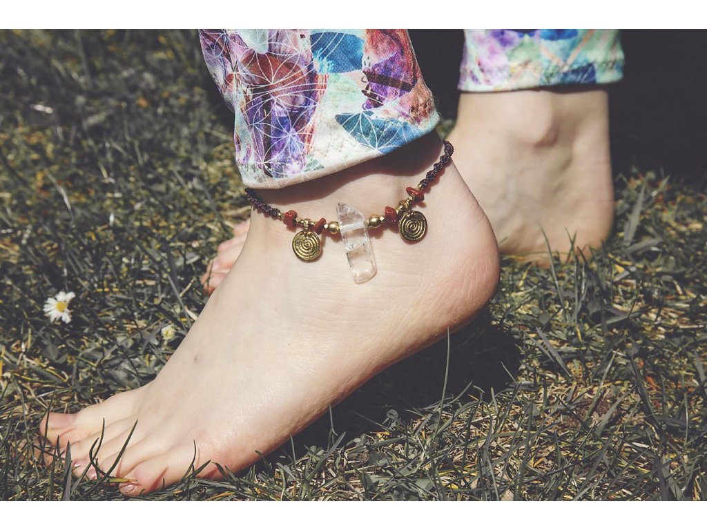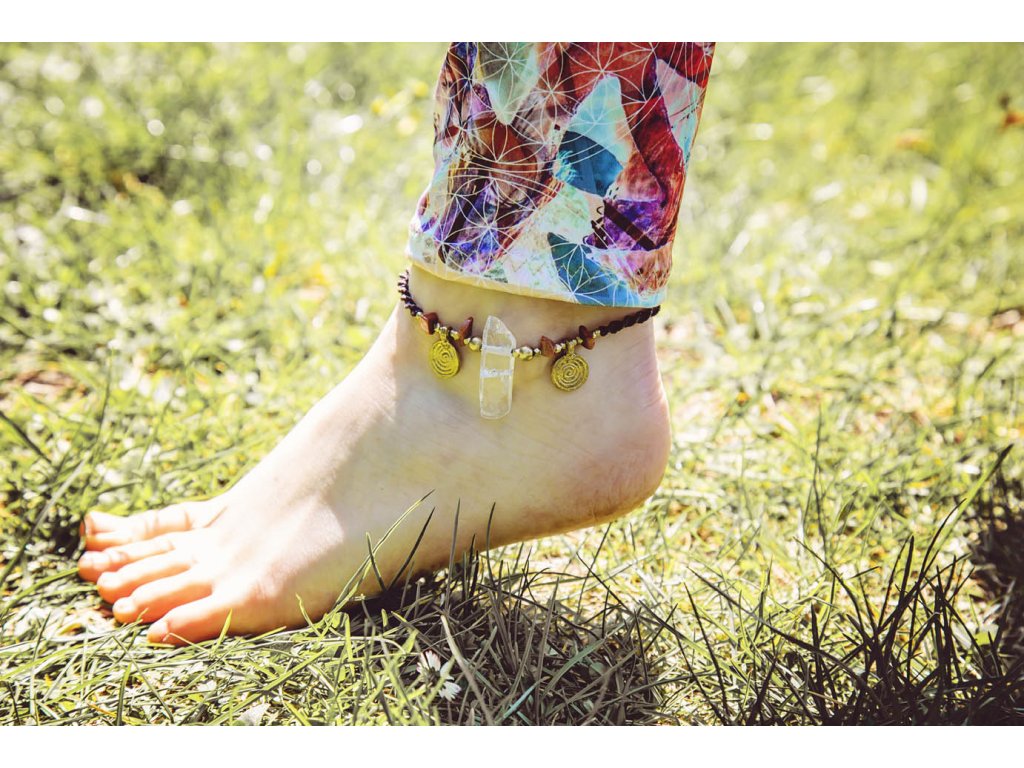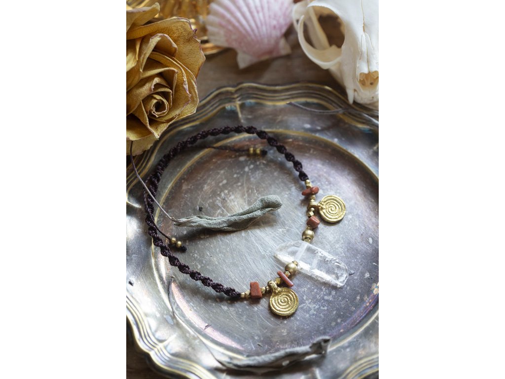 Náramek na nohu s křišťálem Něco originálního na léto? Náramek na nohu s křišťálem a aventurinem, s mosaznými spirálami a hnědou macramé dvoušroubovicí DNA. Vlastnosti drahokamů vás podpoří a ještě navíc získáte osobní šperk, který si okamžitě zamilujete. Aventurin podporuje duševní zdraví, sebedůvěru, navozuje klid, rovnováhu a rozkládá negativní emoce. Křišťál je jedinečný kámen, který uvádí energii svého nositele do harmonie, zesiluje jí a tím povzbuzuje psychiku, jasnozřivost a samostatnost a sebezdokonalení. Ochraňuje před zlými a negativními silami. Harmonizuje, čistí a chrání auru a tím zajišťuje klidný spánek. Je vhodný pro meditace a magické účely. Délka nastavitelná pomocí macramé zámečku.Doplňkové parametry