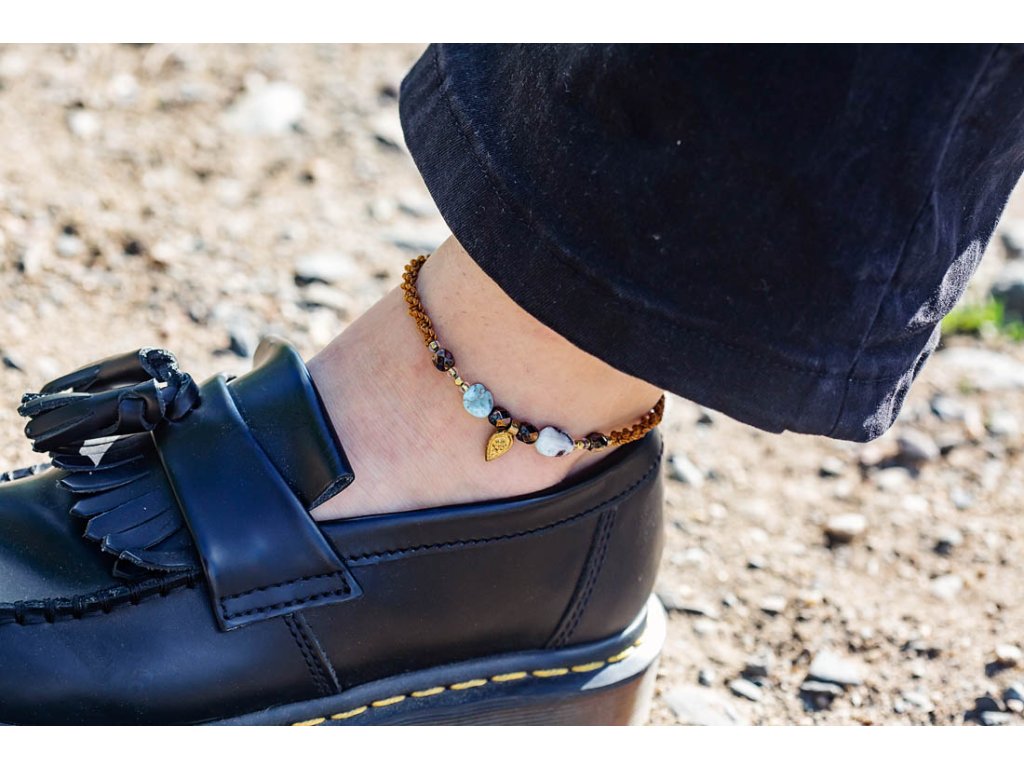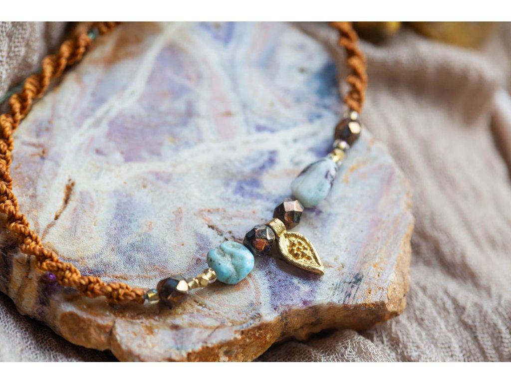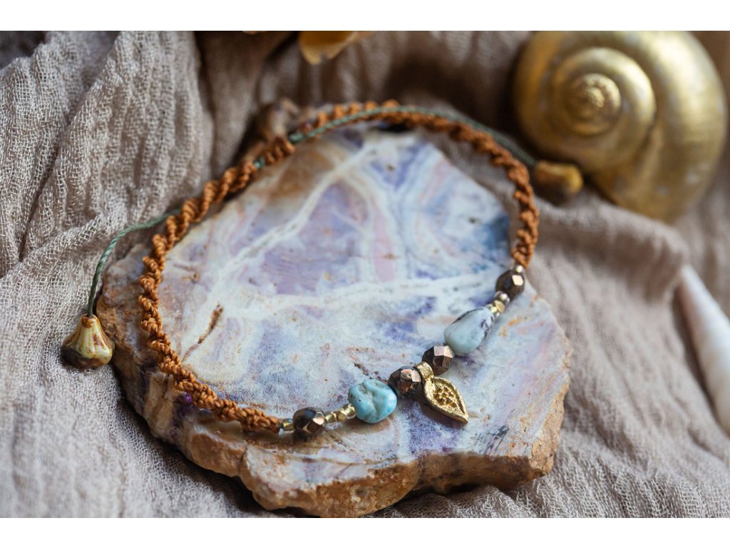 Náramek na nohu s larimarem Krásný luxusní ručně drhaný náramek na nohu s larimarem obsahuje kromě toho mystického kamene ve formě přírodních oválků také fazetované ohňovky - korálky od českých sklářů a mosazné komponenty z Indie. V zakončení se houpají dva skleněné zvonky zemitých tónů, rovněž korálky od českých sklářů, a barva macramé šňůrky je v krásném zemitém odstínu do okrova. Makramé zámeček umožňuje nastavitelnou velikost, která se přizpůsobí každému kotníku.Doplňkové parametry