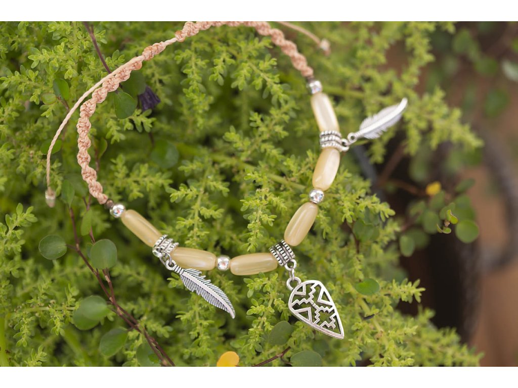 Náramek na nohu s pírky Potřebujete opravdu krásný letní šperk? Tak právě pro vás máme tento krásný jemný náramek na nohu s pírky, andským křížem a starými korálky na meruňkově zabarvené macramé dvoušroubovicí DNA. Délka nastavitelná pomocí macramé zámečku.Doplňkové parametry