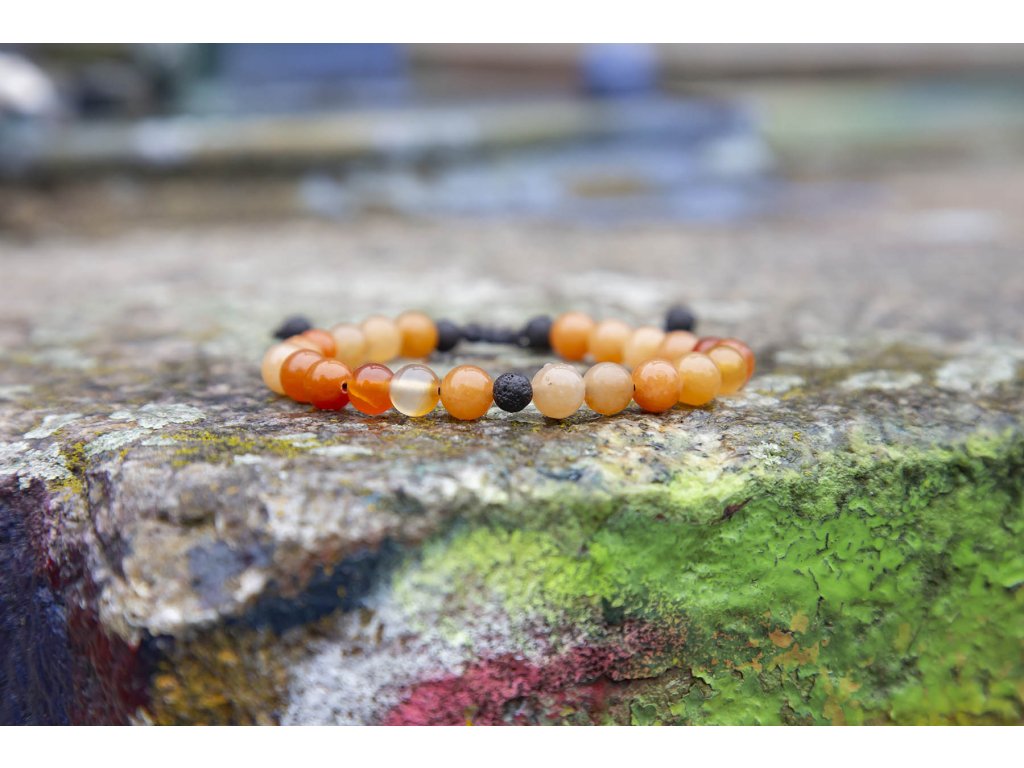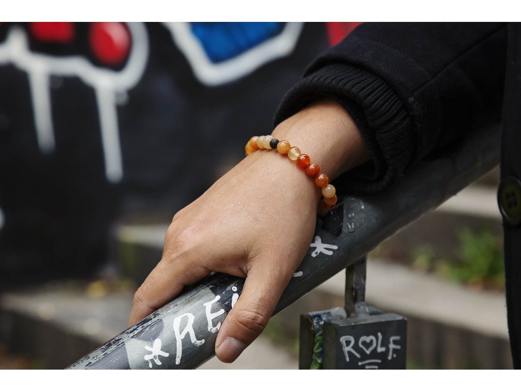 Náramek pro něj s karneoly I muži, kteří většinou neprojevují nadšení ze šperků, budou nadšeni z tohoto náramku z karneolů a lávového kamene na černé macramé šňůrce. Neváhejte a kupte tento dárek pro něj. Máme jen pár kousků. Karneol je plný životní síly a jeho energetická hodnota podněcuje tvořivost a sebedůvěru. Podporuje obnovení vitality, motivace a koncentrace, Povzbuzuje sexualitu. Chrání před závistí a záští. Zmírňuje žárlivost a dodává odvahu v těžkých životních volbách a situacích. Podněcuje k pozitivnímu pohledu na svět. Je skvělý na pracoviště. Přináší štěstí, prosperitu, podporuje analytické myšlení a zmírňuje tlak, který na vás vytváří kolegové či šéf. Je talismanem pro úspěch. Pomáhá odstranit strach ze smrti. Velikost nastavitelná pomocí macramé zámečku. Další šperky vhodné i pro muže najdete zde.Doplňkové parametry