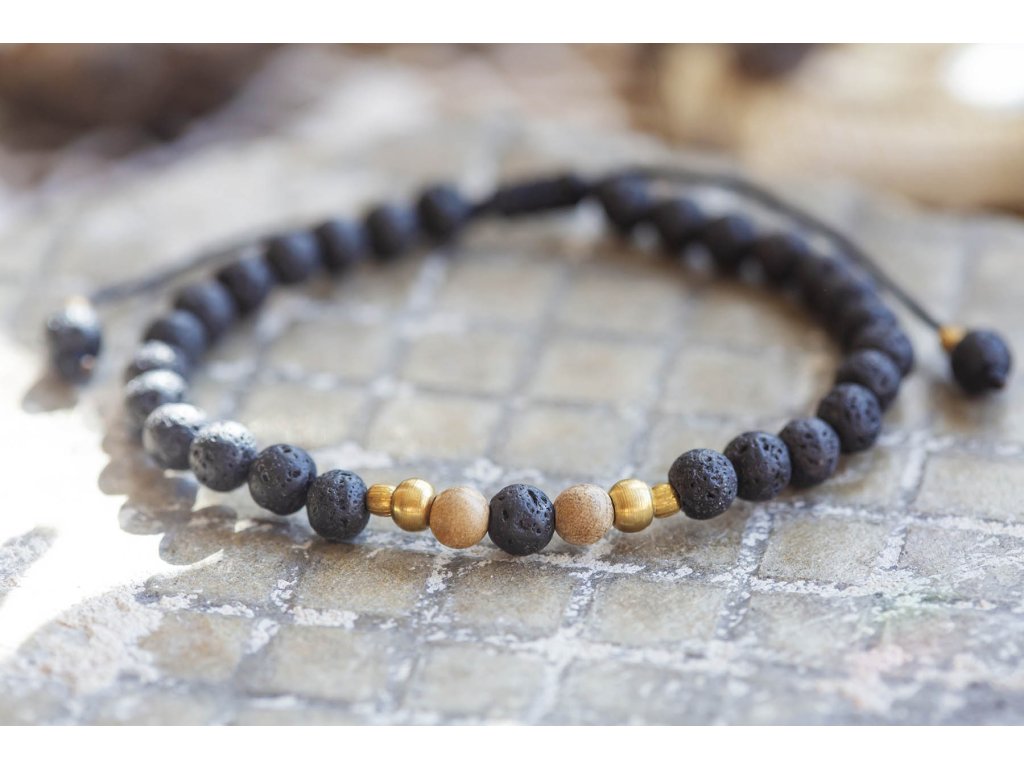 Náramek pro něj s lávou Náramek pro něj z lávových kamenů, dřevěných a mosazných korálků. Obvod je nastavitelný pomocí macramé zámečku.