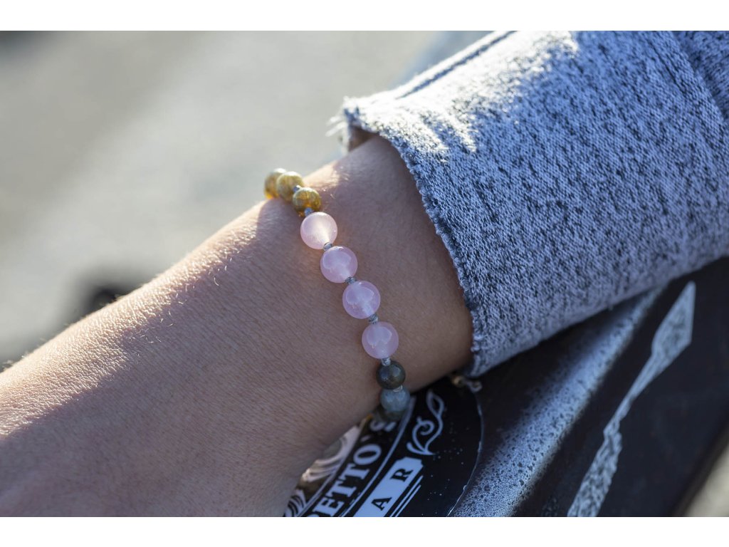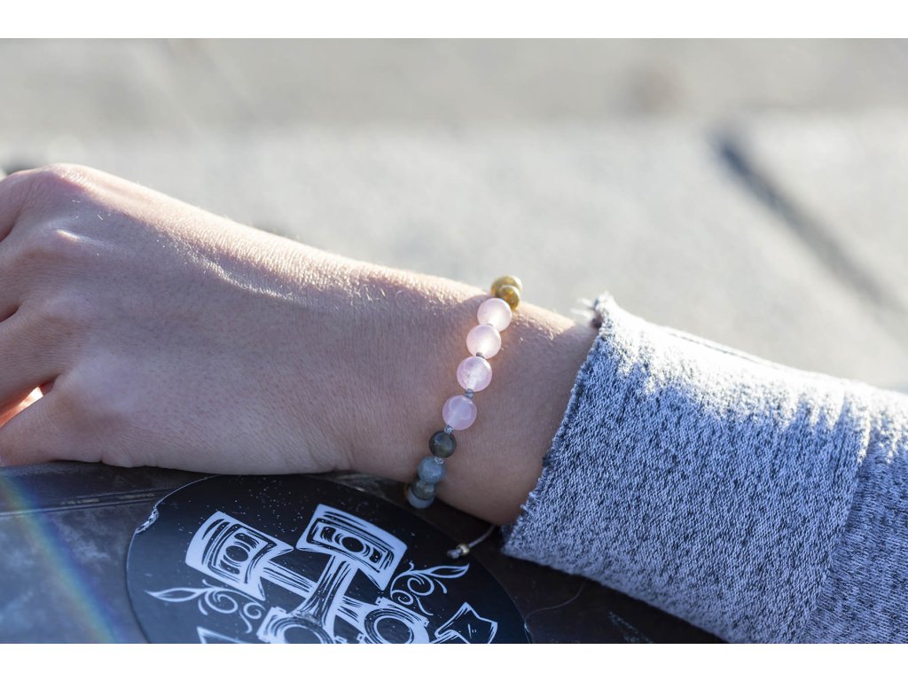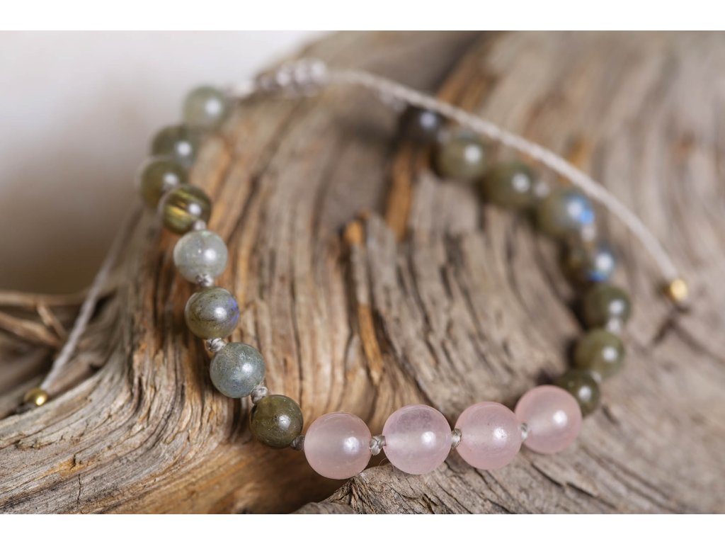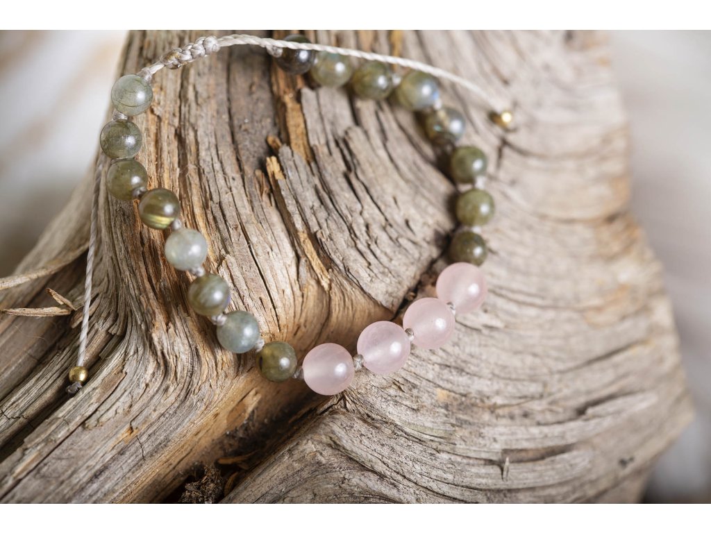 Náramek růženín a labradorit Šedozelený labradorit s růženín na macramé šňůrce tvoří krásný náramek na ozdobu vašeho zápěstí. Labradorit je vhodný pro bytost, která je připravená ukázat světu své skryté hlubiny. Vynáší na povrch to, co před světem ukrýváme a osvobozuje naši osobnost od starých vzorců a zábran. Odložením zábran se navrací do života spontánnost a radost. Je to také ochranný kámen šamanů a mágů, aby nesešli z cesty při propojování různých dimenzí a světů, přináší světlo, které rozjasňuje tuto cestu. Růženín je kámen lásky. Pomáhá projevovat city, dodává lásku a krásu, podporuje něžnost, mírnost, přátelskost a nesobeckost. Podněcuje citlivost a vnímavost vůči ostatním i sobě samému, podporuje fantazii, inspiraci a tvořivost a trpělivost. Dává sílu k odpuštění, učí sebeúctě a sebelásce. Velikost nastavitelná pomocí macramé zámečkuDoplňkové parametry