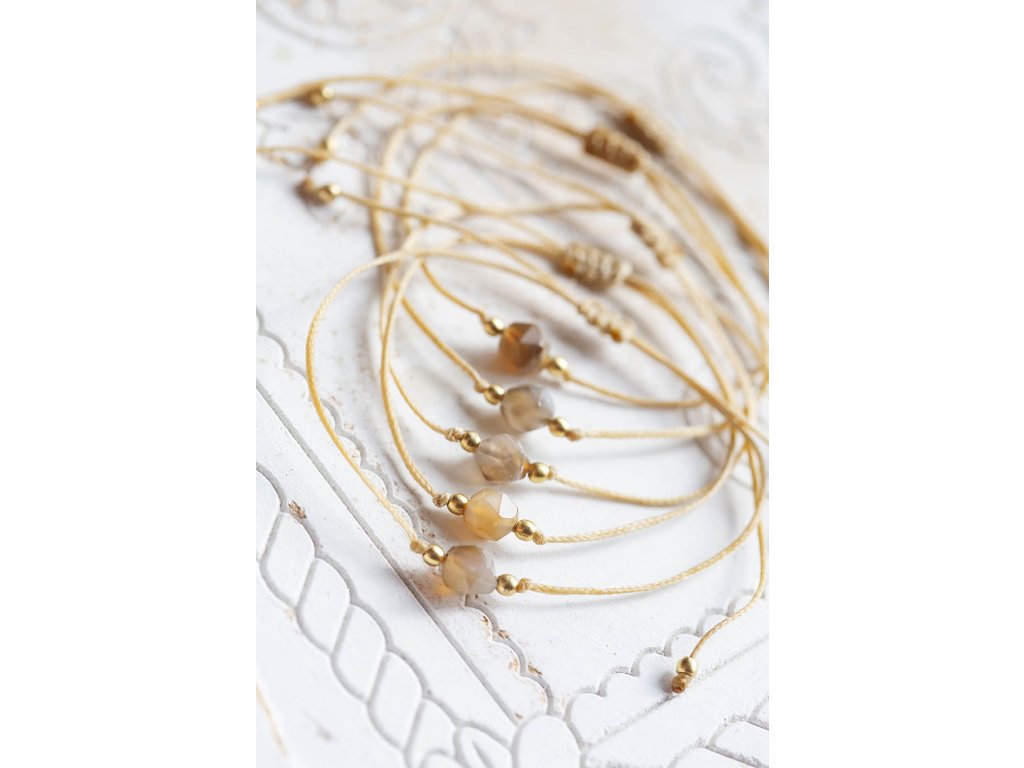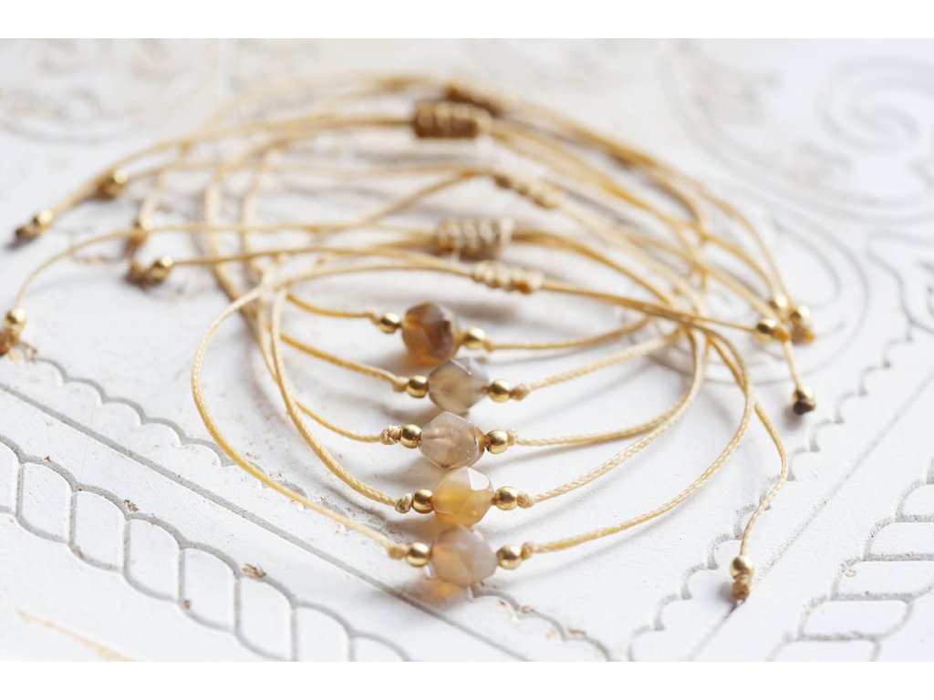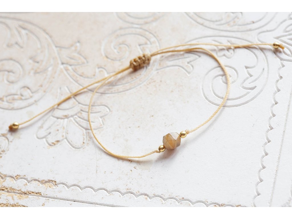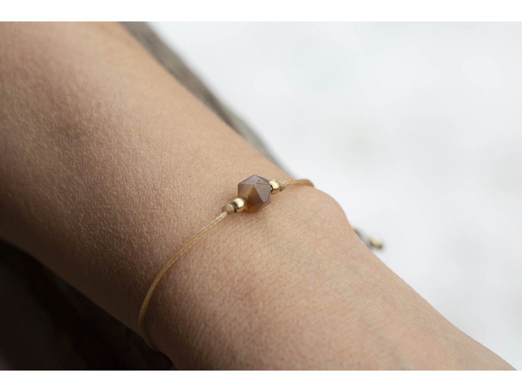 Náramek s achátem Náramek šňůrka s kubickým fasetovaným achátem. Achát podporuje vnitřní stabilitu, vyrovnanost a zralost, pocit bezpečí a sebevědomí. Usnadňuje třídění myšlenek, napomáhá při řešení komplikovaných úkolů. Ve vztazích podporuje věrnost a chápavost. Upevňuje rodinná a přátelská pouta. Délka nastavitelná - macramé zámečekDoplňkové parametry