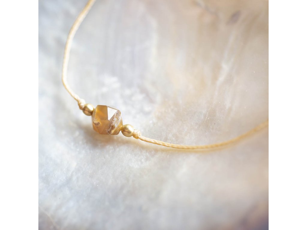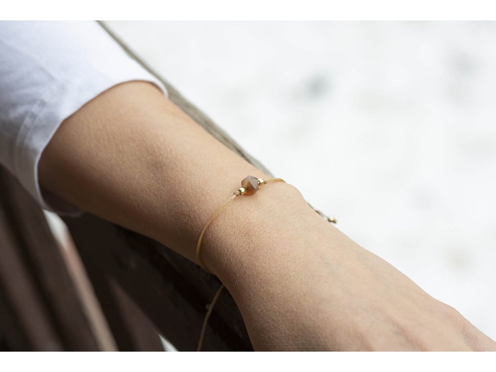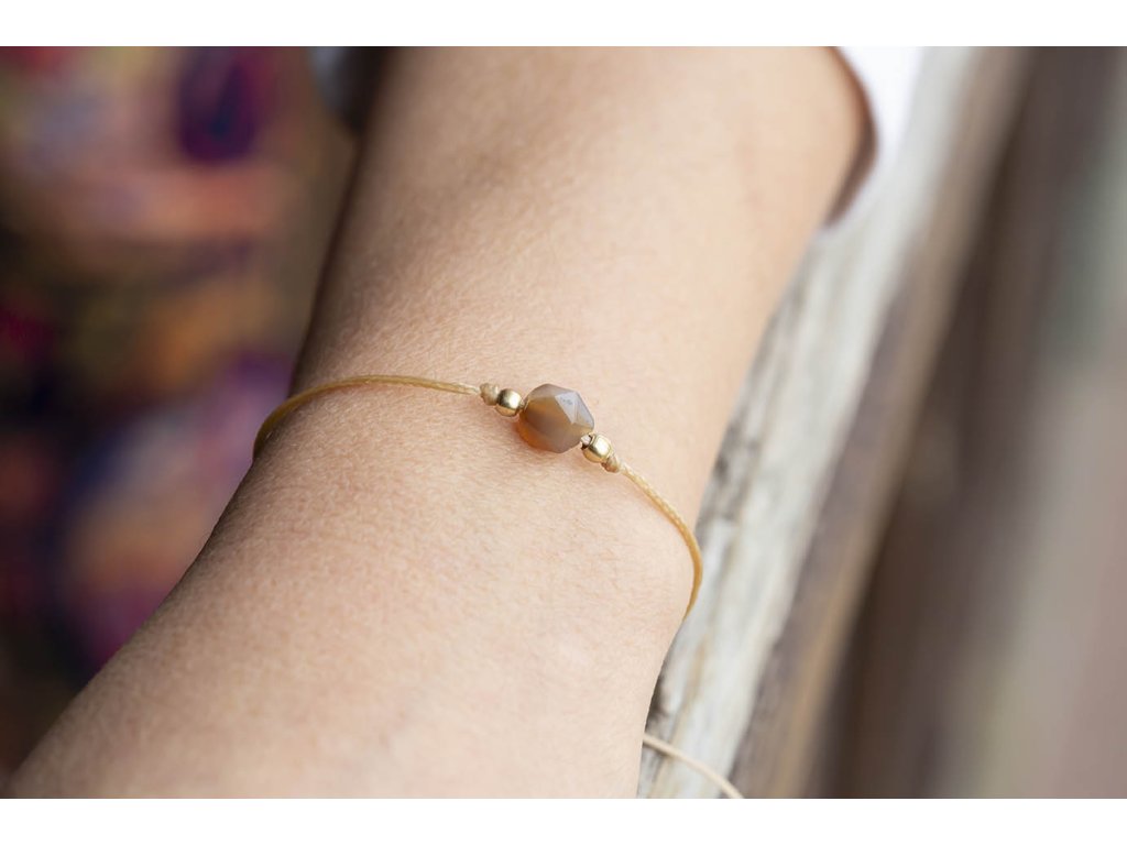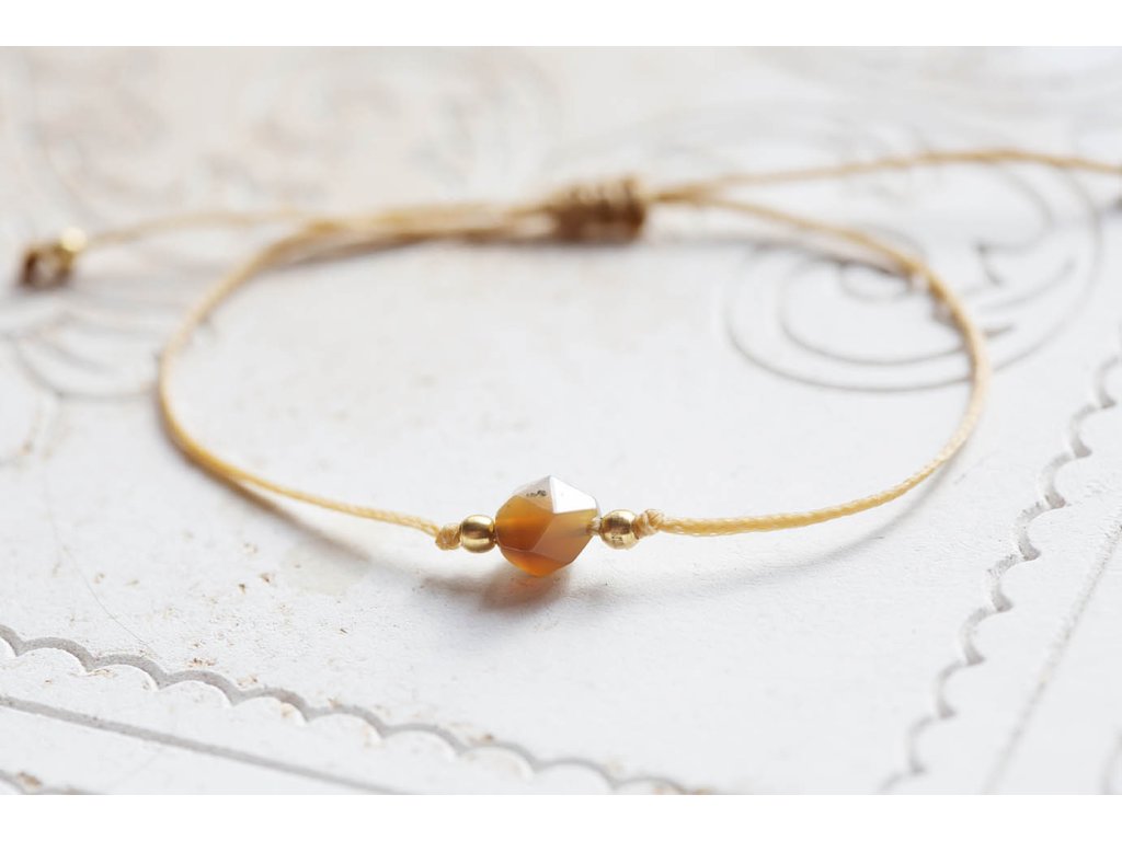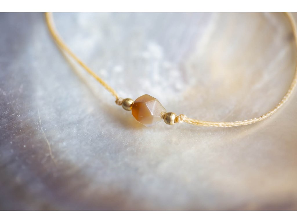 Náramek s achátem Náramek šňůrka s kubickým fasetovaným achátem. Achát podporuje vnitřní stabilitu, vyrovnanost a zralost, pocit bezpečí a sebevědomí. Usnadňuje třídění myšlenek, napomáhá při řešení komplikovaných úkolů. Ve vztazích podporuje věrnost a chápavost. Upevňuje rodinná a přátelská pouta. Délka nastavitelná - macramé zámečekDoplňkové parametry