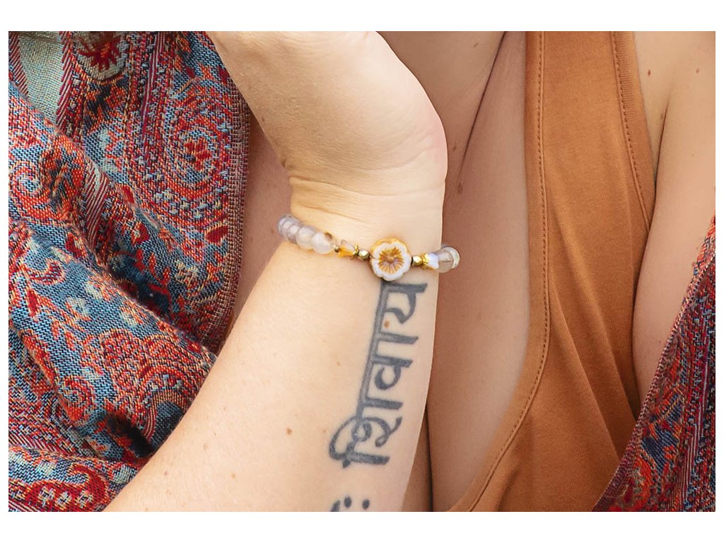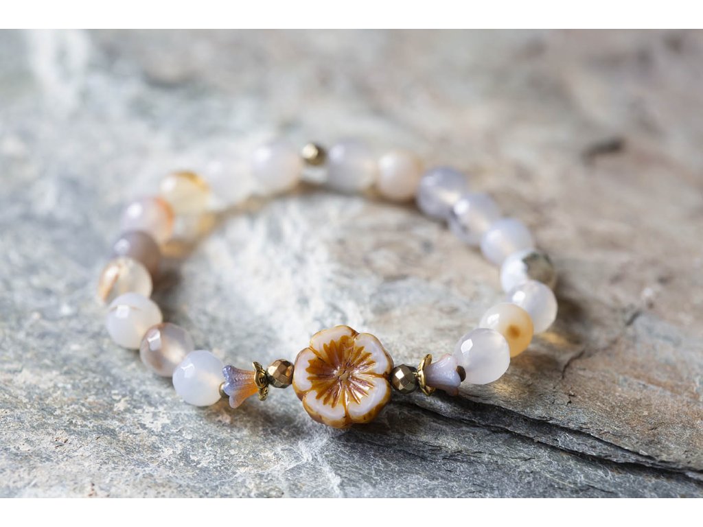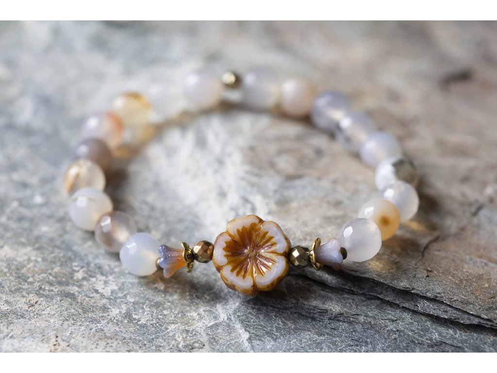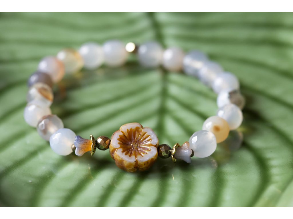 Náramek s achátem Nevšední náramek vytvořený z fasetovaného achátu, zlatě galvanizovaného hematitu a českého skla. Náramek spíše tlumených barev působí něžně a uklidňuje svou nositelku tím, že ji dodává sílu a uzemnění. Achát podporuje vnitřní stabilitu, vyrovnanost a zralost, pocit bezpečí a sebevědomí. Usnadňuje třídění myšlenek, napomáhá při řešení komplikovaných úkolů. Ve vztazích podporuje věrnost a chápavost. Upevňuje rodinná a přátelská pouta. Hematit je zvláště účinný při uzemnění a jako ochranný kámen. Uvádí do rovnováhy tělo, mysl i ducha. Nese v sobě silný element jang a zajišťuje rovnováhu meridiánů, čímž napravuje nevyváženost prvku jin. O hematitu se píše, že působí zvlášť blahodárně v situacích spojených s právem a zákony. Silně působí také v duševní rovině. Pomáhá plachým ženám, zvyšuje sebevědomí a schopnost přežít. Dodává větší vůli k životu a rozvíjí spolehlivost. Zvyšuje rovněž důvěryhodnost. Tento kámen odstraňuje omezení, která si jeho majitel v minulosti sám stanovil, a napomáhá rozvoji osobnosti. Účinně asistuje při překonávání různých nutkání a návyků. Hematit obrací pozornost k nenaplněným touhám představujícím hnací motor lidského života. Obvod náramku 17-18 cmDoplňkové parametry