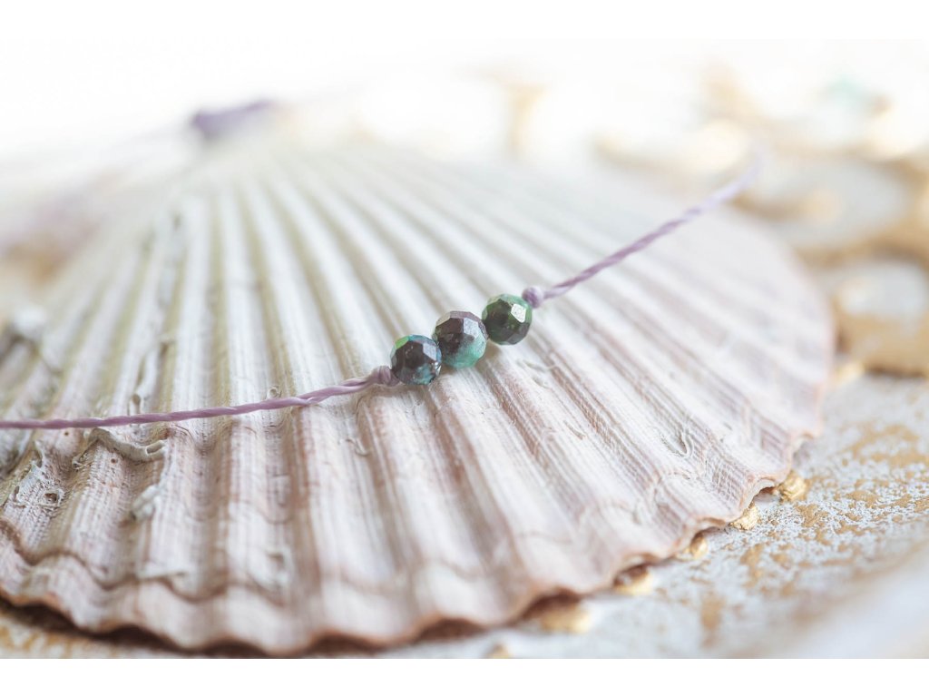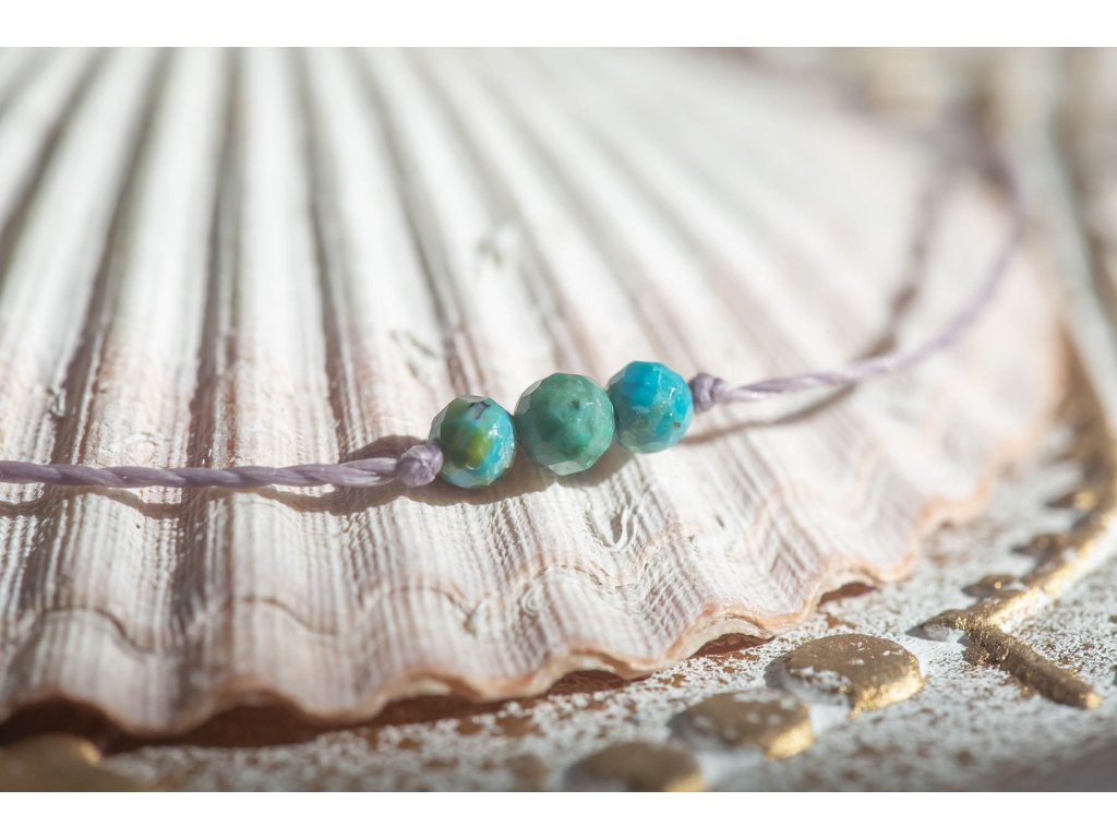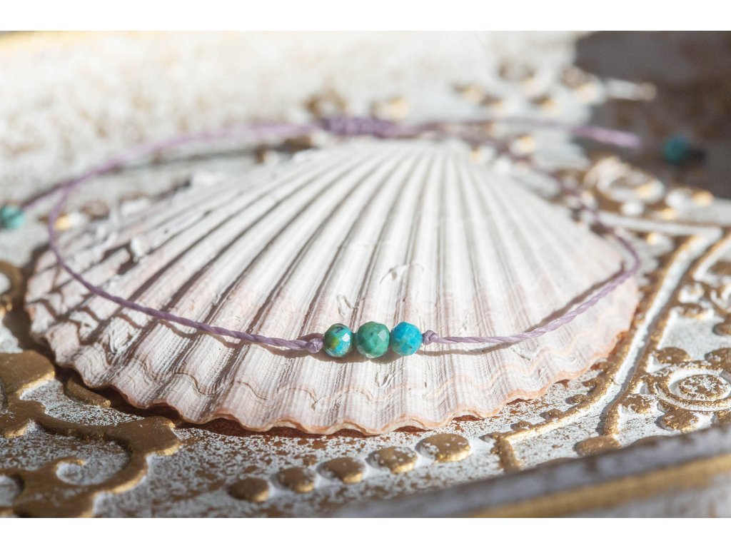 Náramek s chryzokolem Chcete aby vaše vztahy byly klidnější a stabilnější? Nebo máte zlomené srdce? Pořiďte si tento krásný náramek s chryzokolem. Pět malých fasetovaných chryzokolů na macramé šňůrce vytváří šperk, který vás i přes svou jemnost překvapí svojí silou. Chryzokol má uklidňující a očistný vliv. Působí pozitivně na vztahy, které se tím stávají klidnější a stabilní. Nošený v blízkosti srdeční čakry hojí zlomená srdce a zvyšuje schopnost milovat. Posiluje vnitřní klid a vyrovnanost, podporuje sebedůvěru a pomáhá překonávat strachy. Velikost nastavitelná pomocí macramé zámečku.Doplňkové parametry