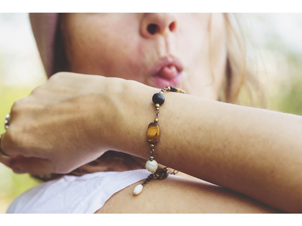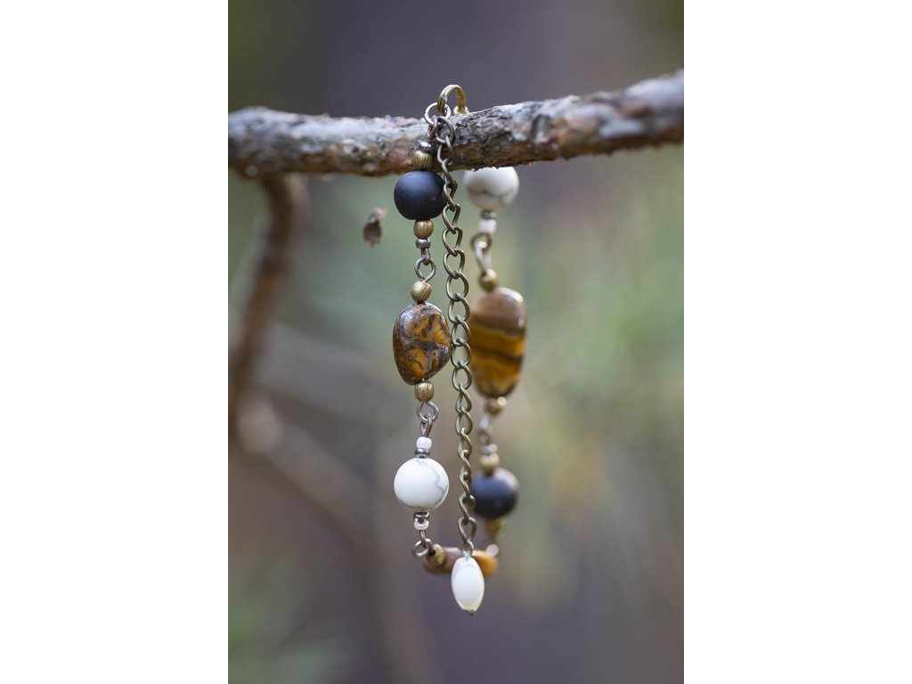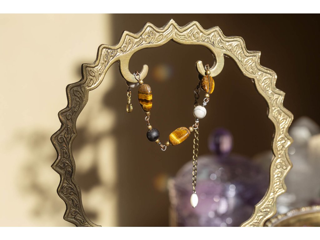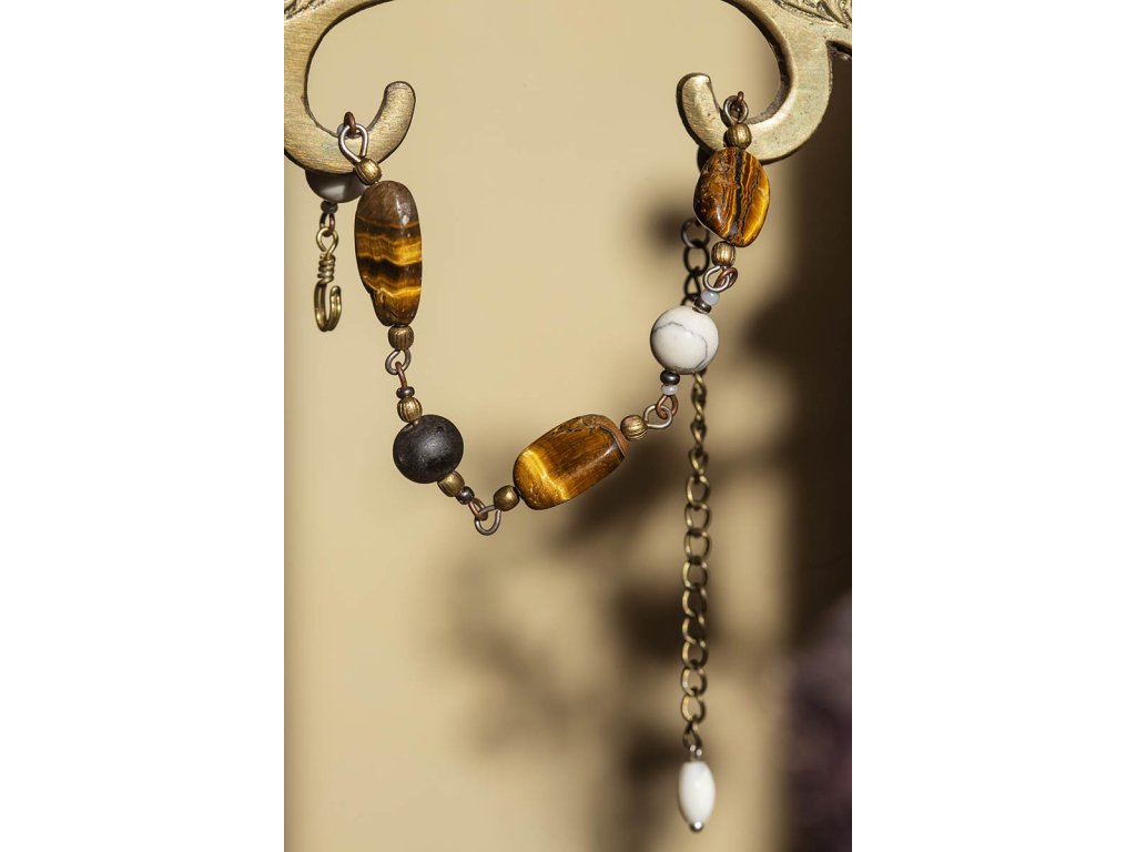 Náramek s drahokamy Někdy máme potřebu se odlišit a mít něco originálního. To je třeba tento náramek s drahokamy. Tvoří ho tygří oko, magnezit, černý korál a perleťový korálek, to vše na mosazných komponentech a řetízku. s koupí neváhejte, máme jen jeden! Korál je považován za nejsilnější ochranný kámen. Očisťuje nás od zatěžujících a temných myšlenek, negativních představ a pocitů. Povzbuzuje v nás pozitivní myšlení a cítění, zachovávání duševního řádu a čistoty. V barvě červené je symbolem lásky, oddanosti a pokory, soucitu a sounáležitosti s celkem. Je symbolem mateřství. Magnezit je kámen, který se náramně hodí pro podporu zklidnění, chceme-li meditovat. Podporuje totiž soustředění, klid mysli a oproštění od myšlenek. Dále je vhodný při studiu a učení. Snižuje stres, podporuje rovnováhu, odevzdání a setrvání v neutrálu. Tygří oko je ochranný kámen, která se používá jako talisman před všemi formami nebezpečí. Propojuje sluneční a zemskou energii a tím pomáhá uzemnit lidi, kteří ztratili spojení s realitou a zároveň podporuje duchovní růst těch materialisticky zaměřených. Je to hřejivý kámen, podporuje to energie v těle a dodává sílu, přitahuje peníze a prosperitu. Pomáhá s odbouráním závislostí na druhých uznáním vlastní hodnoty. Mírní deprese. Velikost je nastavitelná.Doplňkové parametry