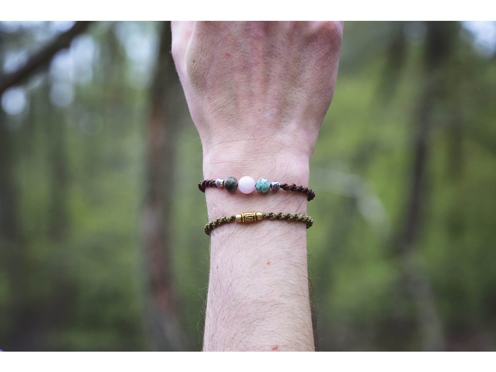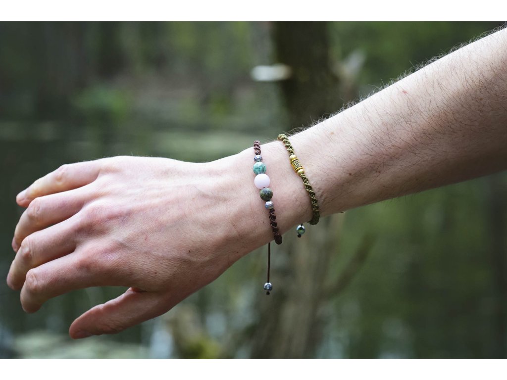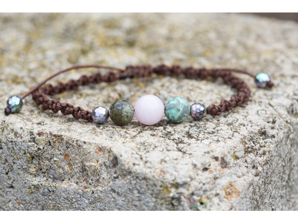 Náramek s drahokamy Krásný macramé náramek s třešňovým achátem, jaspisy a fasetovanými pokovenými hematity. Achát podporuje vnitřní stabilitu, vyrovnanost a zralost, pocit bezpečí a sebevědomí. Usnadňuje třídění myšlenek, napomáhá při řešení komplikovaných úkolů. Ve vztazích podporuje věrnost a chápavost. Upevňuje rodinná a přátelská pouta. Hematit je zvláště účinný při uzemnění a jako ochranný kámen. Uvádí do rovnováhy tělo, mysl i ducha. Nese v sobě silný element jang a zajišťuje rovnováhu meridiánů, čímž napravuje nevyváženost prvku jin. O hematitu se píše, že působí zvlášť blahodárně v situacích spojených s právem a zákony. Silně působí také v duševní rovině. Pomáhá plachým osobám zvyšovat sebevědomí a podporuje schopnost přežít. Dodává větší vůli k životu a rozvíjí spolehlivost. Zvyšuje rovněž důvěryhodnost. Tento kámen odstraňuje omezení, která si jeho majitel v minulosti sám stanovil, a napomáhá rozvoji osobnosti. Účinně asistuje při překonávání různých nutkání a návyků. Hematit obrací pozornost k nenaplněným touhám představujícím hnací motor lidského života. Jaspis přináší do života klid, pomáhá ve stresu, uvádí do rovnováhy duševní i tělesnou stránku. Umožňuje dosahování cílů, tím že podporuje pronikavost vhledu na podstatu problému. Zvyšuje organizační schopnosti a schopnost dělat rychlá a správná rozhodnutí. Chrání před negativní energií. Je výborným pomocníkem v pracovním i soukromém životě. Velikost nastavitelná pomocí macramé zámečku.Doplňkové parametry