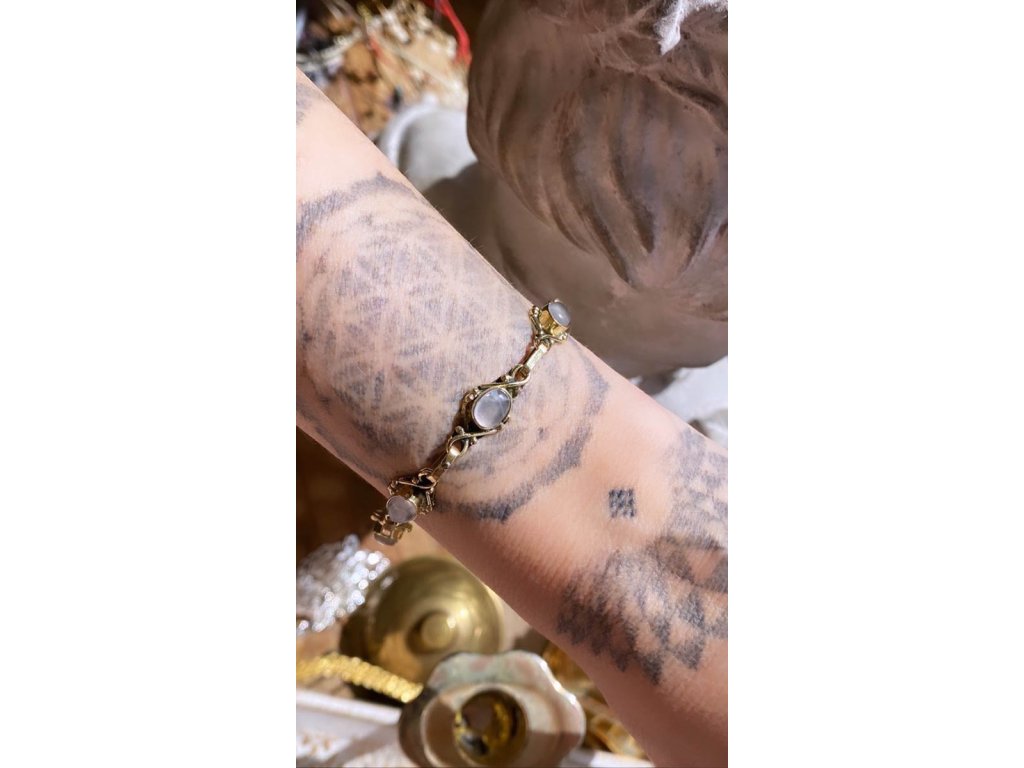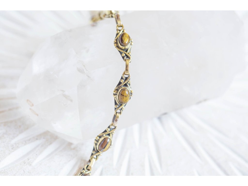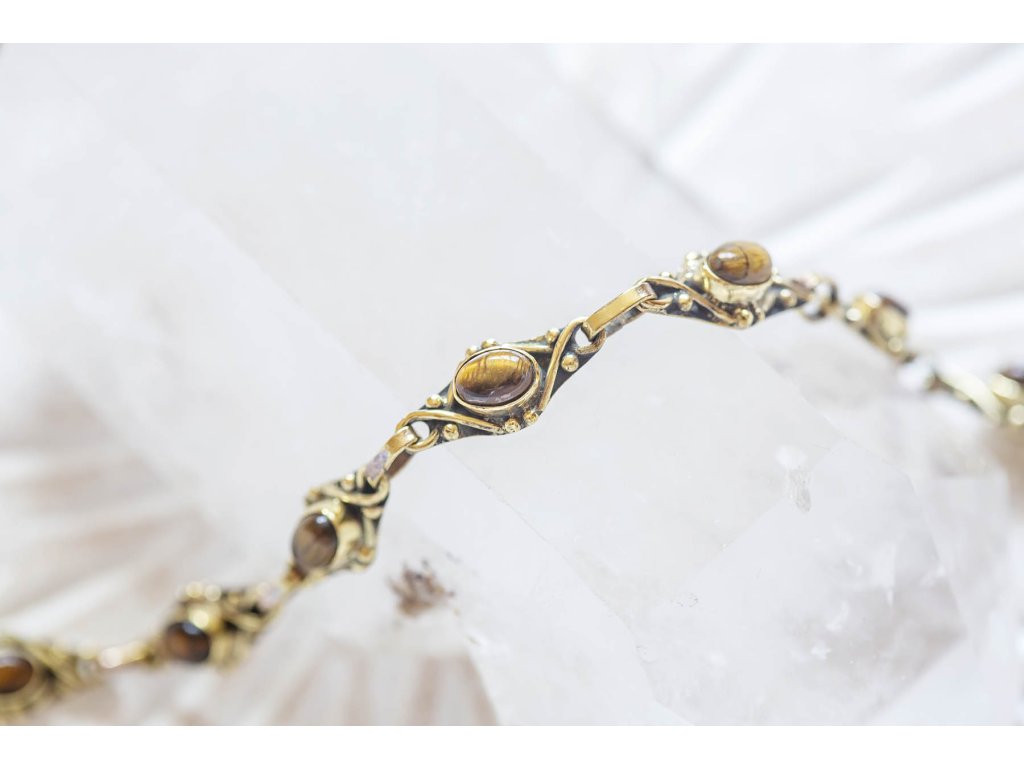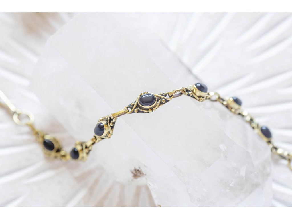 Náramek s drahokamy ve zdobení Potřebujete krásný šperk s magickou silou drahokamů? Pořiďte si tento překrásný náramek se sedmi kameny zasazenými do zdobení z mosazi. Na výběr máme šedozelený labradorit, do modra opalizující měsíční kámen, černý onyx, světle růžový růženín a žlutohnědé tygří oko. Labradorit je vhodný pro bytost, která je připravená ukázat světu své skryté hlubiny. Vynáší na povrch to, co před světem ukrýváme a osvobozuje naši osobnost od starých vzorců a zábran. Odložením zábran se navrací do života spontánnost a radost. Je to také ochranný kámen šamanů a mágů, aby nesešli z cesty při propojování různých dimenzí a světů, přináší světlo, které rozjasňuje tuto cestu. Měsíční kámen je uchvacující drahokam, který má silné magické účinky. Ochraňuje citlivé povahy a napomáhá vyrovnaným šťastným vztahům. Je považován za drahokam štěstí. Působí pozitivně na intuici, tvořivost a podpoří Vás v nových začátcích. Šperk s měsíčním kamenem by neměl chybět ve šperkovnici žádné ženy. Více o měsíčním kameni se dočtete na našem blogu. Onyx je ochranný kámen, který odráží negativitu vědomě namířenou proti vám. Chrání život, dodává sílu, pomáhá v těžkých obdobích, při mimořádném fyzickém a citovém vypětí. Zaměřuje energii jedním směrem, přináší ráznost a vytrvalost, dovoluje svému nositeli stát se pánem svého osudu. Poskytuje poučení z minulosti, zvyšuje sebedůvěru a sebekontrolu, léčí stará traumata ovlivňující současný život a snižuje strach a obavy. Udržuje v těle rovnováhu energií jin a jang. Růženín je kámen lásky. Pomáhá projevovat city, dodává lásku a krásu, podporuje něžnost, mírnost, přátelskost a nesobeckost. Podněcuje citlivost a vnímavost vůči ostatním i sobě samému, podporuje fantazii, inspiraci a tvořivost a trpělivost. Dává sílu k odpuštění, učí sebeúctě a sebelásce. Tygří oko je ochranný kámen, která se používá jako talisman před všemi formami nebezpečí. Propojuje sluneční a zemskou energii a tím pomáhá uzemnit lidi, kteří ztratili spojení s realitou a zároveň podporuje duchovní růst těch materialisticky zaměřených. Je to hřejivý kámen, podporuje to energie v těle a dodává sílu, přitahuje peníze a prosperitu. Pomáhá s odbouráním závislostí na druhých uznáním vlastní hodnoty. Mírní deprese. Maximální délka cca 21 cm. Náramek lze mírně zkrátit.Buďte první, kdo napíše příspěvek k této položce.