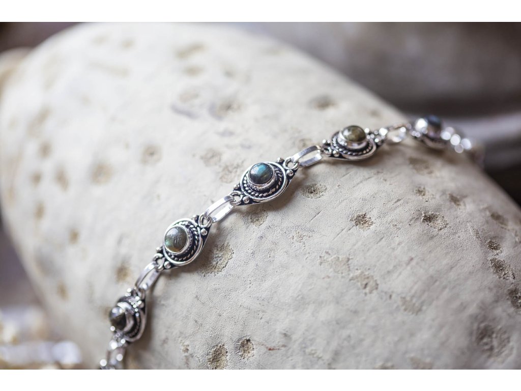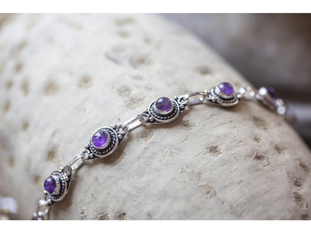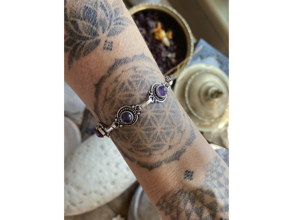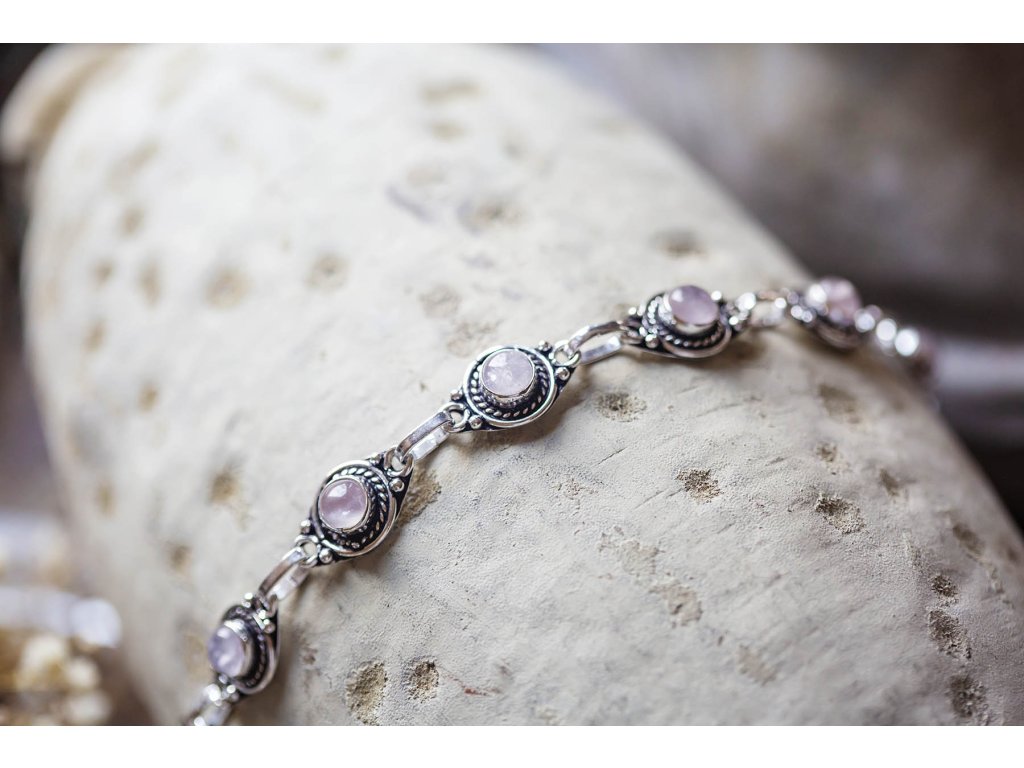 Náramek s drahokamy Potřebujete krásný šperk s magickou silou drahokamů? Pořiďte si tento překrásný náramek se sedmi drahokamy zasazenými do zdobení z postříbřené mosazi. Na výběr máme světle fialový ametyst, tmavě modrý lapis lazuli, černý onyx, růžový růženín, hnědožluté tygří oko. Ametyst je kamenem čistoty ducha a meditace. Pomáhá nám v sobě objevovat sebeobětování, lásku, pokoru a nezištnost. Těmito vlastnostmi nám otevírá cestu do jiných dimenzí bytí. Je to kámen inspirace, směřuje naše myšlení k tvořivé práci a probouzí v nás intuici. Více o ametystu se dočtete na našem blogu. Lapis lazuli je jedinečný drahokam, který pomáhá a podporuje svého nositele v mnoha ohledech. Navozuje vnitřní klid a mír, podporuje radost, odvahu, lásku, poctivost a kreativitu. Upevňuje mezilidské vztahy a zlepšuje komunikaci. Zvyšuje sebevědomí a podporuje osobní růst. Mírní strach, vztek a agresivitu. Má blahodárný vliv na paměť a úsudek. Dokáže odstraňovat stres a taky být velkým pomocníkem při detoxikaci organismu, například při dietě. Onyx je ochranný kámen, který odráží negativitu vědomě namířenou proti vám. Chrání život, dodává sílu, pomáhá v těžkých obdobích, při mimořádném fyzickém a citovém vypětí. Zaměřuje energii jedním směrem, přináší ráznost a vytrvalost, dovoluje svému nositeli stát se pánem svého osudu. Poskytuje poučení z minulosti, zvyšuje sebedůvěru a sebekontrolu, léčí stará traumata ovlivňující současný život a snižuje strach a obavy. Udržuje v těle rovnováhu energií jin a jang. Růženín je kámen lásky. Pomáhá projevovat city, dodává lásku a krásu, podporuje něžnost, mírnost, přátelskost a nesobeckost. Podněcuje citlivost a vnímavost vůči ostatním i sobě samému, podporuje fantazii, inspiraci a tvořivost a trpělivost. Dává sílu k odpuštění, učí sebeúctě a sebelásce. Tygří oko je ochranný kámen, která se používá jako talisman před všemi formami nebezpečí. Propojuje sluneční a zemskou energii a tím pomáhá uzemnit lidi, kteří ztratili spojení s realitou a zároveň podporuje duchovní růst těch materialisticky zaměřených. Je to hřejivý kámen, podporuje to energie v těle a dodává sílu, přitahuje peníze a prosperitu. Pomáhá s odbouráním závislostí na druhých uznáním vlastní hodnoty. Mírní deprese. Maximální délka cca 21,5 cm. Náramek lze mírně zkrátit.Buďte první, kdo napíše příspěvek k této položce.