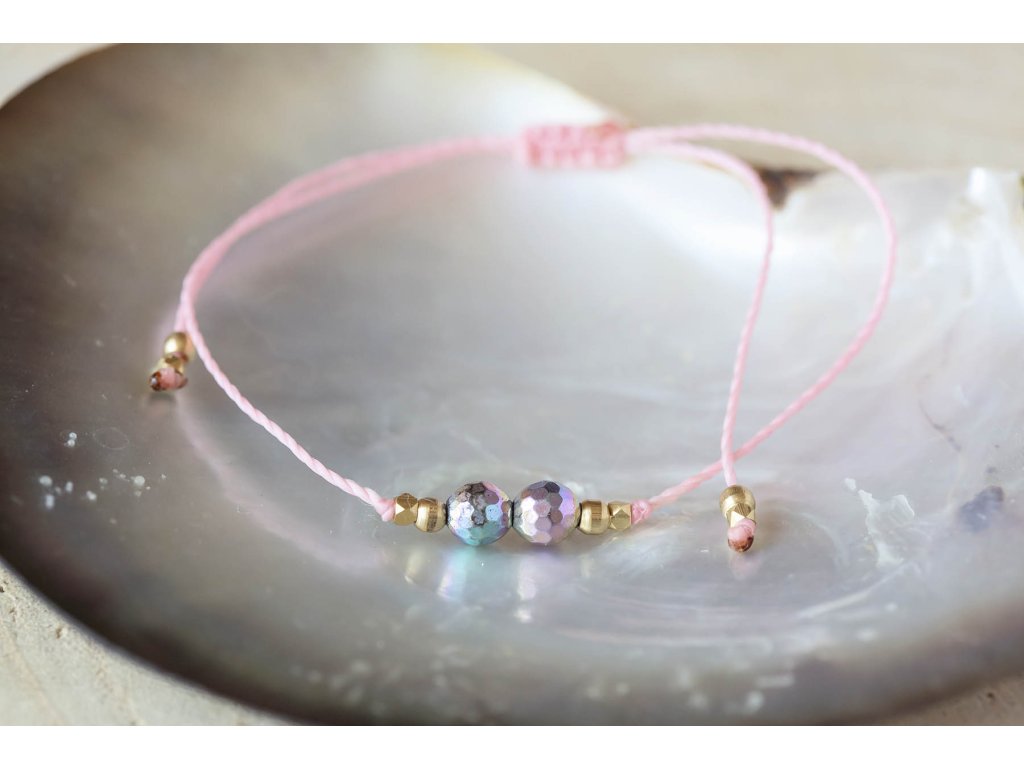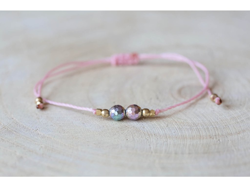Náramek s hematitem Hezký jemný náramek s růžovou macramé šňůrkou ve tvaru dvoušroubovice DNA a pokoveným hematitem. Hematit je zvláště účinný při uzemnění a jako ochranný kámen. Uvádí do rovnováhy tělo, mysl i ducha. Nese v sobě silný element jang a zajišťuje rovnováhu meridiánů, čímž napravuje nevyváženost prvku jin. O hematitu se píše, že působí zvlášť blahodárně v situacích spojených s právem a zákony. Silně působí také v duševní rovině. Pomáhá plachým osobám zvyšovat sebevědomí a podporuje schopnost přežít. Dodává větší vůli k životu a rozvíjí spolehlivost. Zvyšuje rovněž důvěryhodnost. Tento kámen odstraňuje omezení, která si jeho majitel v minulosti sám stanovil, a napomáhá rozvoji osobnosti. Účinně asistuje při překonávání různých nutkání a návyků. Hematit obrací pozornost k nenaplněným touhám představujícím hnací motor lidského života. Délka je nastavitelná pomocí macramé zámečkuDoplňkové parametry