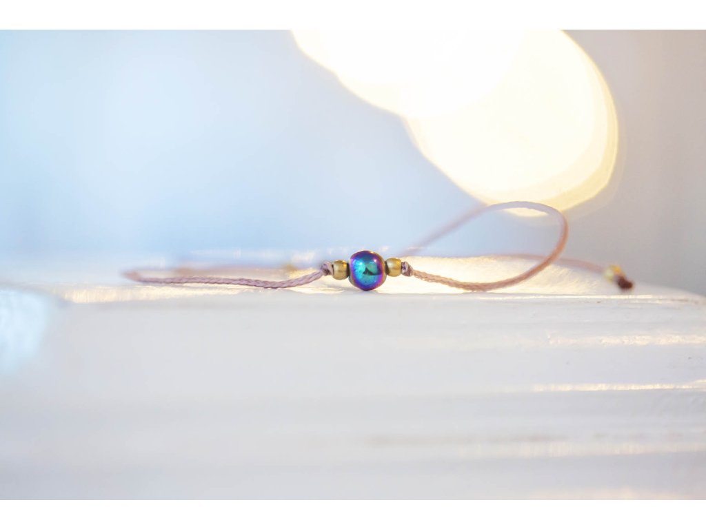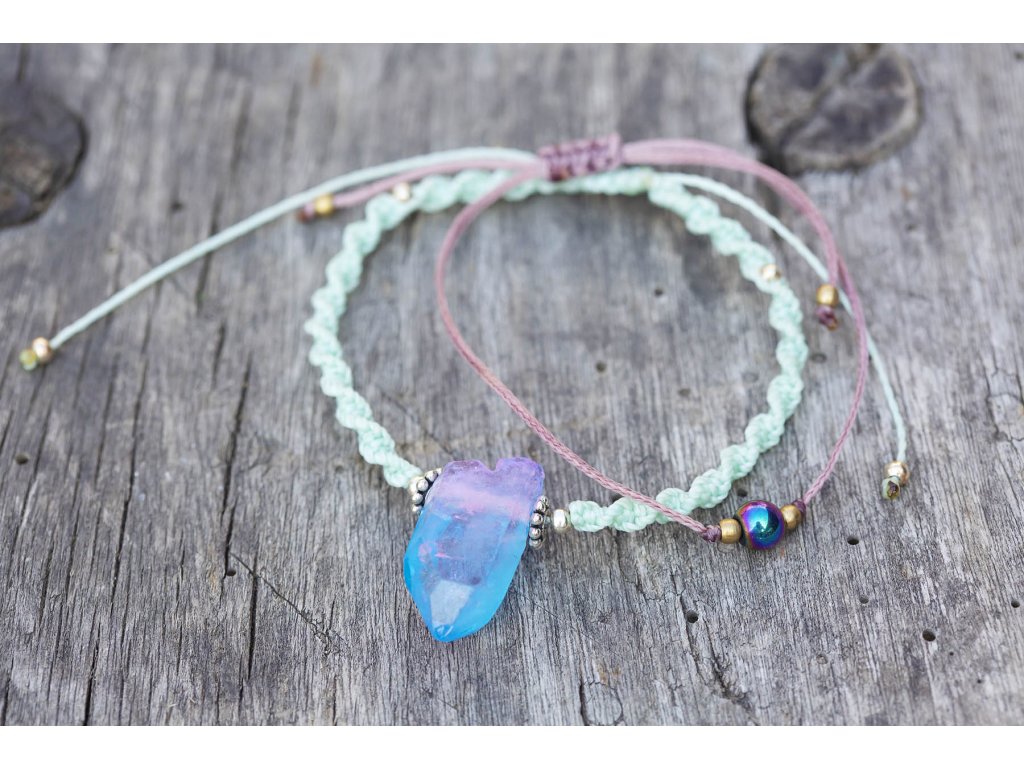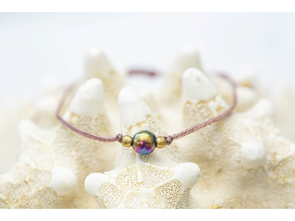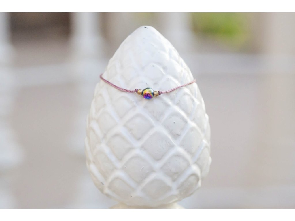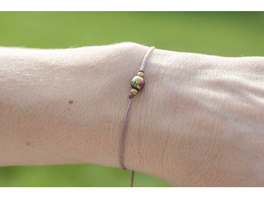 Náramek s hematitem Hematit s duhovou povrchovou úpravou navlečený na starorůžové šňůrce. Hematit je zvláště účinný při uzemnění a jako ochranný kámen. Uvádí do rovnováhy tělo, mysl i ducha. Nese v sobě silný element jang a zajišťuje rovnováhu meridiánů, čímž napravuje nevyváženost prvku jin. O hematitu se píše, že působí zvlášť blahodárně v situacích spojených s právem a zákony. Silně působí také v duševní rovině. Pomáhá plachým osobám zvyšovat sebevědomí a podporuje schopnost přežít. Dodává větší vůli k životu a rozvíjí spolehlivost. Zvyšuje rovněž důvěryhodnost. Tento kámen odstraňuje omezení, která si jeho majitel v minulosti sám stanovil, a napomáhá rozvoji osobnosti. Účinně asistuje při překonávání různých nutkání a návyků. Hematit obrací pozornost k nenaplněným touhám představujícím hnací motor lidského života. Velikost je nastavitelná pomocí macramé zámečkuDoplňkové parametry