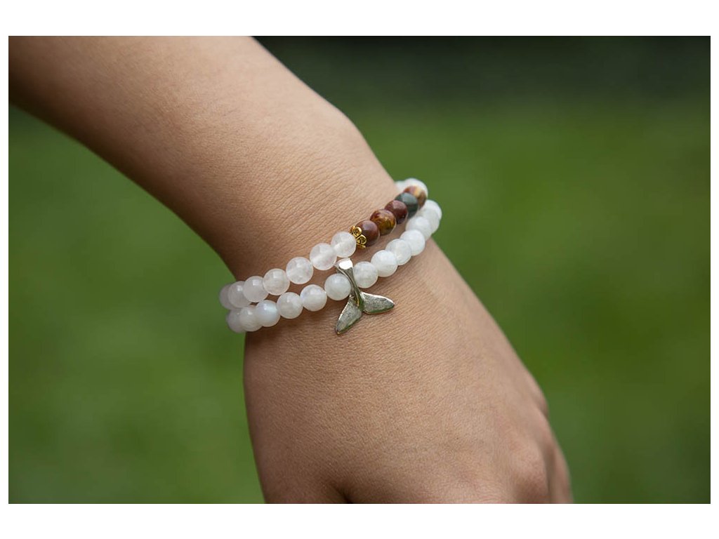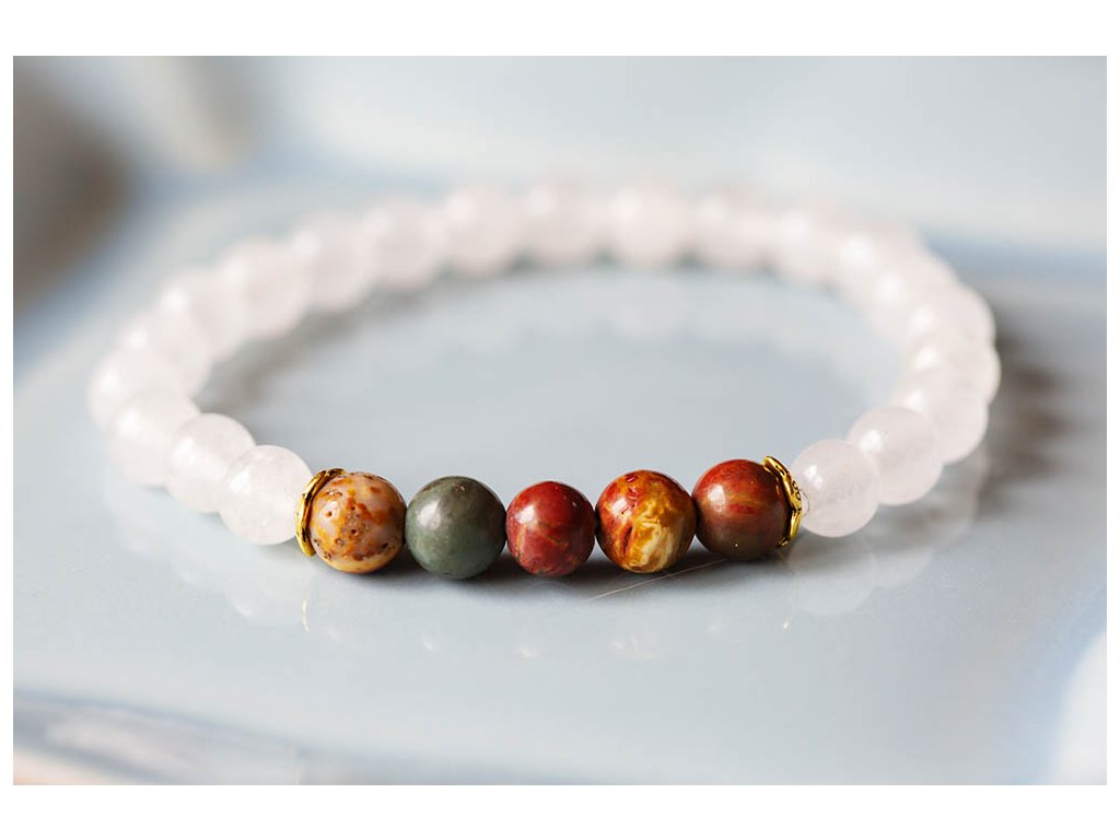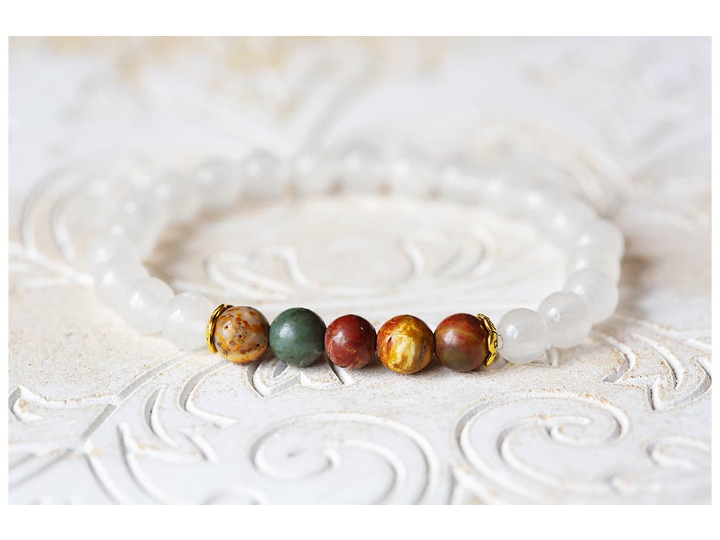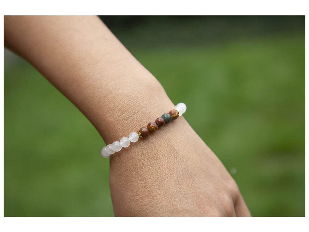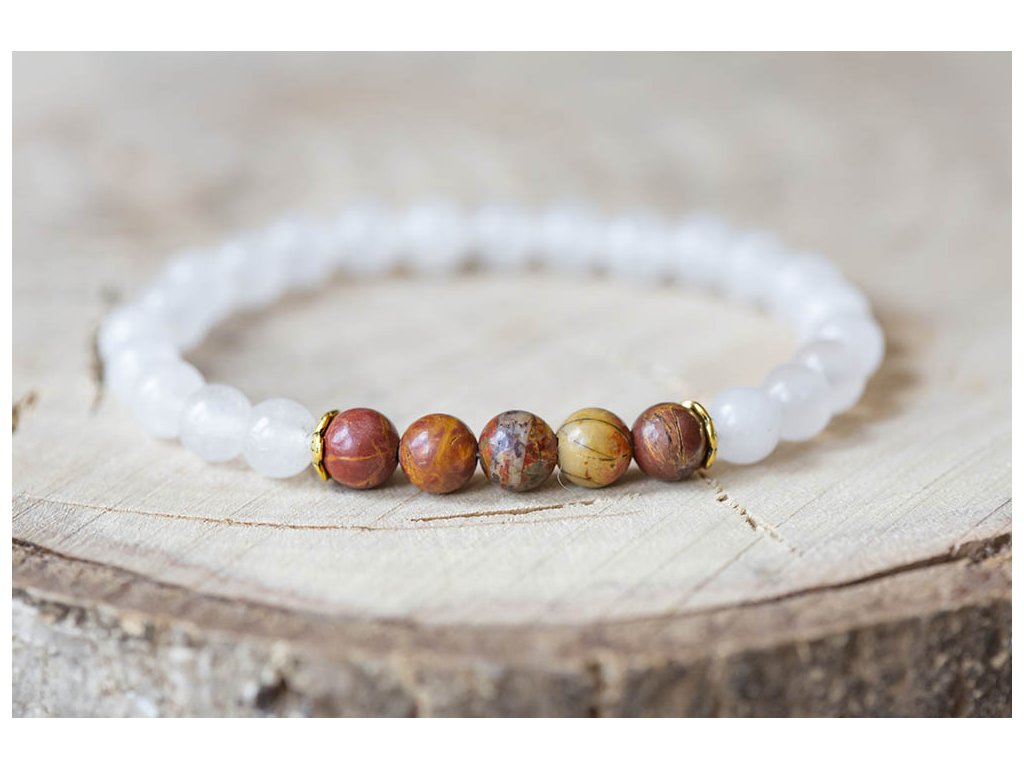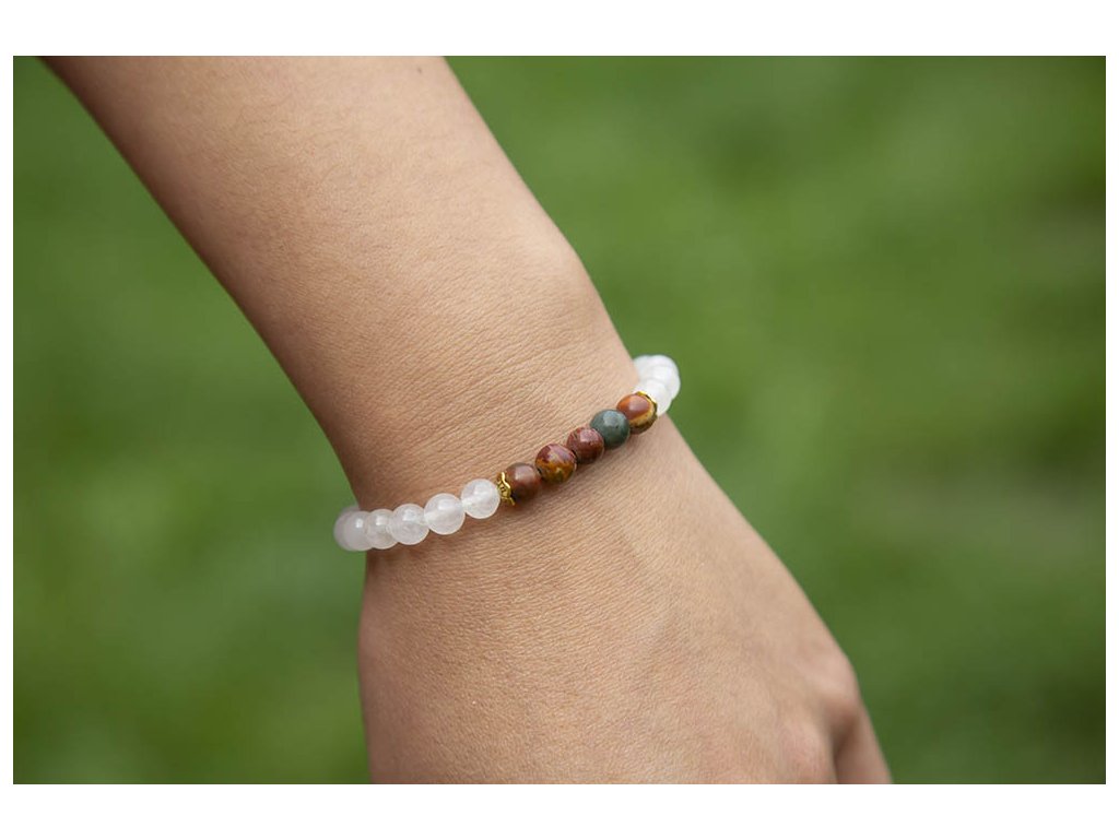 Náramek s jaspisem a jadeitem Jemný náramek s jaspisem a jadeitem a mosaznými komponenty. Jaspis přináší do života klid, pomáhá ve stresu, uvádí do rovnováhy duševní i tělesnou stránku. Umožňuje dosahování cílů, tím že podporuje pronikavost vhledu na podstatu problému. Zvyšuje organizační schopnosti a schopnost dělat rychlá a správná rozhodnutí. Chrání před negativní energií. Je výborným pomocníkem v pracovním i soukromém životě. Jadeit je ochranný kámen, jenž vnáší do života harmonii. Je symbolem klidu a míru. Přitahuje štěstí, přátelství a peníze. Chrání nás před neštěstím a nehodami. Uklidňuje mysl a pozvedává moudrost ducha. Je skvělý při obchodních jednáních. Podporuje kouzlo osobnosti, empatii, neúnavnost a usnadňuje mezilidskou komunikaci. Stimuluje k práci, podporuje realizaci nápadů, sebevědomí, sebejistotu, sebedůvěru a samostatnost. Na cestách chrání před nemocemi. Prodlužuje život. Obvod náramku: S (14-16 cm)Doplňkové parametry
