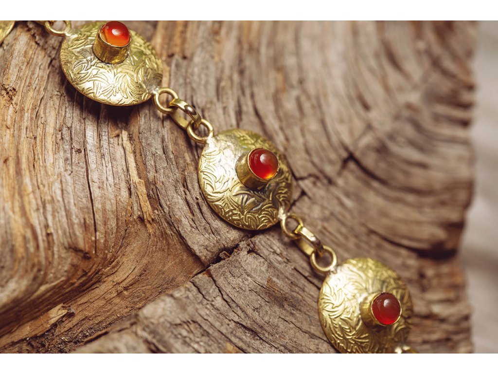 Náramek s karneolem Překrásný mosazný náramek s karneolem připomíná antický šperk. Karneol je plný životní síly a jeho energetická hodnota podněcuje tvořivost a sebedůvěru. Podporuje obnovení vitality, motivace a koncentrace, Povzbuzuje sexualitu. Chrání před závistí a záští. Zmírňuje žárlivost a dodává odvahu v těžkých životních volbách a situacích. Podněcuje k pozitivnímu pohledu na svět. Je skvělý na pracoviště. Přináší štěstí, prosperitu, podporuje analytické myšlení a zmírňuje tlak, který na vás vytváří kolegové či šéf. Je talismanem pro úspěch. Pomáhá odstranit strach ze smrti. Délka je nastavitelná.Doplňkové parametry