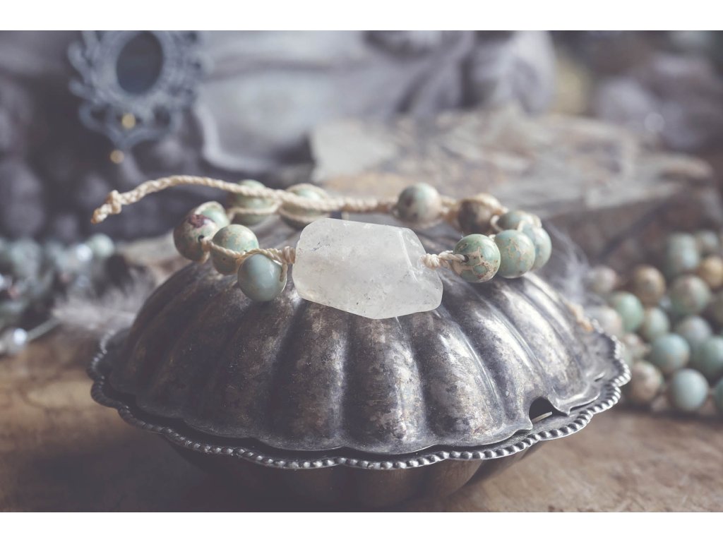 Náramek s křišťálem Velký kus křišťálu a 10mm jaspisové korálky z mořského sedimentu, vše na světlém macramé ,to je tento jedinečný náramek určený pro muže silného zápěstí. Jaspis přináší do života klid, pomáhá ve stresu, uvádí do rovnováhy duševní i tělesnou stránku. Umožňuje dosahování cílů, tím že podporuje pronikavost vhledu na podstatu problému. Zvyšuje organizační schopnosti a schopnost dělat rychlá a správná rozhodnutí. Chrání před negativní energií. Je výborným pomocníkem v pracovním i soukromém životě. Křišťál je jedinečný kámen, který uvádí energii svého nositele do harmonie, zesiluje jí a tím povzbuzuje psychiku, jasnozřivost a samostatnost a sebezdokonalení. Ochraňuje před zlými a negativními silami. Harmonizuje, čistí a chrání auru a tím zajišťuje klidný spánek. Je vhodný pro meditace a magické účely. Velikost nastavitelná pomocí macramé zámečkuDoplňkové parametry