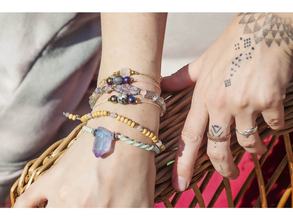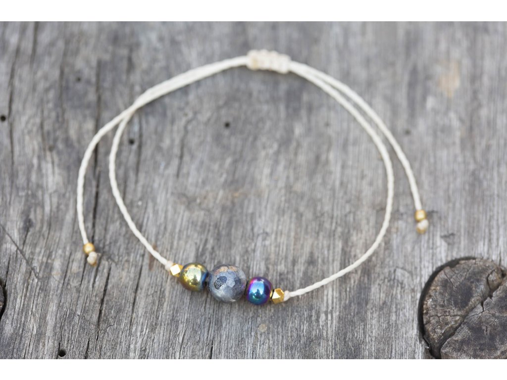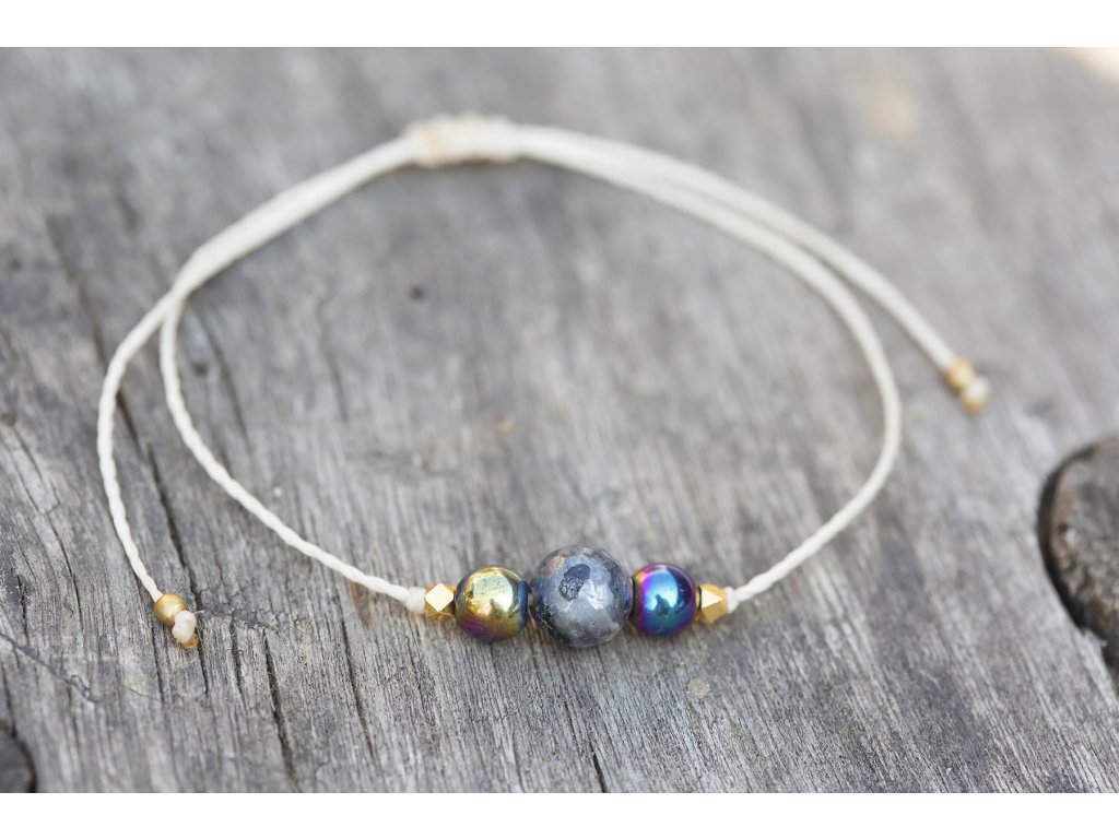 Náramek s labradoritem a hematity Jemný náramek bílá macramé šňůrka s fasetovaným labradoritem a pokovenými hematity s macramé zámečkem, kterým nastavíte snadno velikost náramku. Hematit je zvláště účinný při uzemnění a jako ochranný kámen. Uvádí do rovnováhy tělo, mysl i ducha. Nese v sobě silný element jang a zajišťuje rovnováhu meridiánů, čímž napravuje nevyváženost prvku jin. O hematitu se píše, že působí zvlášť blahodárně v situacích spojených s právem a zákony. Silně působí také v duševní rovině. Pomáhá plachým osobám zvyšovat sebevědomí a podporuje schopnost přežít. Dodává větší vůli k životu a rozvíjí spolehlivost. Zvyšuje rovněž důvěryhodnost. Tento kámen odstraňuje omezení, která si jeho majitel v minulosti sám stanovil, a napomáhá rozvoji osobnosti. Účinně asistuje při překonávání různých nutkání a návyků. Hematit obrací pozornost k nenaplněným touhám představujícím hnací motor lidského života. Labradorit je vhodný pro bytost, která je připravená ukázat světu své skryté hlubiny. Vynáší na povrch to, co před světem ukrýváme a osvobozuje naši osobnost od starých vzorců a zábran. Odložením zábran se navrací do života spontánnost a radost. Je to také ochranný kámen šamanů a mágů, aby nesešli z cesty při propojování různých dimenzí a světů, přináší světlo, které rozjasňuje tuto cestu.Doplňkové parametry