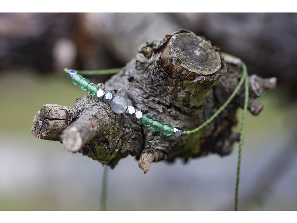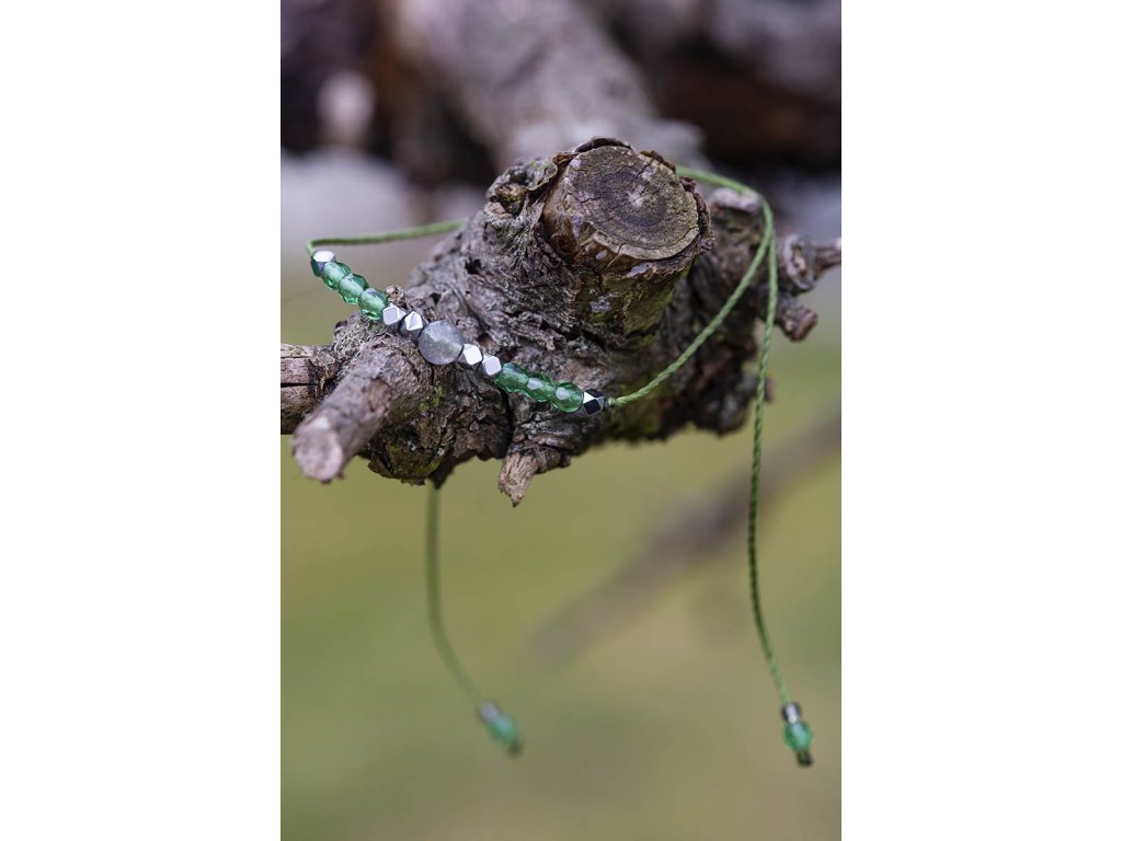 Náramek s labradoritem a hematity Krásný náramek z macramé šňůrky jarně zelené barvy s labradoritem, fasetovanými hematity a skleněnými korálky. Hematit je zvláště účinný při uzemnění a jako ochranný kámen. Uvádí do rovnováhy tělo, mysl i ducha. Nese v sobě silný element jang a zajišťuje rovnováhu meridiánů, čímž napravuje nevyváženost prvku jin. O hematitu se píše, že působí zvlášť blahodárně v situacích spojených s právem a zákony. Silně působí také v duševní rovině. Pomáhá plachým osobám zvyšovat sebevědomí a podporuje schopnost přežít. Dodává větší vůli k životu a rozvíjí spolehlivost. Zvyšuje rovněž důvěryhodnost. Tento kámen odstraňuje omezení, která si jeho majitel v minulosti sám stanovil, a napomáhá rozvoji osobnosti. Účinně asistuje při překonávání různých nutkání a návyků. Hematit obrací pozornost k nenaplněným touhám představujícím hnací motor lidského života. Labradorit je vhodný pro bytost, která je připravená ukázat světu své skryté hlubiny. Vynáší na povrch to, co před světem ukrýváme a osvobozuje naši osobnost od starých vzorců a zábran. Odložením zábran se navrací do života spontánnost a radost. Je to také ochranný kámen šamanů a mágů, aby nesešli z cesty při propojování různých dimenzí a světů, přináší světlo, které rozjasňuje tuto cestu. Velikost nastavitelná pomocí macramé zámečku.Doplňkové parametry
