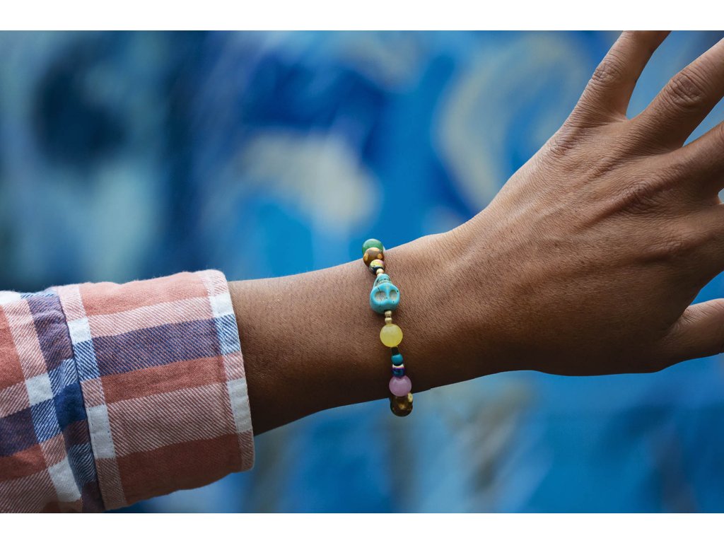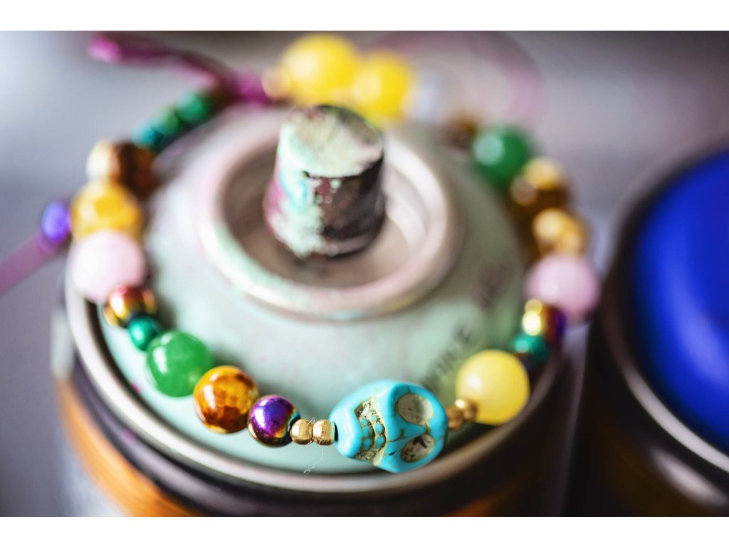 Náramek s lebkou pro něj Tento náramek, který je krásným dárkem i pro muže, je složen z mnoha drahokamů. Vévodí mu tyrkysová lebka a dále zde najdeme zelený jadeit, ohnivý achát, třešňový jaspis, dračí achát, žlutý tibetský jadeit, pokovené hematitové korálky více druhů a drobné tyrkysy. Achát podporuje vnitřní stabilitu, vyrovnanost a zralost, pocit bezpečí a sebevědomí. Usnadňuje třídění myšlenek, napomáhá při řešení komplikovaných úkolů. Ve vztazích podporuje věrnost a chápavost. Upevňuje rodinná a přátelská pouta. Hematit je zvláště účinný při uzemnění a jako ochranný kámen. Uvádí do rovnováhy tělo, mysl i ducha. Nese v sobě silný element jang a zajišťuje rovnováhu meridiánů, čímž napravuje nevyváženost prvku jin. O hematitu se píše, že působí zvlášť blahodárně v situacích spojených s právem a zákony. Silně působí také v duševní rovině. Pomáhá plachým osobám zvyšovat sebevědomí a podporuje schopnost přežít. Dodává větší vůli k životu a rozvíjí spolehlivost. Zvyšuje rovněž důvěryhodnost. Tento kámen odstraňuje omezení, která si jeho majitel v minulosti sám stanovil, a napomáhá rozvoji osobnosti. Účinně asistuje při překonávání různých nutkání a návyků. Hematit obrací pozornost k nenaplněným touhám představujícím hnací motor lidského života. Jadeit je ochranný kámen, jenž vnáší do života harmonii. Je symbolem klidu a míru. Přitahuje štěstí, přátelství a peníze. Chrání nás před neštěstím a nehodami. Uklidňuje mysli a pozvedá moudrost ducha. Je skvělý při obchodních jednáních. Podporuje kouzlo osobnosti, empatii, neúnavnost a usnadňuje mezilidskou komunikaci. Stimuluje k práci, podporuje realizaci nápadů, sebevědomí, sebejistotu, sebedůvěru a samostatnost. Na cestách chrání před nebezpečím a nemocemi. Prodlužuje život. Jaspis přináší do života klid, pomáhá ve stresu, uvádí do rovnováhy duševní i tělesnou stránku. Umožňuje dosahování cílů, tím že podporuje pronikavost vhledu na podstatu problému. Zvyšuje organizační schopnosti a schopnost dělat rychlá a správná rozhodnutí. Chrání před negativní energií. Je výborným pomocníkem v pracovním i soukromém životě. Tyrkys slouží jeho nositeli k tříbení a vyjadřování vlastních myšlenek, zesiluje intuici, vyrovnanost, podporuje úspěch. Také chrání auru a pohlcuje škodlivé vlivy a zahání zlé sny. Posiluje pozitivní energii. Ve vztahové rovině přináší štěstí a klid. Velikost je nastavitelná pomocí macramé zámečku. Další šperky vhodné pro vaše drahé muže nejdete zde.Doplňkové parametry