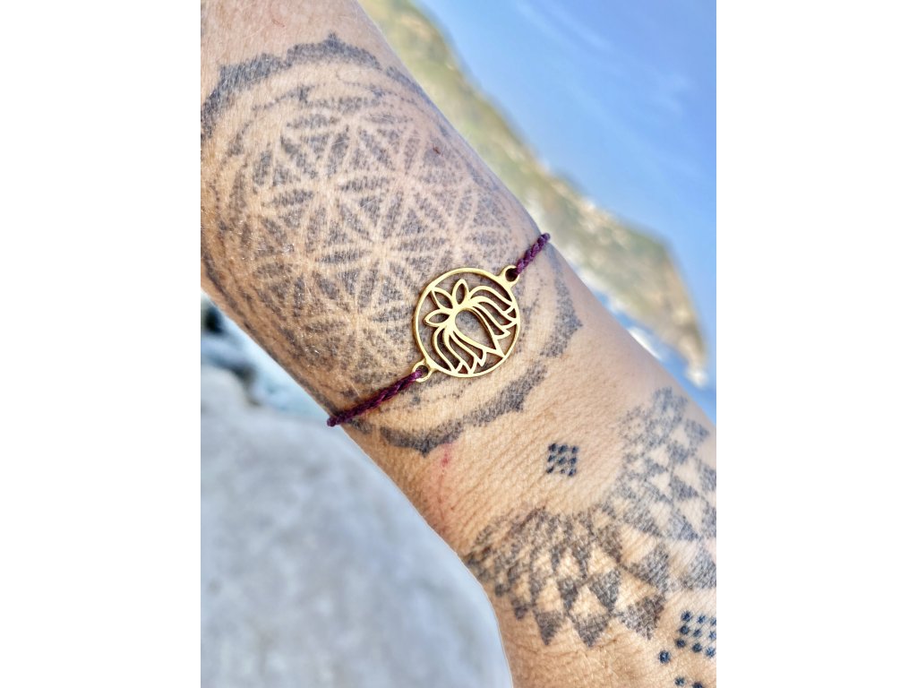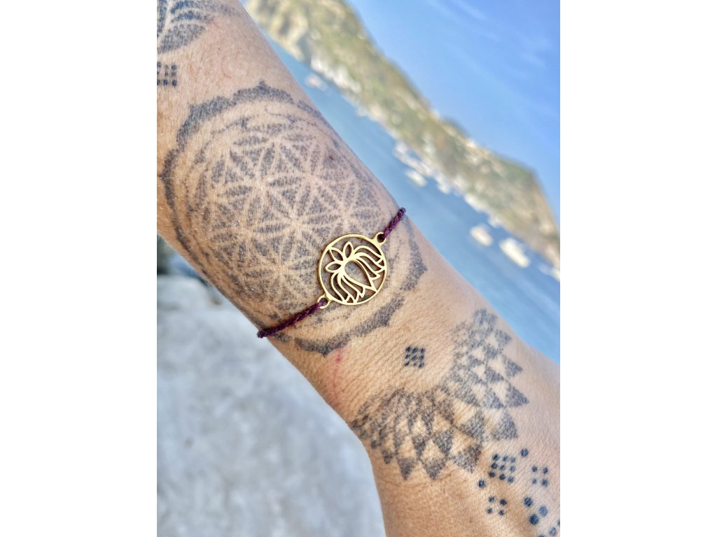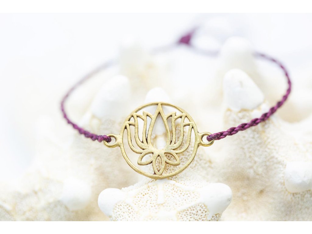 Náramek s lotosem Mosazný lotos na fialovém macramé řetízku. Jemný jogínský náramek. S lotosem se často setkáváme v prastarých kulturách různých národů. Je symbolem znovuzrození, krásy, života, štěstí, čistoty a duchovnosti, jednoty mikro a makrokosmu, symbolem rovnováhy mužského a ženského počátku. Lotosový květ napomáhá zrození harmonie a lásky uvnitř nás.Doplňkové parametry