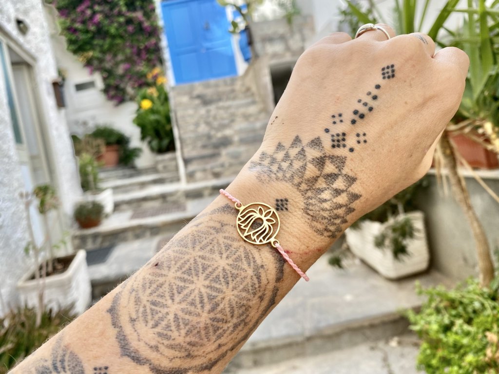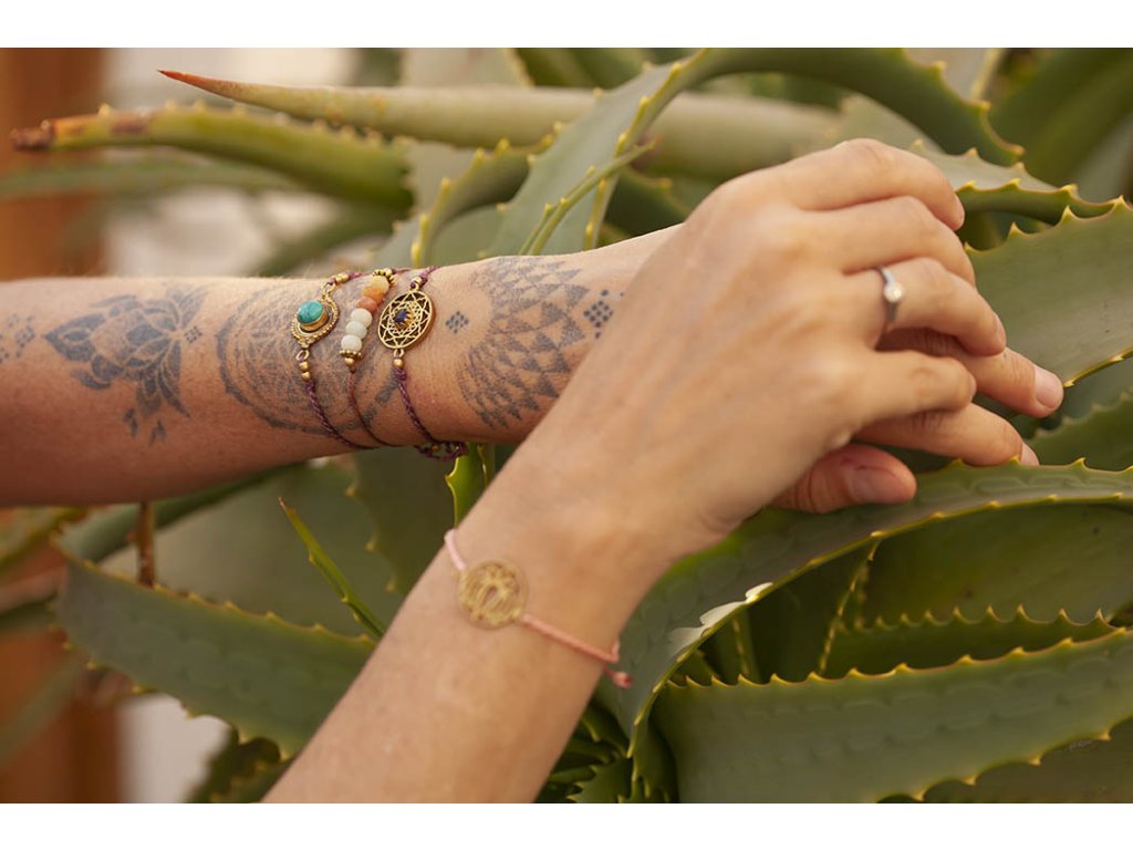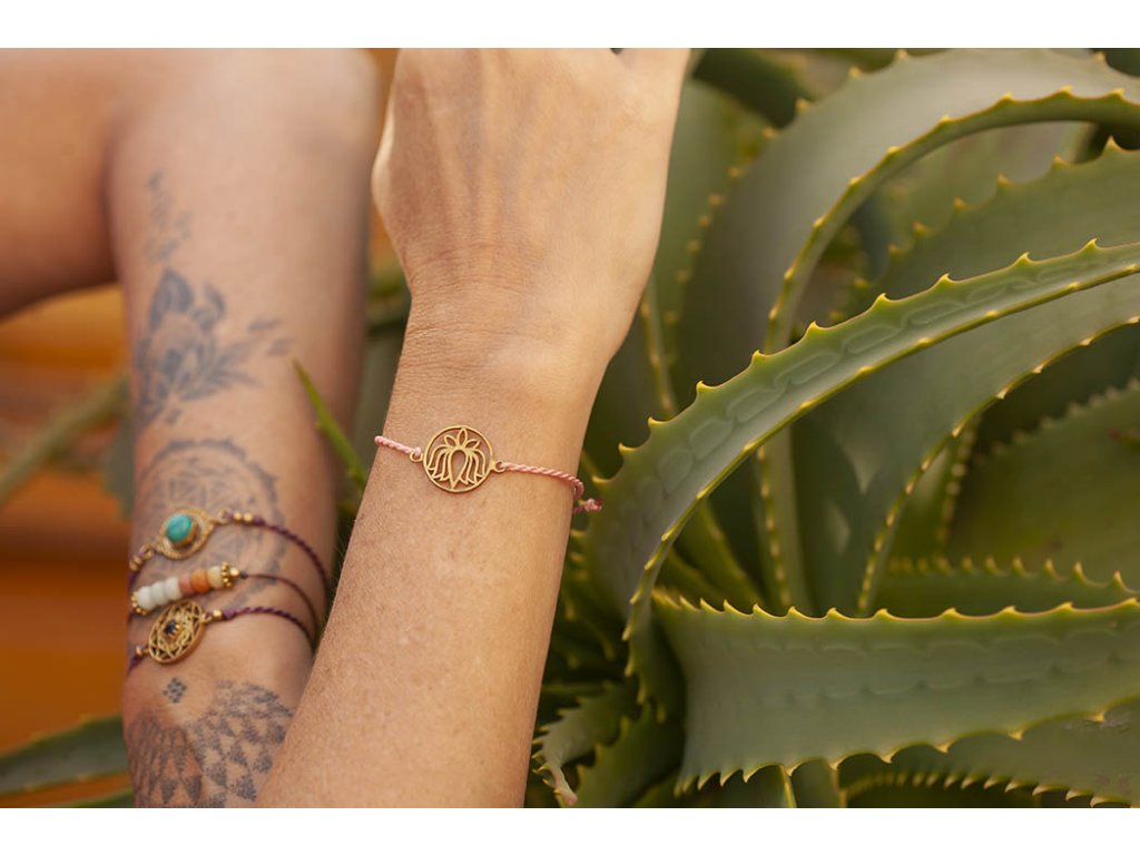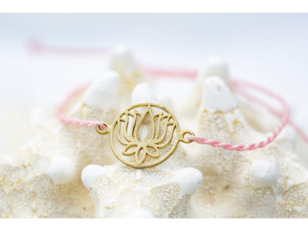 Náramek s lotosem Náramek s lotosovým květem na růžové macramé šňůrce ve tvaru dvoušroubovice DNA. S lotosem se často setkáváme v prastarých kulturách různých národů. Je symbolem znovuzrození, krásy, života, štěstí, čistoty a duchovnosti, jednoty mikro a makrokosmu, symbolem rovnováhy mužského a ženského počátku. Lotosový květ napomáhá zrození harmonie a lásky uvnitř nás. Velikost nastavitelná pomocí macramé zámečku.Doplňkové parametry