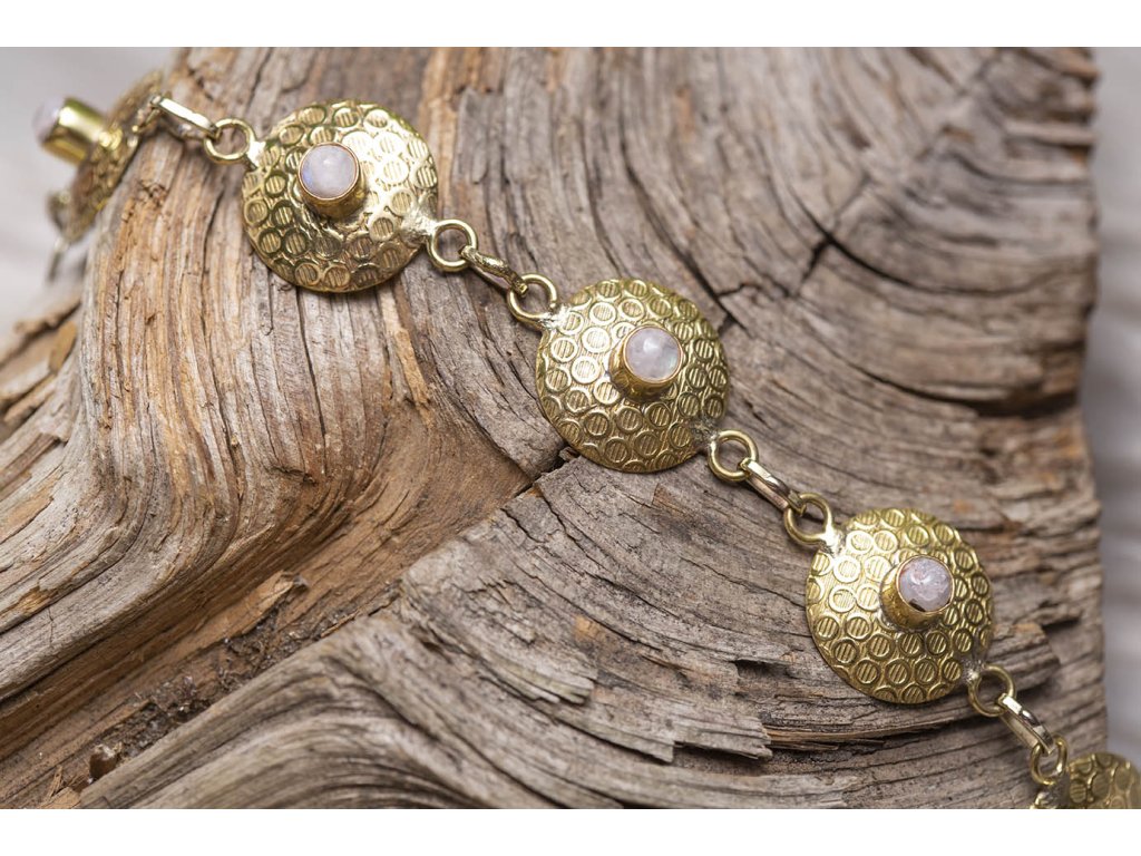 Náramek s měsíčním kamenem Překrásný mosazný náramek s měsíčním kamenem připomíná antický šperk. Měsíční kámen je uchvacující drahokam, který má silné magické účinky. Ochraňuje citlivé povahy a napomáhá vyrovnaným šťastným vztahům, je považován za drahokam štěstí. Stejně tak působí na intuici, tvořivost a podpoří Vás v nových začátcích. Šperk s měsíčním kamenem by neměl chybět ve šperkovnici žádné ženy. Více o měsíčním kameni se dočtete na našem blogu. Délka je nastavitelná.Doplňkové parametry