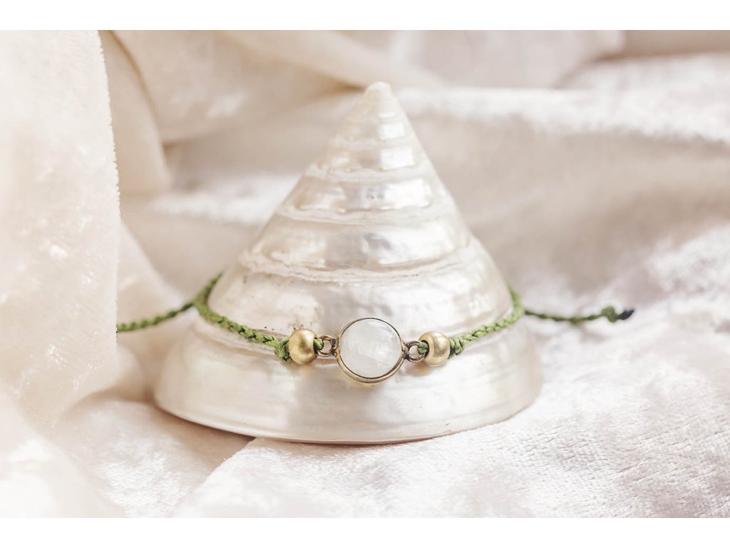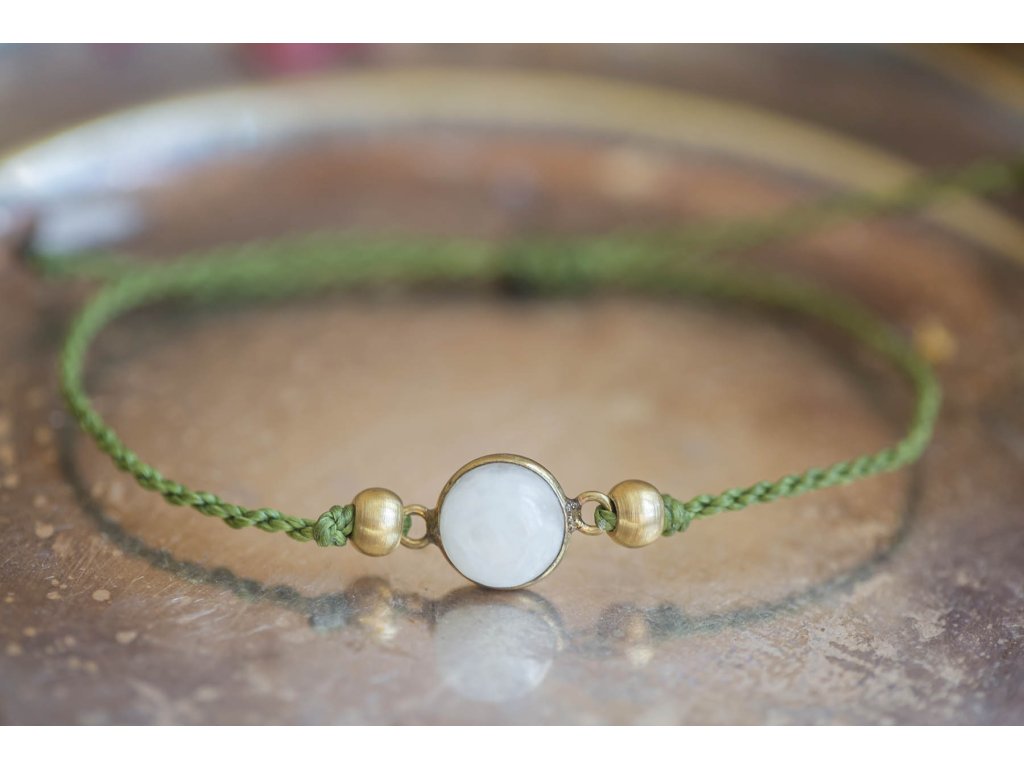 Náramek s měsíčním kamenem Náramek s bílým měsíčním kamenem zasazeným do mosazného okruží na zelené macramé šňůrce je dokonalou ozdobou na ruku lesní víly. Měsíční kámen je uchvacující drahokam, který má silné magické účinky. Ochraňuje citlivé povahy a napomáhá vyrovnaným šťastným vztahům. Je považován za drahokam štěstí. Působí pozitivně na intuici, tvořivost a podpoří Vás v nových začátcích. Šperk s měsíčním kamenem by neměl chybět ve šperkovnici žádné ženy. Více o měsíčním kameni se dočtete na našem blogu. Velikost nastavitelná pomocí macramé zámečku.Doplňkové parametry