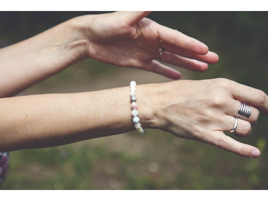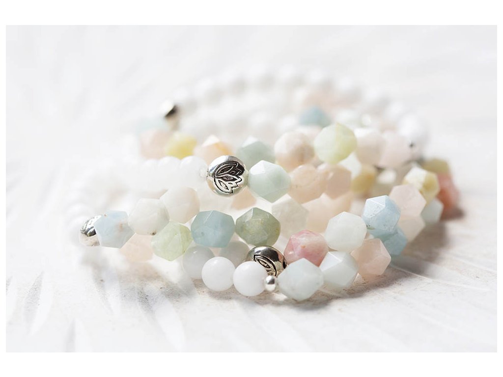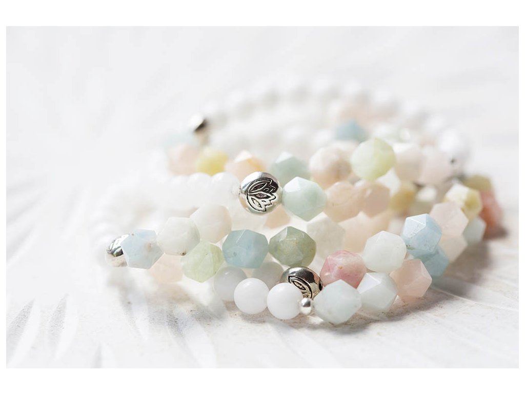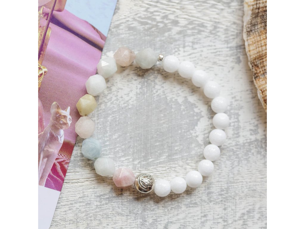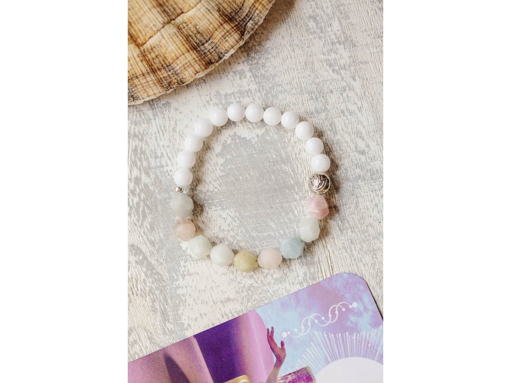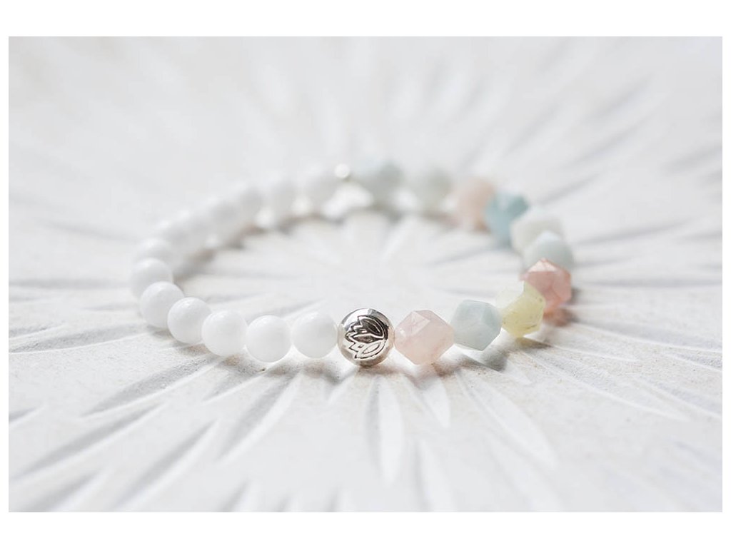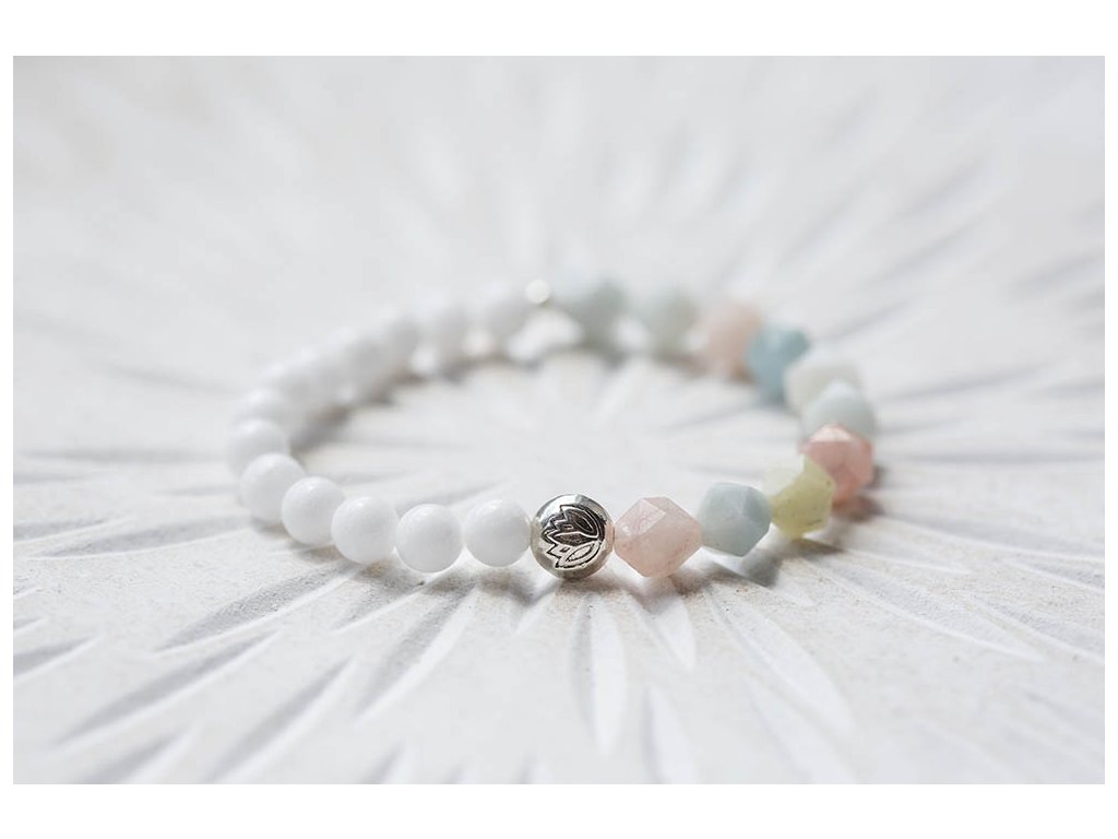 Náramek s morganitem Jemný krásný náramek s fasetovaným morganitem, bílým jadeitem a lotosem. Mogranit uklidňuje, posiluje radost a vnitřní sílu. Je kamenem lásky a soucitu. Zvyšuje sebedůvěru a stabilizuje emoce, zahání stres. Mírní vztek a zlost. Zlepšuje komunikaci a vyjadřování. Podporuje náš potenciál. Posiluje moudrost, otevřenost a sympatie. Pomáhá překonávat rozchody a komplikované vztahy. Podporuje boj proti lenivosti. Jadeit je ochranný kámen, jenž vnáší do života harmonii. Je symbolem klidu a míru. Přitahuje štěstí, přátelství a peníze. Chrání nás před neštěstím a nehodami. Uklidňuje mysl a pozvedává moudrost ducha. Je skvělý při obchodních jednáních. Podporuje kouzlo osobnosti, empatii, neúnavnost a usnadňuje mezilidskou komunikaci. Stimuluje k práci, podporuje realizaci nápadů, sebevědomí, sebejistotu, sebedůvěru a samostatnost. Na cestách chrání před nemocemi. Prodlužuje život. S lotosem se často setkáváme v prastarých kulturách různých národů. Je symbolem znovuzrození, krásy, života, štěstí, čistoty a duchovnosti, jednoty mikro a makrokosmu, symbolem rovnováhy mužského a ženského počátku. Lotosový květ napomáhá zrození harmonie a lásky uvnitř nás. Velikost náramku S (obvod 14 - 16 cm)Doplňkové parametry
