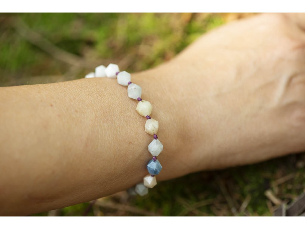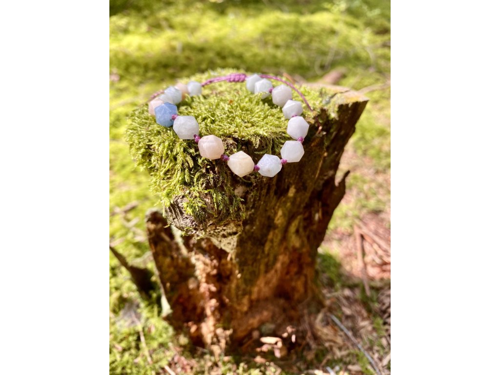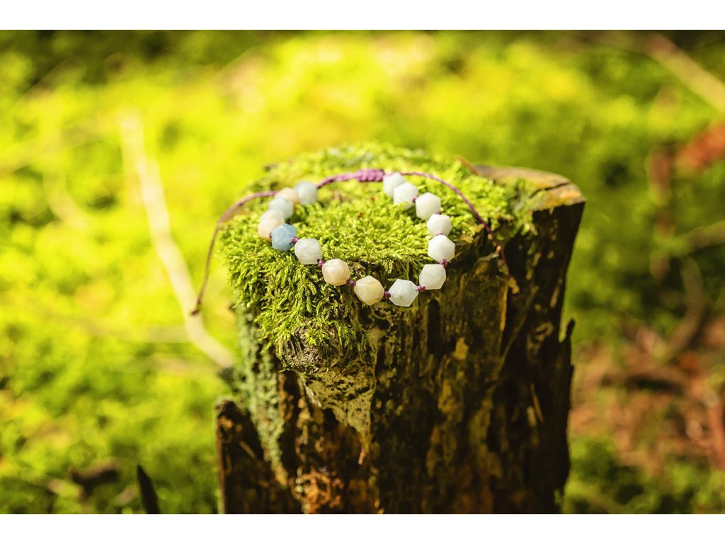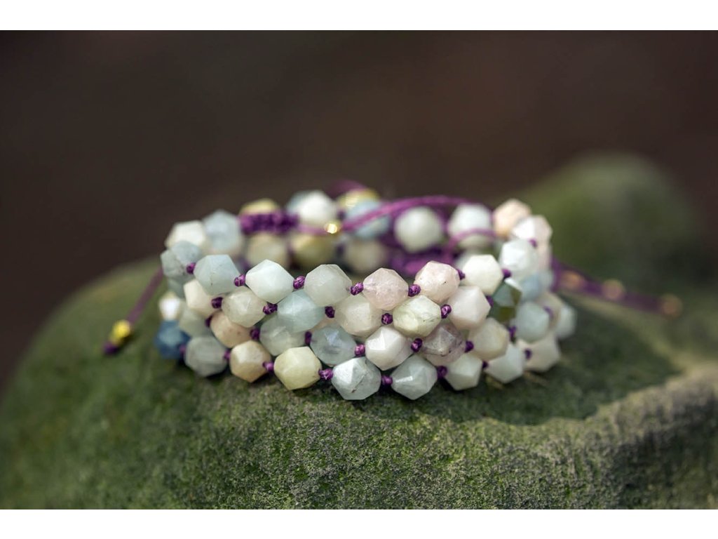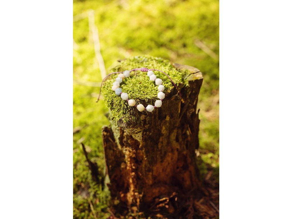 Náramek s morganity Morganitový náramek na fialové šňůrce. Morganit uklidňuje, posiluje radost a vnitřní sílu. Je kamenem lásky a soucitu. Zvyšuje sebedůvěru a stabilizuje emoce, zahání stres. Mírní vztek a zlost. Zlepšuje komunikaci a vyjadřování. Podporuje náš potenciál. Posiluje moudrost, otevřenost a sympatie. Pomáhá překonávat rozchody a komplikované vztahy. Podporuje boj proti lenivosti. Velikost nastavitelná pomocí macramé zámečku.Doplňkové parametry