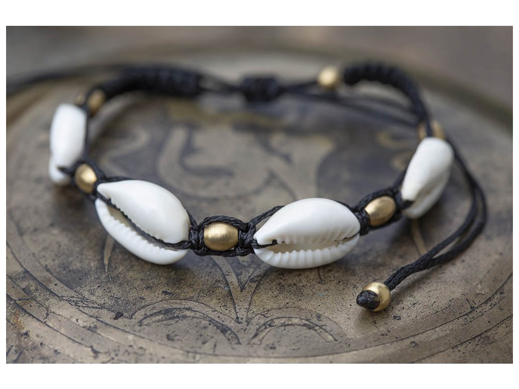 Náramek s mušlemi černý Náramek macramé s mušlemi a mosaznými korálky. Délka nastavitelná.