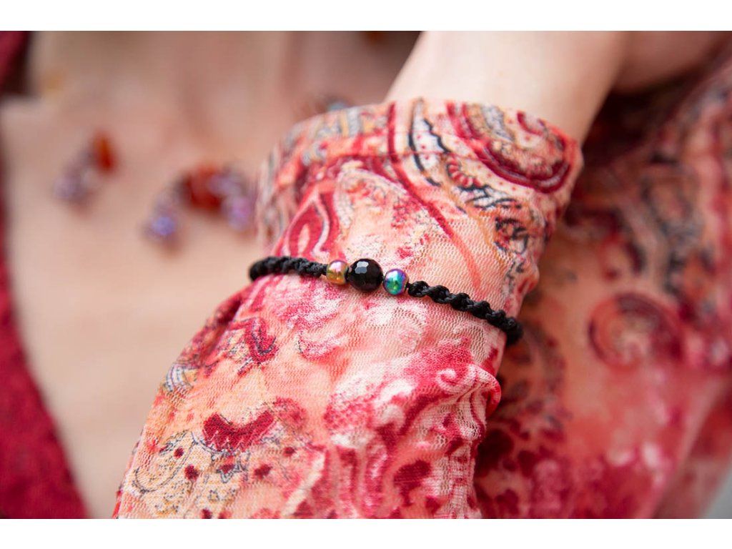 Náramek s obsidiánem a hematity Náramek s obsidiánem a hematity je vyroben technikou macramé a jeho ústřední kamínek je černočerný blýskavý fazetovaný obsidián. Jeho dva společníci jsou hematity s pokovenou temně duhovou úpravou. Šroubovice DNA je vyrobena z černého macramé provázku z Indie a je zakončena zámečkem, který umožňuje náramek nastavit na libovonou velikost. Na koncích šňůrek jsou dva malé mosazné korálky dekorované proužkováním a ty jsou rovněž z Indie. Náramek je pro své tajemně měkké a jemně temné vyzařování krásným doplňkem emo či fairycore stylu.Doplňkové parametry