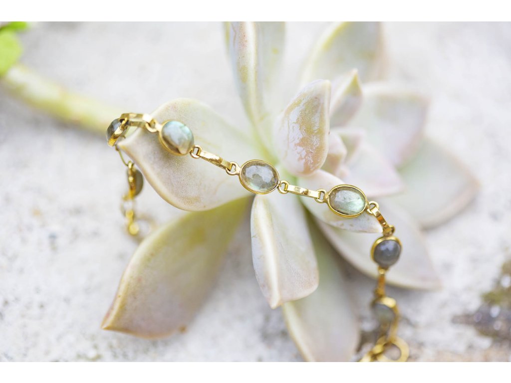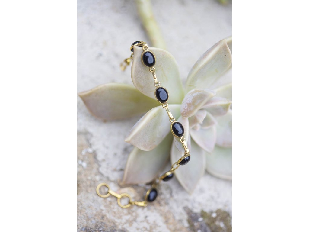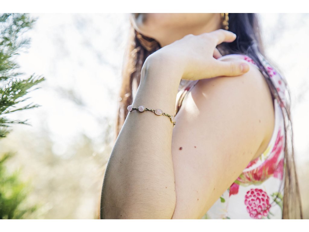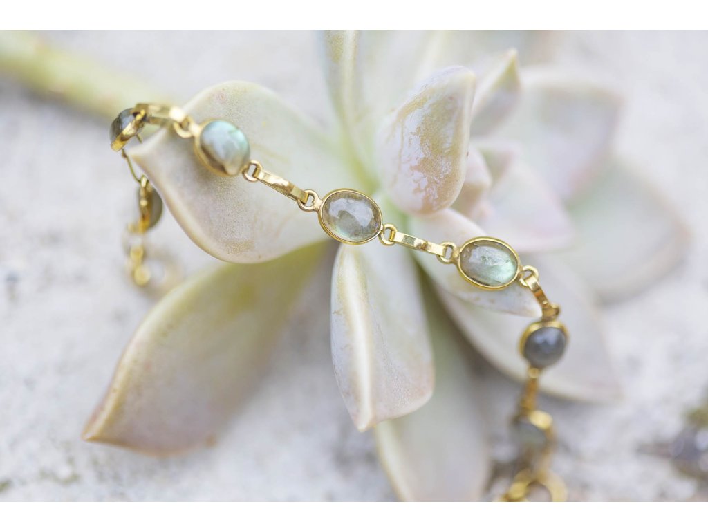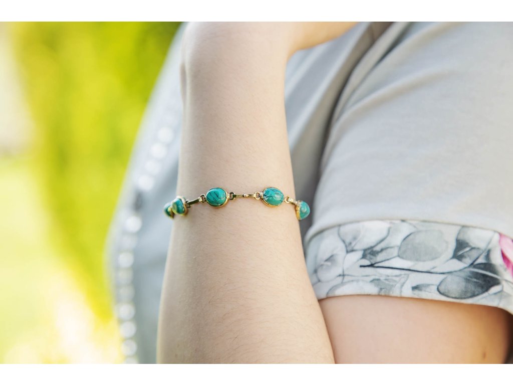 Náramek s oválnými drahokamy Jemný elegantní náramek z mosazi se sedmi oválnými drahokamy je přesně tou krásnou ozdobou, která chybí vašemu zápěstí. Na výběr máme zelenošedý labradorit, bílý měsíční kámen, světle růžový průsvitný růženín, zelený tyrkys, zelený onyx, černý onyx a hnědožluté tygří oko. Labradorit je vhodný pro bytost, která je připravená ukázat světu své skryté hlubiny. Vynáší na povrch to, co před světem ukrýváme a osvobozuje naši osobnost od starých vzorců a zábran. Odložením zábran se navrací do života spontánnost a radost. Je to také ochranný kámen šamanů a mágů, aby nesešli z cesty při propojování různých dimenzí a světů, přináší světlo, které rozjasňuje tuto cestu. Měsíční kámen je uchvacující drahokam, který má silné magické účinky. Ochraňuje citlivé povahy a napomáhá vyrovnaným šťastným vztahům. Je považován za drahokam štěstí. Působí pozitivně na intuici, tvořivost a podpoří Vás v nových začátcích. Šperk s měsíčním kamenem by neměl chybět ve šperkovnici žádné ženy. Více o měsíčním kameni se dočtete na našem blogu. Onyx je ochranný kámen, který odráží negativitu vědomě namířenou proti vám. Chrání život, dodává sílu, pomáhá v těžkých obdobích, při mimořádném fyzickém a citovém vypětí. Zaměřuje energii jedním směrem, přináší ráznost a vytrvalost, dovoluje svému nositeli stát se pánem svého osudu. Poskytuje poučení z minulosti, zvyšuje sebedůvěru a sebekontrolu, léčí stará traumata ovlivňující současný život a snižuje strach a obavy. Udržuje v těle rovnováhu energií jin a jang. Růženín je kámen lásky. Pomáhá projevovat city, dodává lásku a krásu, podporuje něžnost, mírnost, přátelskost a nesobeckost. Podněcuje citlivost a vnímavost vůči ostatním i sobě samému, podporuje fantazii, inspiraci a tvořivost a trpělivost. Dává sílu k odpuštění, učí sebeúctě a sebelásce. Tygří oko je ochranný kámen, která se používá jako talisman před všemi formami nebezpečí. Propojuje sluneční a zemskou energii a tím pomáhá uzemnit lidi, kteří ztratili spojení s realitou a zároveň podporuje duchovní růst těch materialisticky zaměřených. Je to hřejivý kámen, podporuje to energie v těle a dodává sílu, přitahuje peníze a prosperitu. Pomáhá s odbouráním závislostí na druhých uznáním vlastní hodnoty. Mírní deprese. Tyrkys slouží jeho nositeli k tříbení a vyjadřování vlastních myšlenek, zesiluje intuici, vyrovnanost, podporuje úspěch. Také chrání auru a pohlcuje škodlivé vlivy a zahání zlé sny. Posiluje pozitivní energii. Ve vztahové rovině přináší štěstí a klid. Maximální délka cca 20 cm. Náramek lze mírně zkrátit.Buďte první, kdo napíše příspěvek k této položce.
