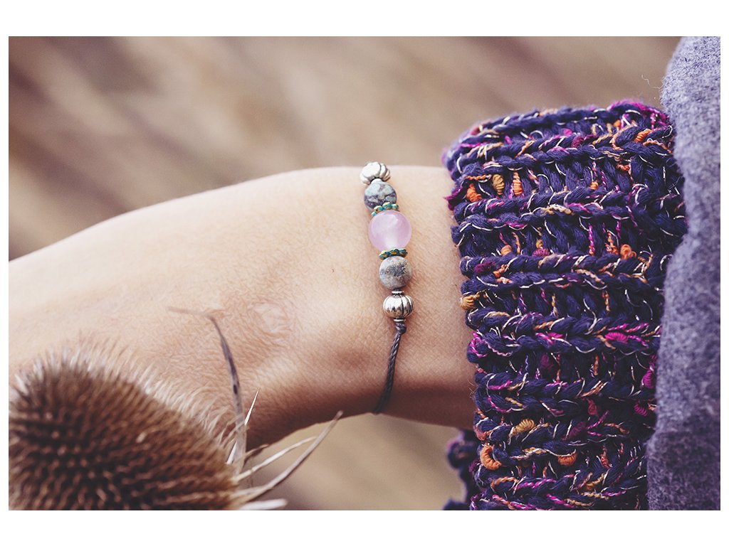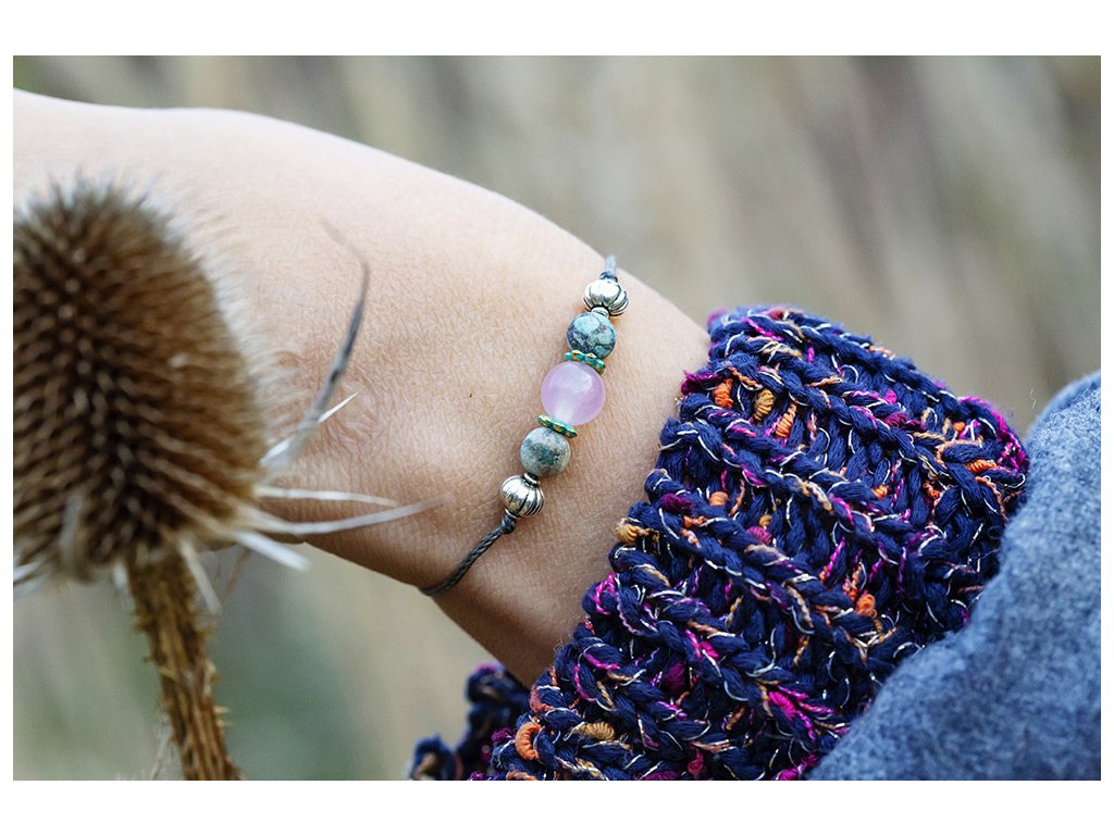 Náramek s růženínem a tyrkysy Jemný náramek růženín s africkými tyrkysy a kovovými korálky na khaki macramé šňůrce. Tyrkys slouží jeho nositeli k tříbení a vyjadřování vlastních myšlenek, zesiluje intuici, vyrovnanost, podporuje úspěch. Také chrání auru a pohlcuje škodlivé vlivy a zahání zlé sny. Posiluje pozitivní energii. Ve vztahové rovině přináší štěstí a klid. Růženín je kámen lásky. Pomáhá projevovat city, dodává lásku a krásu, podporuje něžnost, mírnost, přátelskost a nesobeckost. Podněcuje citlivost a vnímavost vůči ostatním i sobě samému, podporuje fantazii, inspiraci a tvořivost a trpělivost. Dává sílu k odpuštění, učí sebeúctě a sebelásce. Velikost nastavitelná pomocí macramé zámečku.Doplňkové parametry