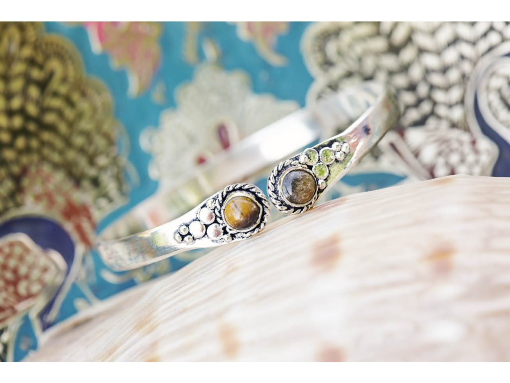 Náramek s tygřími oky Mosazný náramek potažený alpakou se dvěma tygřími oky. Tygří oko je ochranný kámen, která se používá jako talisman před všemi formami nebezpečí. Propojuje sluneční a zemskou energii a tím pomáhá uzemnit lidi, kteří ztratili spojení s realitou a zároveň podporuje duchovní růst těch materialisticky zaměřených. Je to hřejivý kámen, podporuje to energie v těle a dodává sílu, přitahuje peníze a prosperitu. Pomáhá s odbouráním závislostí na druhých uznáním vlastní hodnoty. Mírní deprese.Doplňkové parametry