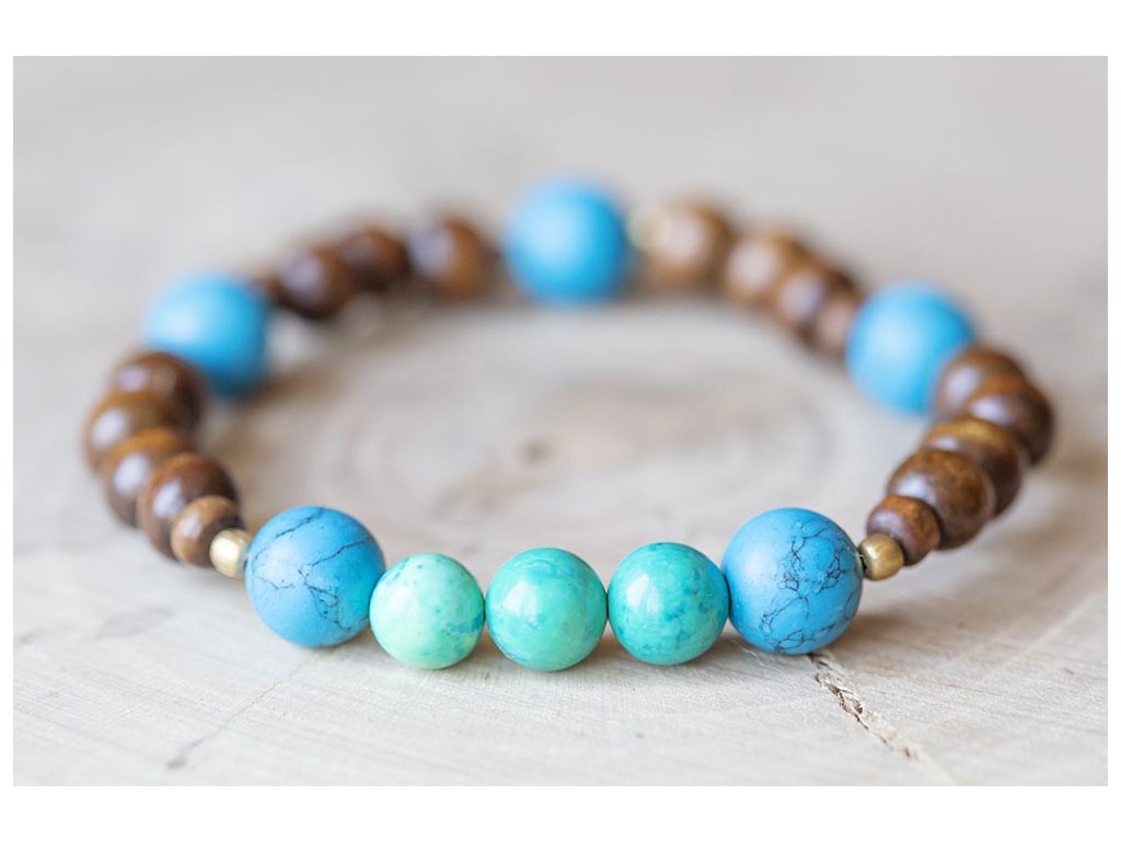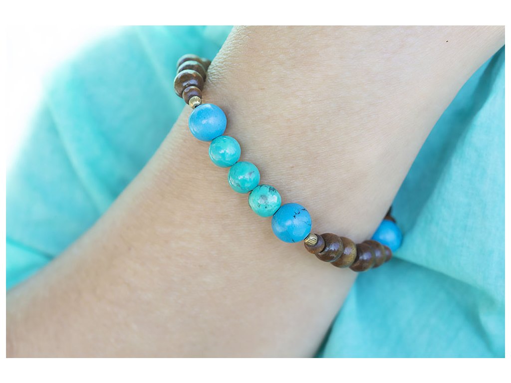 Náramek s tyrkysy Náramek sestává z dřevěných korálků a korálků z tyrkysu navlečených na pružném vlasci. Tyrkys slouží jeho nositeli k tříbení a vyjadřování vlastních myšlenek, zesiluje intuici, vyrovnanost, podporuje úspěch. Také chrání auru a pohlcuje škodlivé vlivy a zahání zlé sny. Posiluje pozitivní energii. Ve vztahové rovině přináší štěstí a klid. Obvod náramku: L (19-21 cm)Buďte první, kdo napíše příspěvek k této položce.