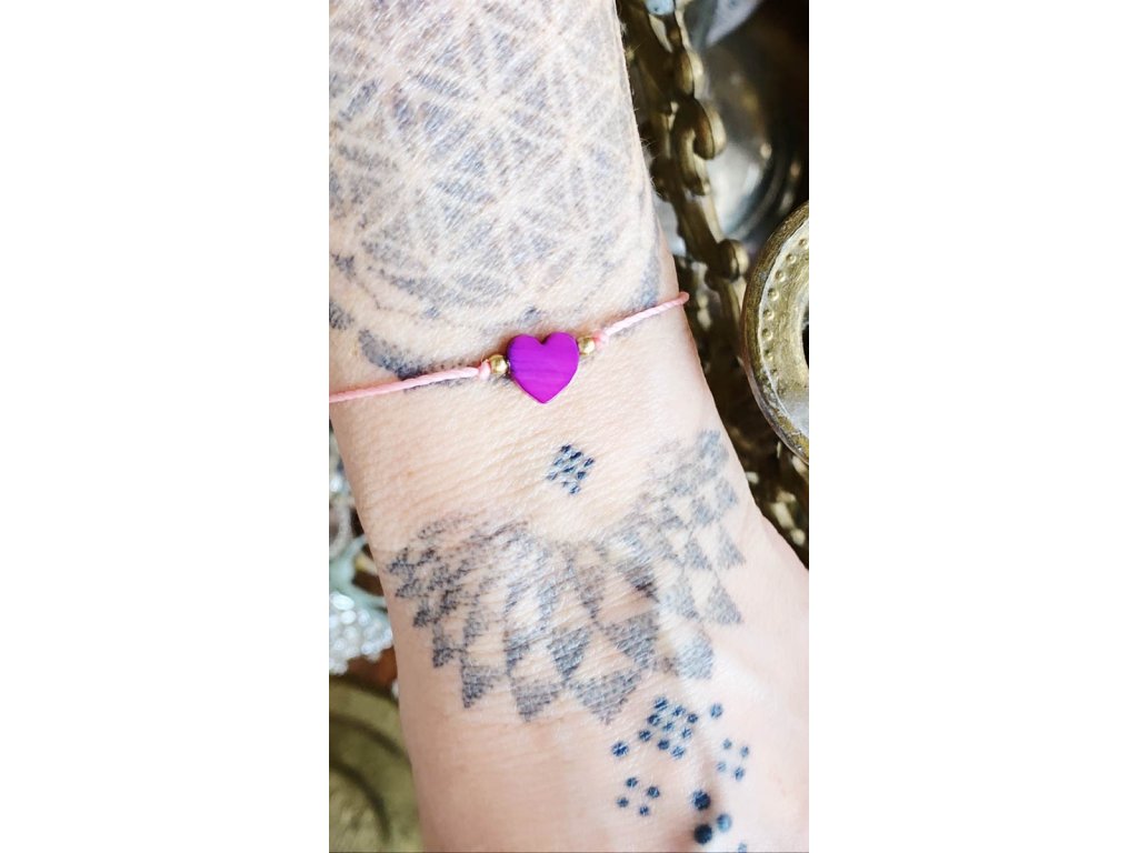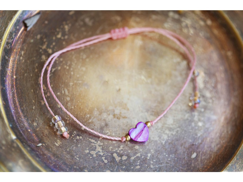 Náramek se srdíčkem Jemný náramek na růžové macramé šňůrce s perleťovým fialovým srdíčkem a mosaznými a skleněnými korálky. Velikost nastavitelné pomocí macramé zámečku.Doplňkové parametry