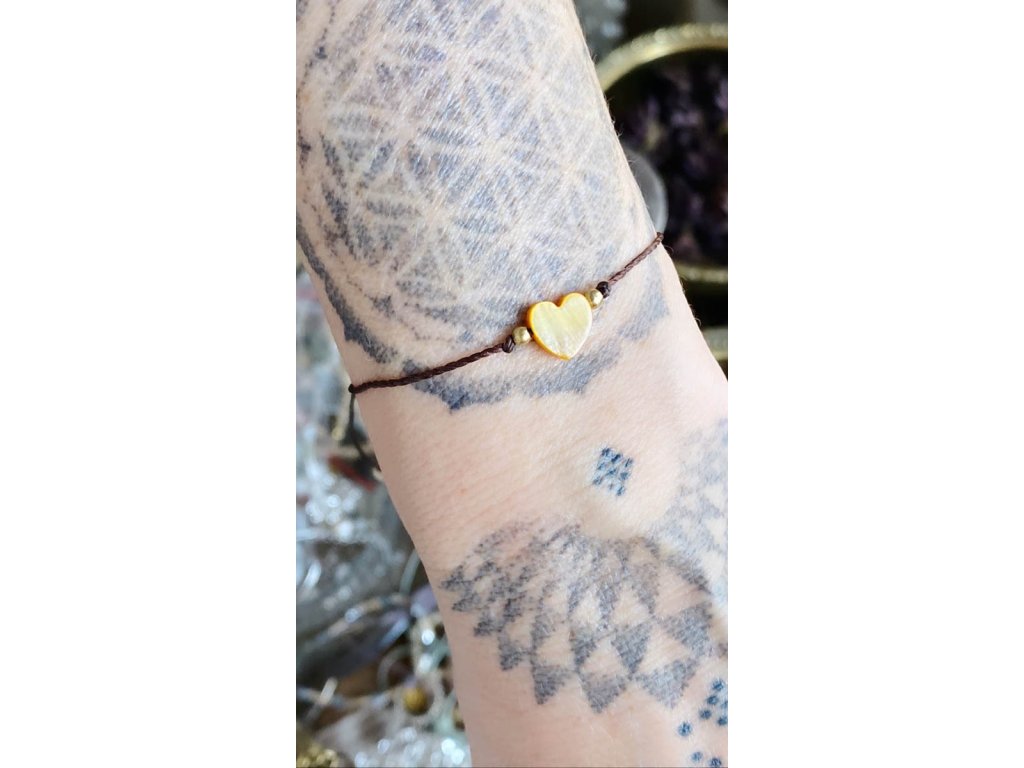 Náramek se srdíčkem Jemný náramek na tmavohnědé macramé šňůrce s perleťovým okrovým srdíčkem a mosaznými a skleněnými korálky. Velikost nastavitelné pomocí macramé zámečku.Doplňkové parametry
