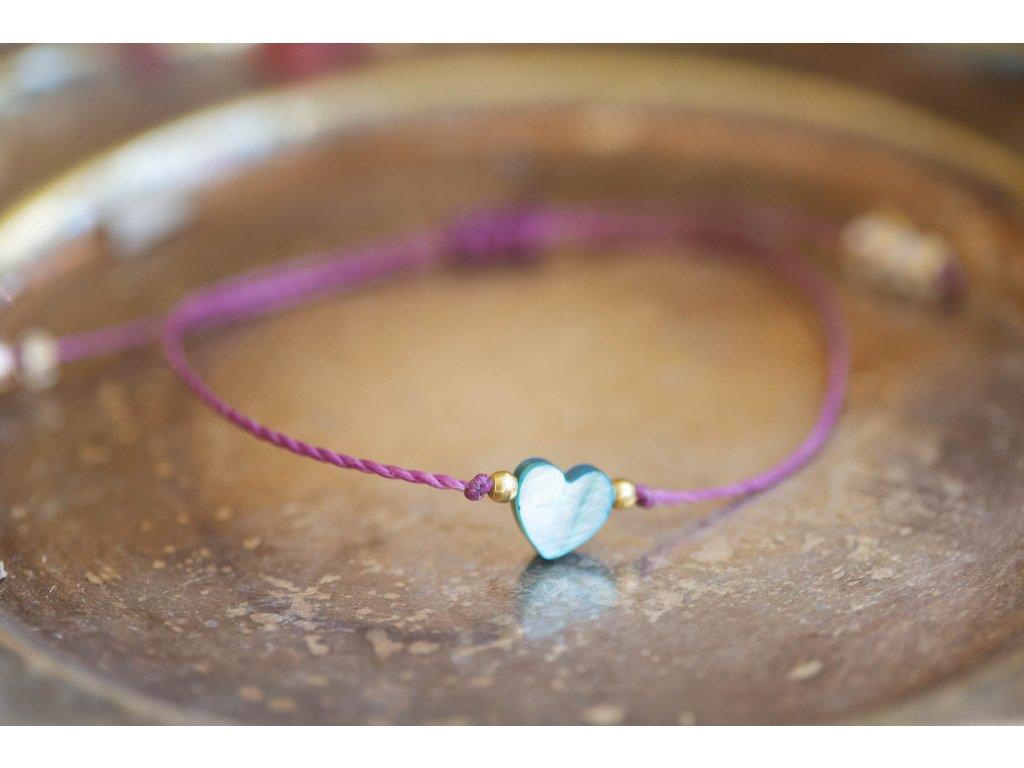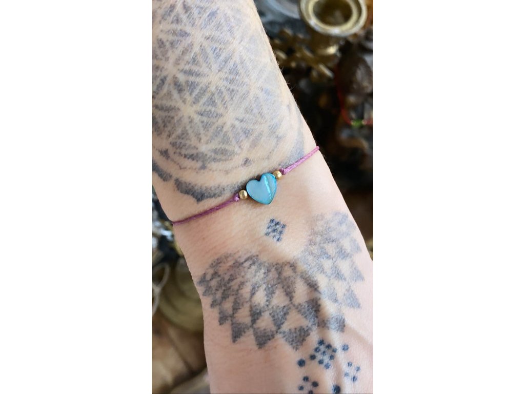 Náramek se srdíčkem Jemný náramek na fialové macramé šňůrce s perleťovým tyrkysovým srdíčkem a mosaznými a skleněnými korálky. Velikost nastavitelné pomocí macramé zámečku.Doplňkové parametry