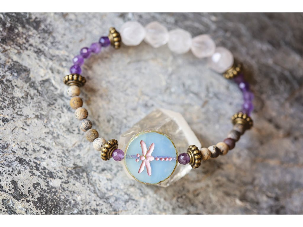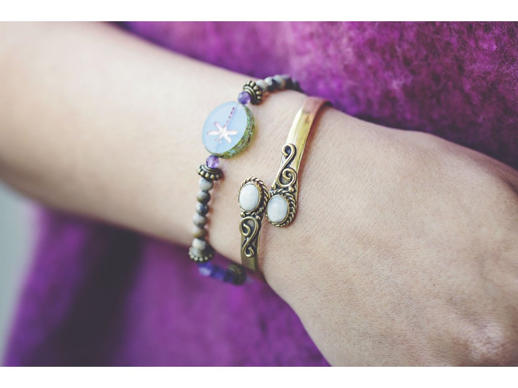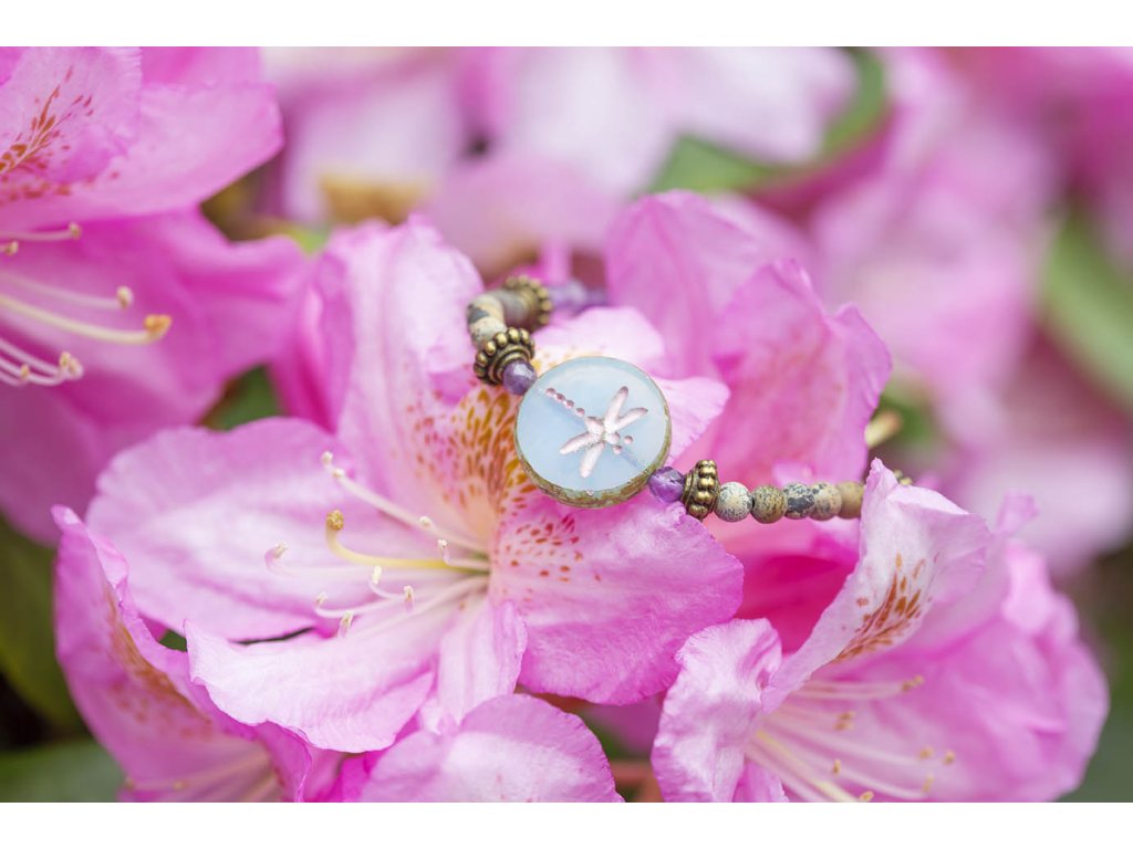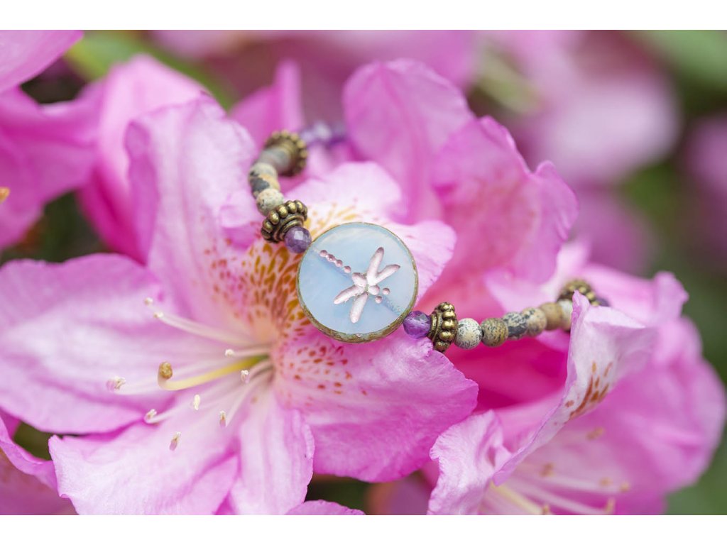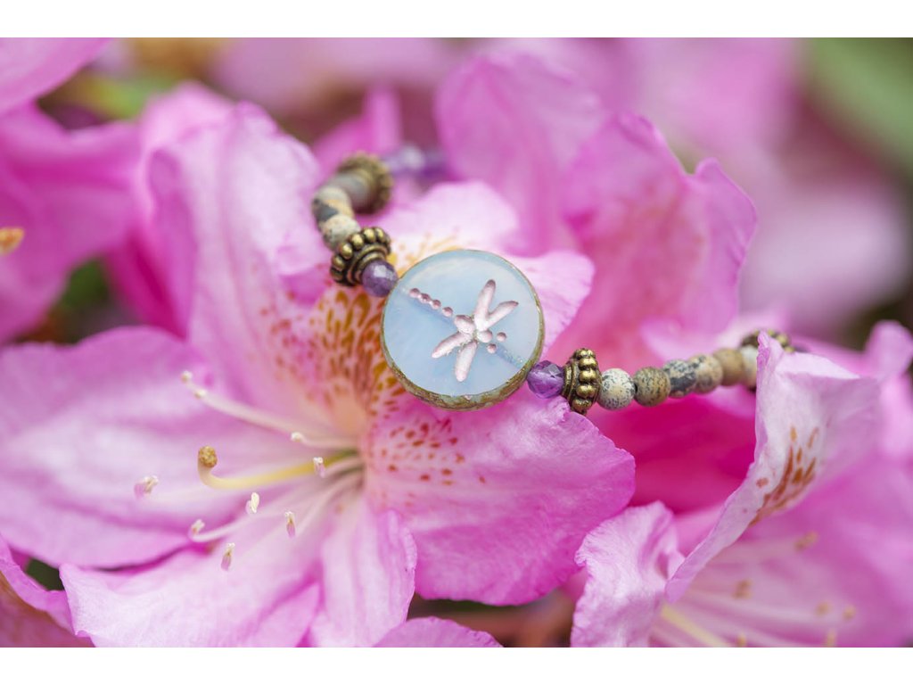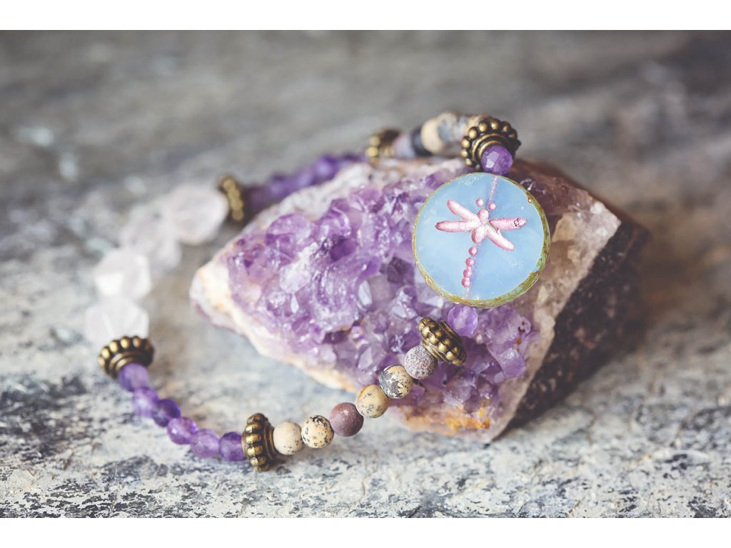 Náramek vážka a růženíny Moc hezký náramek s motivem vážky na korálku od českých sklářů. Dále obsahuje ametyst, jaspis a růženín a mosazné komponenty. Ametyst je kamenem čistoty ducha a meditace. Pomáhá nám v sobě objevovat sebeobětování, lásku, pokoru a nezištnost. Těmito vlastnostmi nám otevírá cestu do jiných dimenzí bytí. Je to kámen inspirace, směřuje naše myšlení k tvořivé práci a probouzí v nás intuici. Jaspis přináší do života klid, pomáhá ve stresu, uvádí do rovnováhy duševní i tělesnou stránku. Umožňuje dosahování cílů, tím že podporuje pronikavost vhledu na podstatu problému. Zvyšuje organizační schopnosti a schopnost dělat rychlá a správná rozhodnutí. Chrání před negativní energií. Je výborným pomocníkem v pracovním i soukromém životě. Růženín je kámen lásky. Pomáhá projevovat city, dodává lásku a krásu, podporuje něžnost, mírnost, přátelskost a nesobeckost. Podněcuje citlivost a vnímavost vůči ostatním i sobě samému, podporuje fantazii, inspiraci a tvořivost a trpělivost. Dává sílu k odpuštění, učí sebeúctě a sebelásce. Velikosti: S (obvod 14-16 cm) M (obvod 16,5-18,5 cm)Buďte první, kdo napíše příspěvek k této položce.
