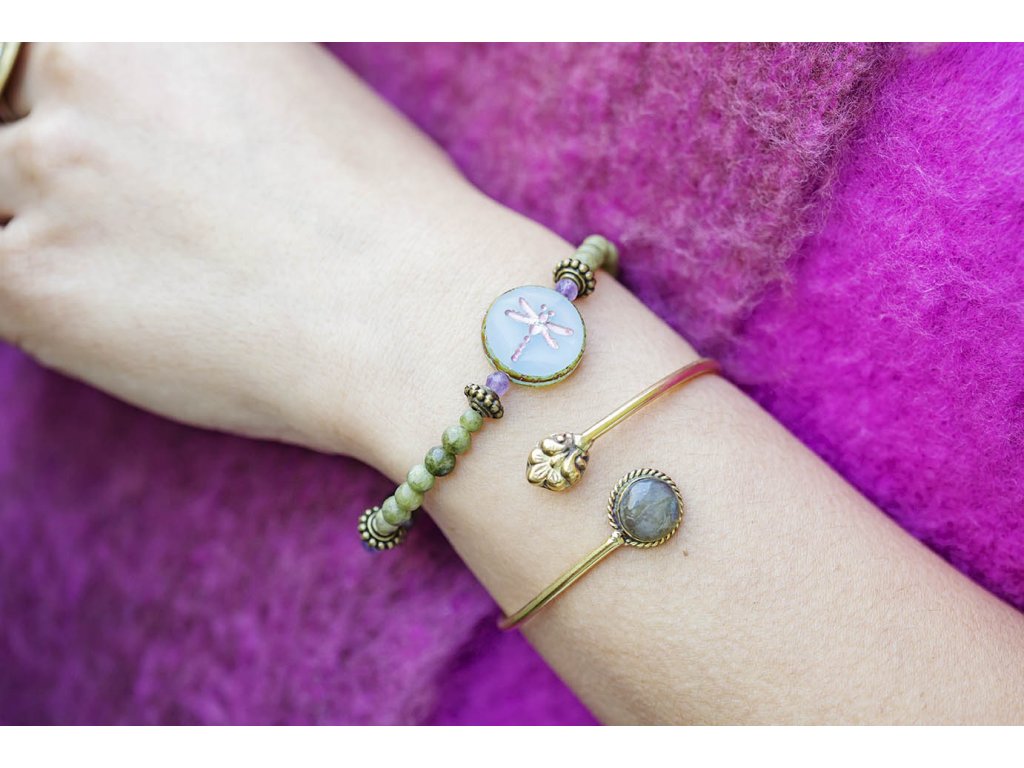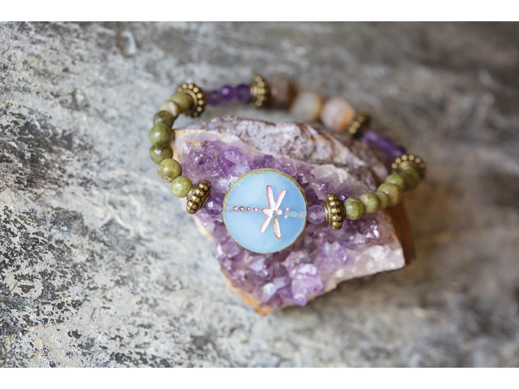 Náramek vážka Tento nevšední náramek obsahuje jadeit, fasetovaný achát, a fasetovaný ametyst. Vážka je korálek od českých sklářů. Náramek byl vyroben v naší dílně. Ametyst je kamenem čistoty ducha a meditace. Pomáhá nám v sobě objevovat sebeobětování, lásku, pokoru a nezištnost. Těmito vlastnostmi nám otevírá cestu do jiných dimenzí bytí. Je to kámen inspirace, směřuje naše myšlení k tvořivé práci a probouzí v nás intuici. Achát podporuje vnitřní stabilitu, vyrovnanost a zralost, pocit bezpečí a sebevědomí. Usnadňuje třídění myšlenek, napomáhá při řešení komplikovaných úkolů. Ve vztazích podporuje věrnost a chápavost. Upevňuje rodinná a přátelská pouta. Jadeit je ochranný kámen, jenž vnáší do života harmonii. Je symbolem klidu a míru. Přitahuje štěstí, přátelství a peníze. Chrání nás před neštěstím a nehodami. Uklidňuje mysli a pozvedá moudrost ducha. Je skvělý při obchodních jednáních. Podporuje kouzlo osobnosti, empatii, neúnavnost a usnadňuje mezilidskou komunikaci. Stimuluje k práci, podporuje realizaci nápadů, sebevědomí, sebejistotu, sebedůvěru a samostatnost. Na cestách chrání před nebezpečím a nemocemi. Prodlužuje život. Velikost: S (obvod cca 14 - 16 cm) M (obvod cca 16,5 - 18,5 cm)Buďte první, kdo napíše příspěvek k této položce.